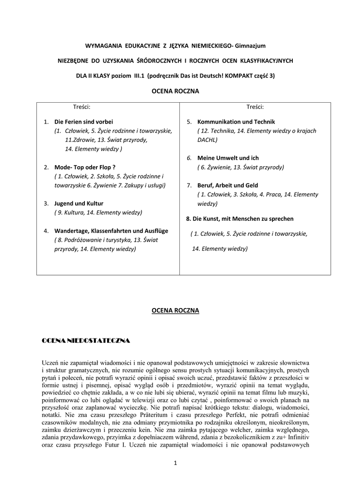 WYMAGANIA EDUKACYJNE Z JĘZYKA NIEMIECKIEGO- Gimnazjum NIEZBĘDNE DO UZYSKANIA ŚRÓDROCZNYCH I ROCZNYCH OCEN KLASYFIKACYJNYCH DLA II KLASY poziom III.1 (podręcznik Das ist Deutsch! KOMPAKT część 3) OCENA ROCZNA Treści: Treści: 1. Die Ferien sind vorbei (1. Człowiek, 5. Życie rodzinne i towarzyskie, 11.Zdrowie, 13. Świat przyrody, 14. Elementy wiedzy ) 5. Kommunikation und Technik ( 12. Technika, 14. Elementy wiedzy o krajach DACHL) 6. Meine Umwelt und ich ( 6. Żywienie, 13. Świat przyrody) 2. Mode- Top oder Flop ? ( 1. Człowiek, 2. Szkoła, 5. Życie rodzinne i towarzyskie 6. Żywienie 7. Zakupy i usługi) 7. Beruf, Arbeit und Geld ( 1. Człowiek, 3. Szkoła, 4. Praca, 14. Elementy wiedzy) 3. Jugend und Kultur ( 9. Kultura, 14. Elementy wiedzy) 8. Die Kunst, mit Menschen zu sprechen 4. Wandertage, Klassenfahrten und Ausflüge ( 8. Podróżowanie i turystyka, 13. Świat przyrody, 14. Elementy wiedzy) ( 1. Człowiek, 5. Życie rodzinne i towarzyskie, 14. Elementy wiedzy) OCENA ROCZNA OCENA NIEDOSTATECZNA Uczeń nie zapamiętał wiadomości i nie opanował podstawowych umiejętności w zakresie słownictwa i struktur gramatycznych, nie rozumie ogólnego sensu prostych sytuacji komunikacyjnych, prostych pytań i poleceń, nie potrafi wyrazić opinii i opisać swoich uczuć, przedstawić faktów z przeszłości w formie ustnej i pisemnej, opisać wygląd osób i przedmiotów, wyrazić opinii na temat wyglądu, powiedzieć co chętnie zakłada, a w co nie lubi się ubierać, wyrazić opinii na temat filmu lub muzyki, poinformować co lubi oglądać w telewizji oraz co lubi czytać , poinformować o swoich planach na przyszłość oraz zaplanować wycieczkę. Nie potrafi napisać krótkiego tekstu: dialogu, wiadomości, notatki. Nie zna czasu przeszłego Präteritum i czasu przeszłego Perfekt, nie potrafi odmieniać czasowników modalnych, nie zna odmiany przymiotnika po rodzajniku określonym, nieokreślonym, zaimku dzierżawczym i przeczeniu kein. Nie zna zaimka pytającego welcher, zaimka względnego, zdania przydawkowego, przyimka z dopełniaczem während, zdania z bezokolicznikiem z zu+ Infinitiv oraz czasu przyszłego Futur I. Uczeń nie zapamiętał wiadomości i nie opanował podstawowych 1 umiejętności w zakresie umożliwiającym kontynuację nauki języka na poziomie programowo wyższym. Nie rozumie ogólnego sensu prostych sytuacji komunikacyjnych, prostych pytań i poleceń. Nie rozumie ogólnego sensu prostych tekstów podręcznikowych i nie potrafi udzielić odpowiedzi na proste pytania do tekstu. Nie umie formułować prostych pytań i udzielać odpowiedzi na pytania. Nie potrafi zareagować słownie w sytuacjach życia codziennego omawianych na zajęciach. Wymowa uniemożliwiająca zrozumienie, brak podstawowego słownictwa i brak znajomości podstawowych struktur gramatycznych. Nie potrafi napisać krótkiego tekstu. OCENA DOPUSZCZAJĄCA Uczeń słabo zna i z trudem podaje słownictwo związane z: miejscami spędzania wakacji, sposobami spędzania czasu, z czynnościami związanymi z organizacją czasu wolnego, określaniem daty i terminów, ze zjawiskami pogodowymi, określeniami dotyczącymi ludzi i przedmiotów, częściami garderoby, określeniami dotyczącymi ubrań i wyglądu, określeniami związanymi z kinem, teatrem, filmem, muzyką, czytelnictwem, nazwami programów i kanałów telewizyjnych, podróżowaniem i zakwaterowaniem, nazwami urządzeń i ich zastosowaniem, czynnościami związanymi z obsługą i użytkowaniem urządzeń technicznych, ochroną środowiska, nazwami składników i produktów spożywczych, odżywianiem się, nazwami zawodów i czynnościami z nimi związanymi, ze szkołą jako miejscem nauki i pracy, sposobami zarabiania pieniędzy przez rówieśników, językiem ciała, nazwami krajów, ich mieszkańcami i językami, nazwami kontynentów. Uczeń słabo zna zasady odmiany czasowników: sein, haben, oraz czasowników modalnych, zasady tworzenia zdań pytających, zdań pytających w zdaniu złożonym(pytanie zależne), stosowania zaimka pytającego was für ein?, was für eine?. Uczeń popełnia liczne błędy przy odmianie czasowników sein i haben w czasie przeszłym prostym Präteritum, przy tworzeniu czasu przeszłego złożonego PERFEKT z czasownikami posiłkowymi sein i haben , przy tworzeniu trybu przypuszczającego, tworzeniu zdań czasowych: als, wenn, przy stosowaniu spójników wieloczłonowych sowohl…als auch, nicht nur… sondern auch, weder….noch, entweder…oder. Uczeń ma duże trudności z odmianą przymiotnika po rodzajniku określonym, nieokreślonym, zaimku dzierżawczym i przeczeniu kein/keine. Uczeń ma duże trudności z zastosowaniem przymiotnika z przyimkiem, rekcją czasownika, z zaimkiem osobowym nieokreślonym jemand- niemand. Uczeń popełnia liczne błędy podczas stosowania zaimka pytającego welcher, welche, welches, zaimka względnego, przyimka z dopełniaczem. Uczeń ma trudności z tworzeniem zdania z bezokolicznikiem, zdania z bezokolicznikiem z zu + Infinitiv oraz z czasem przyszłym Futur I. Uczeń popełnia liczne błędy przy tworzeniu i stosowaniu zdania okolicznikowego celu um…zu+ Infinitiv, zdania pytającego z zaimkiem pytającym i przyimkiem, z tworzeniem przysłówków zaimkowych wo,- da,- w pytaniach i odpowiedziach. Uczeń ma duże trudności ze zrozumieniem tekstu pisanego i znalezieniem w tekście określonych informacji; ma również duże trudności ze zrozumieniem wypowiedzi ze słuchu i znalezieniem w tekście określonych informacji; popełnia liczne błędy, przedstawiając fakty związane z w/w słownictwem; z trudnością tworzy wypowiedź pisemną: notatkę; opis, list, ogłoszenie lub zaproszenie; popełniając liczne błędy, zadaje pytania. Uczeń ma duże trudności ze zrozumieniem tekstu pisanego, znalezieniem w tekście określonych informacji. OCENA DOSTATECZNA Uczeń częściowo zna i z pomocą nauczyciela umie podać słownictwo związane z: miejscami spędz