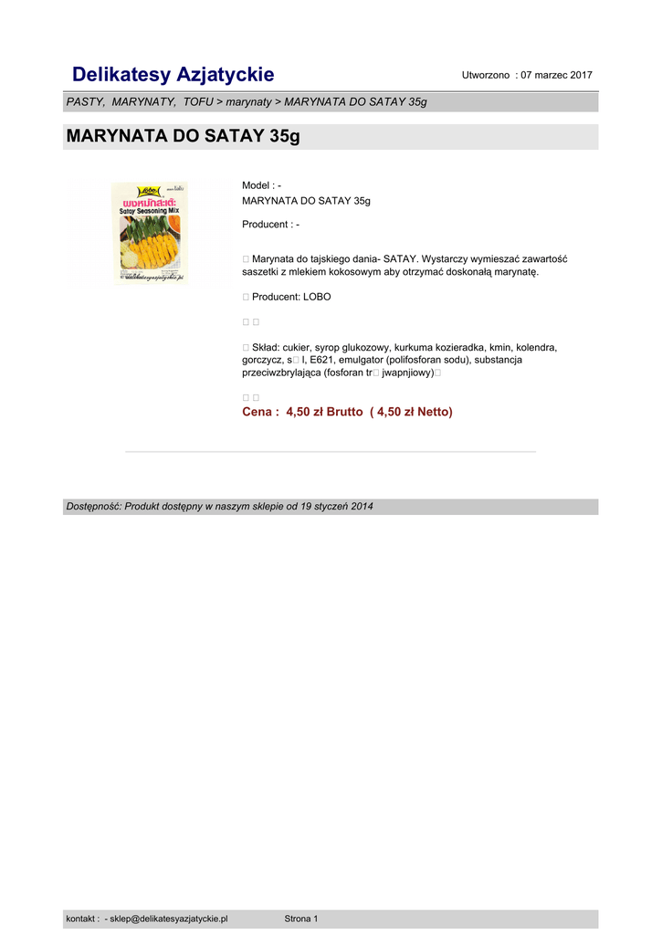 Delikatesy Azjatyckie Utworzono : 07 marzec 2017 PASTY, MARYNATY, TOFU > marynaty > MARYNATA DO SATAY 35g MARYNATA DO SATAY 35g Model : MARYNATA DO SATAY 35g Producent : Marynata do tajskiego dania- SATAY. Wystarczy wymieszać zawartość saszetki z mlekiem kokosowym aby otrzymać doskonałą marynatę. Producent: LOBO � Skład: cukier, syrop glukozowy, kurkuma kozieradka, kmin, kolendra, gorczycz, s�l, E621, emulgator (polifosforan sodu), substancja przeciwzbrylająca (fosforan tr�jwapnjiowy)� � Cena : 4,50 zł Brutto ( 4,50 zł Netto) Dostępność: Produkt dostępny w naszym sklepie od 19 styczeń 2014 kontakt : - [email protected] Strona 1