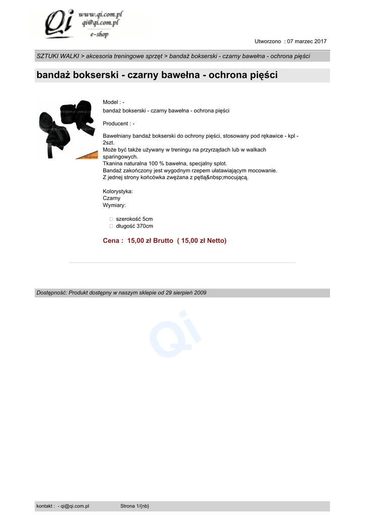 Utworzono : 07 marzec 2017 SZTUKI WALKI > akcesoria treningowe sprzęt > bandaż bokserski - czarny bawełna - ochrona pięści bandaż bokserski - czarny bawełna - ochrona pięści Model : bandaż bokserski - czarny bawełna - ochrona pięści Producent : Bawełniany bandaż bokserski do ochrony pięści, stosowany pod rękawice - kpl 2szt. Może być także używany w treningu na przyrządach lub w walkach sparingowych. Tkanina naturalna 100 % bawełna, specjalny splot. Bandaż zakończony jest wygodnym rzepem ułatawiającym mocowanie. Z jednej strony końcówka zwężana z pętlą mocującą. Kolorystyka: Czarny Wymiary: � szerokość 5cm � długość 370cm Cena : 15,00 zł Brutto ( 15,00 zł Netto) Dostępność: Produkt dostępny w naszym sklepie od 29 sierpień 2009 i Q kontakt : - [email protected] Strona 1/{nb}