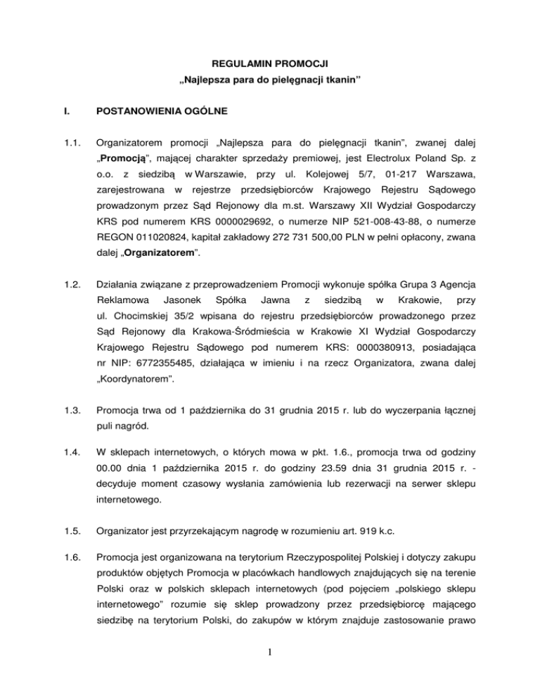 REGULAMIN PROMOCJI „Najlepsza para do pielęgnacji tkanin” I. POSTANOWIENIA OGÓLNE 1.1. Organizatorem promocji „Najlepsza para do pielęgnacji tkanin”, zwanej dalej „Promocją”, mającej charakter sprzedaży premiowej, jest Electrolux Poland Sp. z o.o. z siedzibą zarejestrowana w w Warszawie, rejestrze przy ul. Kolejowej przedsiębiorców 5/7, Krajowego 01-217 Warszawa, Rejestru Sądowego prowadzonym przez Sąd Rejonowy dla m.st. Warszawy XII Wydział Gospodarczy KRS pod numerem KRS 0000029692, o numerze NIP 521-008-43-88, o numerze REGON 011020824, kapitał zakładowy 272 731 500,00 PLN w pełni opłacony, zwana dalej „Organizatorem”. 1.2. Działania związane z przeprowadzeniem Promocji wykonuje spółka Grupa 3 Agencja Reklamowa Jasonek Spółka Jawna z siedzibą w Krakowie, przy ul. Chocimskiej 35/2 wpisana do rejestru przedsiębiorców prowadzonego przez Sąd Rejonowy dla Krakowa-Śródmieścia w Krakowie XI Wydział Gospodarczy Krajowego Rejestru Sądowego pod numerem KRS: 0000380913, posiadająca nr NIP: 6772355485, działająca w imieniu i na rzecz Organizatora, zwana dalej „Koordynatorem”. 1.3. Promocja trwa od 1 października do 31 grudnia 2015 r. lub do wyczerpania łącznej puli nagród. 1.4. W sklepach internetowych, o których mowa w pkt. 1.6., promocja trwa od godziny 00.00 dnia 1 października 2015 r. do godziny 23.59 dnia 31 grudnia 2015 r. decyduje moment czasowy wysłania zamówienia lub rezerwacji na serwer sklepu internetowego. 1.5. Organizator jest przyrzekającym nagrodę w rozumieniu art. 919 k.c. 1.6. Promocja jest organizowana na terytorium Rzeczypospolitej Polskiej i dotyczy zakupu produktów objętych Promocja w placówkach handlowych znajdujących się na terenie Polski oraz w polskich sklepach internetowych (pod pojęciem „polskiego sklepu internetowego” rozumie się sklep prowadzony przez przedsiębiorcę mającego siedzibę na terytorium Polski, do zakupów w którym znajduje zastosowanie prawo 1 polskie), sprzedających w ramach prowadzonej przez siebie działalności gospodarczej produkty objęte Promocja. 1.7. Zgłoszenie udziału w Promocji formularza zgłoszeniowego następuje znajdującego on-line za na stronie się pośrednictwem internetowej www.electrolux.pl/promocje. 1.8. Celem Promocji jest promocja wskazanych w punkcie 2.1. niniejszego regulaminu produktów, których producentem lub dystrybutorem jest Organizator (zwanych dalej „Produktami”), służąca zwiększeniu ich sprzedaży. 1.9. Promocja nie łączy się z żadnymi innymi promocjami, dotyczącymi Produktów wskazanych w punkcie 2.1. niniejszego regulaminu, organizowanymi przez Electrolux Poland Sp. z o.o. w czasie jej trwania. II. WARUNKI UCZESTNICTWA W PROMOCJI I ZGŁOSZENIE UDZIAŁU W PROMOCJI 2.1. Promocją objęte są pralki ładowane od frontu, pralko-suszarki i suszarki marki Electrolux, na zasadach określonych szczegółowo w pkt. 3.1. Regulaminu. 2.2. Promocja jest przeznaczona wyłącznie dla osób fizycznych, które spełniają wszystkie poniższe warunki: a) ukończyły 18. rok życia; b) posiadają miejsce zamieszkania na terytorium Rzeczypospolitej Polskiej; c) posiadają pełną zdolność do czynności prawnych; d) kupują Produkty jako konsumenci w rozumieniu art. 221 kodeksu cywilnego (ustawa z dn. 16 kwietnia 1964 r. Kodeks cywilny, tekst jedn. Dz. U. z 2014 r. poz. 121 z późn. zm.). W Promocji mogą zatem uczestniczyć osoby fizyczne będące przedsiębiorcami, jeżeli zakup Produktów nie ma bezpośredniego związku z prowadzoną przez nich działalnością gospodarczą lub zawodową; e) w okresie od 1 października 2015 r. do 7 stycznia 2016 r. dokonają zgłoszenia do Promocji produktu lub dwóch Produktów (pkt 3.1. poniżej) zakupionych przez siebie w czasie trwania Promocji tj. od 1 października do 31 grudnia 2015 r., na stronie internetowej www.electrolux.pl/promocje wypełniając dostępny na tej stronie formularz rejestracyjny i podając następujące dane: imię, nazwisko, adres 2 zamieszkania lub adres do korespondencji (miejscowość, ulica, numer domu lub lokalu, kod pocztowy), numer telefonu kontaktowego, adres e-mail, numer/y dowodu/ów zakupu (paragonów lub faktur), jak również model/e zakupionych urządzeń oraz ich numery seryjne. W ramach rejestracji konieczne jest przesłanie skanu/ów dowodu/ów zakupu Produktu/ów (paragonu fiskalnego lub faktury) oraz skanu/ów kart gwarancyjnych zawierających ich unikatowe numery i dane urządzeń. Do ukończenia rejestracji niezbędne jest podanie wszystkich powyższych danych, przesłanie skanów paragonów/faktur oraz skanów kart gwarancyjnych, dotyczących jednego lub dwóch zgłaszanych Produktów. Z momentem zatwierdzenia formularza rejestracyjnego, osoba spełniająca wszystkie warunki, o których mowa w niniejszym punkcie 2.2., staje się uczestnikiem Promocji (dalej jako: „Uczestnik”). 2.3. W Promocji dana osoba może wziąć udział tylko jeden raz. Zakup zgłaszanych w ramach Promocji Produktów nie musi być jednoczesny (nie muszą być objęte tym samym dowodem zakupu). 2.4. W Promocji nie mogą uczestniczyć właściciele (współwłaściciele), wspólnicy, lub osoby zatrudnione w jakiejkolwiek formie prawnej (na podstawie umowy o pracę, umowy zlecenia etc.) w punktach sprzedaży detalicznej lub hurtowej, prowadzących sprzedaż Produktów Organizatora oraz członkowie ich rodzin. 2.5. Przez członków rodziny, o których mowa w punkcie 2.3., rozumie się: wstępnych, zstępnych, rodzeństwo, małżonków, małżonków rodzeństwa, rodziców małżonków, kuzynów i osoby pozostające w stosunku przysposobienia. 2.6. Udział w Promocji i podanie związanych z udziałem danych jest całkowicie dobrowolne. 2.7. Uczestnik, który dokonał zgłoszenia udziału w Promocji, otrzyma na podany w zgłoszeniu adres e-mail potwierdzenie rejestracji w Promocji, a także informację o przeprowadzaniu weryfikacji prawidłowości jego zgłoszenia. 2.8. Podstawą uznani