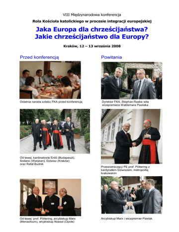 VIII Międzynarodowa konferencja Rola Kościoła katolickiego w procesie integracji europejskiej Jaka Europa dla chrześcijaństwa? Jakie chrześcijaństwo dla Europy? Kraków, 12 – 13 września 2008 Przed konferencją Powitania Ostatnia narada sztabu FKA przed konferencją Dyrektor FKA, Stephan Raabe wita wicepremiera Waldemara Pawlaka Od lewej: kardinałowie Erdö (Budapeszt), Sodano (Watykan), Dziwisz (Kraków) oraz Rafał Budnik Przewodniczący PE prof. Pöttering z kardynałem Dziwiszem, metropolitą krakowskim Od lewej: prof. Pöttering, arcybiskup Marx (Monachium), arcybiskup Nossol (Opole) Arcybiskup Marx i wicepremier Pawlak Otwarcie konferencji Waldemar Pawlak, wicepremier RP Kardynał dr Stanisław Dziwisz Prof. Hans-Gert Pöttering, przewodniczący PE Bronisław Komorowski, Marszałek Sejmu RP Kardynał dr Angelo Sodano, przewodniczący Kolegium Kardynalskiego, emerytowany sekretarz stanu Stolicy Apostolskiej Przemówienie prof. Pötteringa Waldemar Pawlak, prof. Hans-Gert Pöttering, Bronisław Komorowski W czasie przerwy Kardynał dr Angelo Sodano, prof. Jerzy Buzek, poseł PE Prof. Hans-Gerd Pöttering, abp Alfons Nossol, prof. Jerzy Buzek Od lewej: Horst Langes (honorowy przewodniczący Fundacji im. Roberta Schumana), Elmar Brok (poseł PE), Jaques Santer (prezes Fundacji Schumana) I sesja: PRZYSZŁOŚĆ EUROPY – NADZIEJE I NIEPOKOJE CHRZEŚCIJAN Elmar Brok, poseł do PE, prof. Rocco Buttiglione, wiceprezydent Parlamentu Włoch Jacques Santer, prezes Fundacji im. Roberta Schumana w Luksemburgu Wieczorem Msza w Katedrze na Wawelu pod przewodnictwem kardynała dr Angelo Sodano Uroczysta kolacja na zaproszenie marszałka woj. Małopolskiego, Marka Nawary II sesja: Jaka polityka wewnątrz Unii i według jakich kryteriów? Zasadnicza orientacja polityki europejskiej Prof. Władysław Bartoszewski, sekretarz stanu w kancelarii premiera RP, Othmar Karas, poseł do PE, wiceprezydent Frakcji EPP-ED Arcybiskup prof. dr Reinhard Marx (Monachium) Dr Stephan Eisel, poseł do Bundestagu, CDU III sesja: Jak kształtować właściwe relacje wobec sąsiadów? Arcybiskup prof. dr Henryk Muszyński Kardynał prof. dr Péter Erdö, prymas Węgier Dr Stephan Eisel, poseł do Bundestagu, CDU Lasha Zhvania, przewodniczący Parlamentarnej Komisji Spraw Zagranicznych Gruzji, Ruch Narodowy (ENM) Andrzej Grzyb, przewodniczący Sejmowej Komisji ds. UE Michel Eddé, b. Minister Kultury i Szkolnictwa WyŜszego Libanu Kardynał prof. Péter Erdö, prymas Węgier Andrzej Grzyb, przewodniczący Sejmowej Komisji ds. UE Lasha Zhvania, przewodniczący Parlamentarnej Komisji Spraw Zagranicznych Gruzji, Ruch Narodowy (ENM) Podsumowanie konferencji Bogusław Sonik, poseł do Parlamentu Europejskiego, PO Ks. prof. Jan Dyduch, rektor Papieskiej Akademii Teologicznej w Krakowie