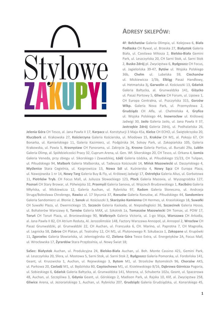 ADRESY SKLEPÓW: 4F: Bełchatów Galeria Olimpia, ul. Kolejowa 6, Biała Podlaska CH Rywal, ul. Brzeska 27, Białystok Galeria Biała, ul. Czesława Miłosza 2, Bielsko-Biała Gemini Park, ul. Leszczyńska 20, CH Sarni Stok, ul. Sarni Stok 2, Busko Zdrój pl. Zwycięstwa 6, Bydgoszcz CH Focus, ul. Jagielońska 39-47, Bytów ul. Wojska Polskiego 36b, Chełm ul. Lubelska 59, Ciechanów ul. Mickiewicza 1/3b, Elbląg Pasaż Handlowy, ul. Hetmańska 3j, Garwolin ul. Kościuszki 13, Gdańsk Galeria Bałtycka, al. Grunwaldzka 141, Giżycko ul. Pasaż Portowy 5, Gliwice CH Forum, ul. Lipowa 1, CH Europa Centralna, ul. Pszczyńska 315, Gorzów Wlkp. Galeria Nova Park, ul. Przemysłowa 2, Grudziądz CH Alfa, ul. Chełmińska 4, Gryfice ul. Wojska Polskiego 44, Inowrocław ul. Królowej Jadwigi 30, Jasło Galeria Jasło, ul. Jana Pawła II 37, Jastrzębie Zdrój Galeria Zdrój, ul. Podhalańska 26, Jelenia Góra CH Tesco, al. Jana Pawła II 17, Karpacz ul. Konstytucji 3 Maja 45a, Kielce CH ECHO, ul. Świętokrzyska 20, Kluczbork ul. Krakowska 27, Kościerzyna Galeria Kościerska, ul. Miodowa 15, Kraków CH M1, al. Pokoju 67, CH Bonarka, ul. Kamieńskiego 11, Galeria Kazimierz, ul. Podgórska 34, Solvay Park, ul. Zakopiańska 105, Galeria Krakowska, ul. Pawia 5, Krasnystaw CH Panorama, ul. Zakręcie 2g, Krosno Galeria Portius, ul. Bursaki 29a, Lublin Galeria Olimp, al. Spółdzielczości Pracy 32, Cuprum Arena, ul. Gen. Wł. Sikorskiego 20, CH Tesco, ul. Orkana 4, Łomża Galeria Veneda, przy zbiegu ul. Sikorskiego i Zawadzkiej, Łódź Galeria Łódzka, al. Piłsudskiego 15/23, CH Tulipan, ul. Piłsudskiego 94, Malbork Galeria Malborska, ul. Tadeusza Kościuszki 14, Mińsk Mazowiecki ul. Daszyńskiego 4, Myślenice Stara Cegielnia, ul. Kasprowicza 13, Nowa Sól ul. Kuśnierska 4, Nowy Sącz CH Europa Plaza, ul. Nawojowska 1 nr 14, Nowy Targ Galeria Buy & Fly, ul. Królowej Jadwigi 17, Ostrołęka Galeria Alius, ul. Gorbatowa 11, Piotrków Tryb. CH Focus Mall, ul. Juliusza Słowackiego 123, Płock Galeria Mazovia, ul. Wyszogrodzka 127, Poznań CH Stary Browar, ul. Półwiejska 32, Przemyśl Galeria Sanova, ul. Wojciech Brudzewskiego 1, Racibórz Galeria Młyńska, ul. Mickiewicza 12, Galeria Auchan, ul. Rybnicka 97, Radom Galeria Słoneczna, ul. Andrzeja Struga/Bolesława Chrobrego, Rawicz ul. 17 Stycznia 37, Rzeszów Galeria Rzeszów, al. Piłsudskiego 44, Sandomierz Galeria Sandomierz ul. Błonie 2, Sanok ul. Kościuszki 3, Skarżysko Kamienna CH Hermes, ul. Krasińskiego 18, Suwałki CH Suwałki Plaza, ul. Dwernickiego 15, Szczecin Galeria Kaskada, al. Niepodległości 36, Szczecinek Galeria Hosso, ul. Bohaterów Warszawy 6, Tarnów Galeria MAX, ul. Szkotnik 1a, Tomaszów Mazowiecki DH Tomax, ul. POW 17, Toruń CH Toruń Plaza, ul. Broniewskiego 90, Wałbrzych Galeria Victoria, ul. 1-go Maja, Warszawa CH Arkadia, al. Jana Pawła II 82, CH Atrium Reduta, Al. Jerozolimskie 148, Factory Warszawa Annopol, ul. Annopol 2, Wrocław CH Pasaż Grunwaldzki, pl. Grunwaldzki 22, CH Auchan, ul. Francuska 6, CH. Marino, ul. Paprotna 7, CH Magnolia, ul. Legnicka 58, Zabrze CH Platan, pl. Teatralny 12, CH M1, ul. Plutonowego R. Szkubacza 1, Zakopane ul. Krupówki 11, Zgorzelec Galeria Słowiańska, ul. Jeleniogórska 42, Zielona Góra Tesco Extra, ul. Energetyków 2A, Focus Mall, ul. Wrocławska 17, Żyrardów Stara Przędzalnia, ul. Nowy Świat 18; 5aSec: Białystok Auchan, ul. Produkcyjna 24, Bielsko-Biała Auchan, ul. Boh. Monte Cassino 421, Gemini Park, ul. Leszczyńska 20, Sfera, ul. Mostowa 5, Sarni Stok, ul. Sarni Stok 2, Bydgoszcz Galeria Pomorska, ul. Fordońska 141, Geant, ul. Kruszwicka 1, Auchan, ul. Rejewskiego 3, Bytom M1, ul. Strzelców Bytomskich 96, Chorzów AKS, ul. Parkowa 20, Czeladź M1, ul. Będzińska 80, Częstochowa M1, ul. Kisielewskiego 8/16, Dąbrowa Górnicza Pogoria, ul. Sobieskiego 6, Gdańsk Galeria Bałtycka, al. Grunwaldzka 141, Morena, ul. Schuberta 102a, Geant, ul. Spacerowa 48, Auchan, ul. Szczęśliwa 3, Gdynia Geant, ul. Górskiego 2, Madison Park, ul. Rajska 10, Klif, al. Zwycięstwa 258, Gliwice Arena, ul. Jeziorańskiego 1, Auchan, ul. Rybnicka 207, Grudziądz Galeria Grudziądzka, ul. Konarskiego 45, 1 Katowice Auchan, ul. Reńców 30, Geant, ul. Trzy Stawy 60, Dąbrówka, ul. Roździeńskiego 200, Kobierzyce Tesco, ul. Czekoladowa 9, Bielany Wrocławskie, ul. Francuska 6, Komorniki Auchan, ul. Głogowska 342, Koszalin Atrium, ul. Paderewskiego 1, Kraków Krokus, al. Bora Komorowskiego 37, Bonarka, ul. Kamieńskiego 11, Carrefour, ul. Medweckiego 2, Galeria Krakowska, ul. Pawia 5, Galeria Kazimierz, ul. Podgórska 34, M1, al. Pokoju 67, Tesco, ul. Wielicka 259, Carrefour, ul. Zakopiańska 62, Krasne Auchan, Krasne 20B, Legnica Auchan, ul. Schumana 11, Lublin Plaza, ul. Lipowa 13, Galeria Lubelska, ul. Witosa 6, Łomianki Łomianki Park, ul. Brukowa 25, Auchan, ul. Brukowa 25, Łódź M1, ul. Brzezińska 27/29, Pasaż Łódzki, al. Jana Pawła II 30, Manufaktura, ul. Karskiego 5, Carrefour, ul. Kolumny 6/36, Galeria Łódzka, ul. Piłsudskiego 15/23, Tulipan, ul. Piłsudskiego 94, Marki M1, ul. Piłsudskiego 1, Mikołów Auchan, ul. Gliwicka 2, Opole Solaris Center, pl. Kopernika 16, Karolinka, ul. Wrocławska 154, Piaseczno Auchan, ul. Puławska 46, Piotrków Tryb. Leader Price, ul. Szkolna 37/39 Płock Auchan, ul. Wyszogrodzka 140, Poznań Malta, ul. Abpa Baraniaka, Pestka, al. Solidarności 47, Radom Galeria Słoneczna, ul. Chrobrego 1, M1, al. Grzecznarowskiego 28, Raszyn Janki ul. Mszczonowska 3, Rumia Auchan, ul. Grunwaldzka 108, Rybnik Plaza, ul. Raciborska 16, Słupsk Jantar, ul. Szczęśliwicka 58, Sosnowiec Sosnowiec ul. Baczyńskiego 2, Plaza, ul. Sienkiewicza 2, Plejada, ul. Staszica 8B, Auchan, ul. Zuzanny 20, Swadzim Auchan, ul. Św. Antoniego 2, Toruń Geant, ul. Grudziądzka 162, Carrefour, ul. Olsztyńska 8, Szczecin Carrefour, al. Boh. Warszawy 42, Geant, ul. Ku Słońcu 67, Auchan, Ustowo 45, Gryf, ul. Wiosenna 32, Galaxy, al. Wyzwolenia 18/20, Wałbrz