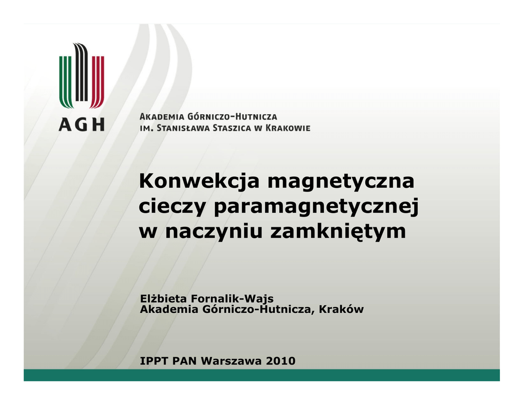 Konwekcja magnetyczna cieczy paramagnetycznej w naczyniu zamkniętym Elżbieta Fornalik-Wajs Akademia Górniczo-Hutnicza, Kraków IPPT PAN Warszawa 2010 Trochę historii... • Dawno dawno temu (<4000 p.n.e) – pierwsze ślady obiektów ferromagnetycznych • I w. – w chińskich źródłach pojawia się informacja o pierwszym „directional tool” – pierwowzorze kompasu • 1086 r. – pierwszy prawdziwy kompas • 1600 r., Wiliam Gilbert stwierdza, że Ziemia jest wielkim magnesem i wyjaśnia zasadę działania kompasu • 1820 r., Hans Christian Oersted zauważył, że przepływ prądu elektrycznego odchylił igłę kompasu • W 1824 r., William Sturgeon skonstruował pierwszy elektromagnes Trochę historii... • 1831 r. – Michael Faraday odkrył, że poruszający się magnes generuje przepływ prądu elektrycznego, w 1845 r. stwierdził, że każda substancja posiada własności magnetyczne, a w 1847 r. zaobserwował, że w polu magnetycznym bańki mydlane wypełnione tlenem poruszają się w innym kierunku, niż bańki wypełnione azotem • 1873 r., Maxwell napisał „A Treatise on Electricity and Magnetism”, w którym zawarł słynne równania • 1895 r. – prawo Curie • 1986 r. – nadprzewodniki wysokotemperaturowe • ••• Koniec XX w. - magnes nadprzewodzący do 15 T Koniec XX w. - nowe zjawiska Lewitująca żaba w polu magnetycznym o indukcji 16 T Struga azotu (Wakayama jet) N2 gas Air Air Diamagnetic levitation: Flying frogs and floating Quantitative analysis of air convection caused by magnets (invited) magnetic-fluid coupling Simon MD, Geim AK Bai B, Yabe A, Qi JW, Wakayama NI JOURNAL OF APPLIED PHYSICS 87 (9): 6200-6204 AIAA JOURNAL 37 (12): 1538-1543 Silne pole magnetyczne ma zastosowanie w • generacji sił (działających na płyny oraz ciała stałe), np. siła Lorentz’a • zmianie lub tworzeniu mikrostruktury podczas krzepnięcia • rozwoju perspektyw na procesy „bezstykowe” • separacji magnetycznej • tłumieniu konwekcji • ... Koniec XX w. - … różnica temperatury pole grawitacyjne konwekcja naturalna pole magnetyczne konwekcja termo-magnetyczna Cel Analiza wpływu pola magnetycznego na zjawisko konwekcji cieczy paramagnetycznej, ze szczególnym uwzględnieniem wymiany ciepła w wybranych geometriach (sześcian, termosyfon). Przeprowadzone zostały: - badania eksperymentalne - symulacje numeryczne - analiza wielkościowa Zbadana została możliwość kontroli konwekcji cieczy eksperymentalnej w silnym polu magnetycznym. Zakres analizy • Konwekcja naturalna H. Bénard (1901), L. Rayleigh (1916) i in. • Konwekcja naturalna w sześcianie G.K. Batchelor (1954), G. de Vahl Davis (1968), H. Ozoe and S.W. Churchill (1973), J.C. Patterson and J. Imberger (1980), prace IPPT PAN i in. Ishihara I. et al. (2002), Int’l. Journal of Heat and Fluid Flow 23 • Konwekcja naturalna w termosyfonie D. Japikse et al. (1971), G.D. Mallinson et al. (1981), G.S.H. Lock and J.D. Kirchner (1992), I. Ishihara et al. (2002) i in. • Struktura przepływu H. Bénard (1901), G.D. Mallinson et al. (1981), B. Hof et al. (1999), R. Touihri et al. (1999), K. Boronska and L.S. Tuckerman (2004) i in. Van Dyke, M., 1982: An Album of Fluid Motion Siła wyporu stabilny – grzany od góry HOT g niestabilny – grzany od dołu COLD Fg Fg Fg COLD Fg HOT Fg = − gρ 0 β (T − T0 ) g – przyspieszenie ziemskie, ρ0 – gęstość w temperaturze odniesienia T0, β – współczynnik rozszerzalności termicznej, T - temperatura Własności magnetyczne Prawo Curie • Paramagnetyki : χg > 0, • Diamagnetyki : χg < 0, • Ferromagnetyki : χg >> 1, Paramagnetyki : χg > 0 aluminium, tlen, wolfram miedź, złoto, woda żelazo, kobalt, nikiel Prawo Curie : χg= C / θ stała Curie temperatura bezwzględna Podatność magnetyczna χg [m3/kg] jest to wielkość fizyczna charakteryzująca zdolność substancji do zmian jej polaryzacji magnetycznej J pod wpływem pola magnetycznego o natężeniu H J = χg H Siły działające na układ w polu magnetycznym fV = ∇ ⋅ τ ∂µ H 2 µ ρ τ = − p0 − − 2 ∂ρ T 1 2 ∂µ H 2 − fV = −∇ p0 + ∇ H ρ ∇µ 2 ∂ρ T 2 magnetostrykcja człon związany z gradientem przenikalności magnetycznej τ – tensor naprężeń, p0 – ciśnienie w temperaturze odniesienia T0, H – natężenie pola magnetycznego, µ – przenikalność magnetyczna, η – lepkość dynamiczna, ρ – gęstość Siła magnetyczna 1 2 ∂µ H 2 + ∇ H ρ − ∇µ 2 ∂ρ T 2 µ = µ 0 (1 + χ g ρ ) µ µr = µ0 µr − 1 = χ g ρ 1 Fm = µ 0 χ g ρ∇H 2 2 χ χg = ρ H – natężenie pola magnetycznego, µ – przenikalność magnetyczna, χg – masowa podatność magnetyczna, χ – objętościowa podatność magnetyczna, µ0 – przenikalność magnetyczna próżni, µr – względna przenikalność magnetyczna, ρ – gęstość Siła magnetyczna c.d. Zakładając liniową zależność gęstości od temperatury oraz korzystając z prawa Curie otrzymuje się wzór 1 − χ g 0 ρ 0 β 1 + βT0 (T − T0 )∇B 2 Fm = 2µ0 określający siłę magnetyczną działającą na ciecz paramagnetyczną. χg0 – masowa podatność magnetyczna w temp. odniesienia T0, ρ0 – gęstość w temp. odniesienia T0, β – współczynnik rozszerzalności termicznej, T – temperatura, B – indukcja pola magnetycznego, µ0 – przenikalność magnetyczna próżni Badania eksperymentalne Sześcian a = 0.032 m 80% masowy wodny roztwór gliceryny + 0.8 mol/kg sześciowodny azotan gadolinu χg = +23.094 ×10-8 [m3/kg] Termosyfon APARAT d = 0.04 [m] h = 0.06 [m] T. C. T. C. PLEXI GÓRA 50% objętościowy roztwór wodny gliceryny + LED DIODY Y DIOD 0.5 mol/kg sześciowodny azotan gadolinu LED DIODY DIODY T. C. PLEXI DÓŁ χg = +13.926 ×10-8 [m3/kg] Z R Układ eksperymentalny Naczynie eksperymentalne System kontroli zasilania + V Grzejnik elektryczny A - Zasilacz DC Termopary Chłodnica Keyence NR1000 LAUDA Łaźnia stałotemperaturowa PC USB Syst