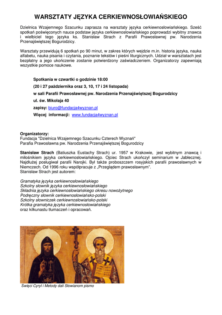 WARSZTATY JĘZYKA CERKIEWNOSŁOWIAŃSKIEGO Dzielnica Wzajemnego Szacunku zaprasza na warsztaty języka cerkiewnosłowiańskiego. Sześć spotkań poświęconych nauce podstaw języka cerkiewnosłowiańskiego poprowadzi wybitny znawca i wielbiciel tego języka ks. Stanisław Strach z Parafii Prawosławnej pw. Narodzenia Przenajświętszej Bogurodzicy. Warsztaty przewidują 6 spotkań po 90 minut, w zakres których wejdzie m.in. historia języka, nauka alfabetu, nauka pisania i czytania, poznanie tekstów i pieśni liturgicznych. Udział w warsztatach jest bezpłatny a jego ukończenie zostanie potwierdzony zaświadczeniem. Organizatorzy zapewniają wszystkie pomoce naukowe. Spotkania w czwartki o godzinie 18:00 (20 i 27 października oraz 3, 10, 17 i 24 listopada) w sali Parafii Prawosławnej pw. Narodzenia Przenajświętszej Bogurodzicy ul. św. Mikołaja 40 zapisy: [email protected] Więcej informacji: www.fundacja4wyznan.pl Organizatorzy: Fundacja "Dzielnica Wzajemnego Szacunku Czterech Wyznań" Parafia Prawosławna pw. Narodzenia Przenajświętszej Bogurodzicy Stanisław Strach (Batiuszka Eustachy Strach) ur. 1957 w Krakowie, jest wybitnym znawcą i miłośnikiem języka cerkiewnosłowiańskiego. Ojciec Strach ukończył seminarium w Jabłecznej. Najdłużej posługiwał parafii Narojki. Był także proboszczem rosyjskich parafii prawosławnych w Niemczech. Od 1996 roku współpracuje z „Przeglądem prawosławnym”. Stanisław Strach jest autorem: Gramatyka języka cerkiewnosłowiańskiego Szkolny słownik języka cerkiewnosłowiańskiego Składnia języka cerkiewnosłowiańskiego okresu nowożytnego Podręczny słownik cerkiewnosłowiańsko-polski Szkolny słowniczek cerkiewnosłowiańsko-polski Krótka gramatyka języka cerkiewnosłowiańskiego oraz kilkunastu tłumaczeń i opracowań. Święci Cyryl i Metody dali Słowianom pismo Cerkiewnosłowiański to literacki i liturgiczny język używany w cerkwi prawosławnej. Wywodzi się od języka praindoeuropejskiego, na podstawie którego tysiąc lat przed naszą erą zaczęła się formować prasłowiańska grupa etniczno-językowa. Z niej wywodzą się współczesne języki zachodnio słowiańskie (m. in. polski, czeski, słowacki), wschodniosłowiańskie (rosyjski, ukraiński, białoruski) oraz południowosłowiańskie (serbochorwacki, słoweński, bułgarski i macedoński). W IX wieku na bazie południowosłowiańskiego dialektu sołuńskiego powstał język starocerkiewnosłowiański. Ojcami jego piśmiennictwa byli święci Cyryl i Metody, duchowni bizantyńscy, którzy prowadzili misje na Morawach i terenach dzisiejszej południowo-wschodniej Polski. Misja chrystianizacyjna wymagała by do liturgii wprowadzić język nowych wyznawców, w tym przypadku język słowiański. Z upływem czasu w wyniku podziału terenów na oddzielne prowincje zaczęły wyodrębniać się pojedyncze odmiany języka cerkiewnosłowiańskiego. Język ten ograniczał się do roli sakralnej. Do czasu siedemnastowiecznej reformy kościelnej patriarchy Nikona opracowano reguły pisowni oraz zasady gramatyczne, normalizując słowotwórstwo i ujednolicając teksty. Na tej podstawie narodził się nowo-cerkiewnosłowiański, który dziś jest prawosławnym językiem liturgicznym słowiańskich Cerkwi. Język cerkiewnosłowiański ma wyjątkowe znaczenie dla studiów slawistycznych oraz badań nad językami słowiańskimi. Jest on najstarszą utrwaloną fazą w rozwoju języków słowiańskich. Dla słowiańskich Cerkwi język cerkiewnosłowiański ma wyjątkowe znaczenie. W sposób nieskażony oddaje treść greckiego oryginału Nowego Testamentu oraz teologiczną myśl Ojców Kościoła. Język ten integruje narody słowiańskie oraz charakteryzuje się głębią duchowości, a swoją estetyką współgra z oprawą prawosławnych nabożeństw. Modlitwa Ojcze Nasz w języku cerkiewnosłowiańskim Fundacja "Dzielnica Wzajemnego Szacunku Czterech Wyznań" www.fundacja4wyznan.pl Organizacja Pożytku Publicznego Kazimierza Wielkiego 29 50-077 Wrocław +48 509 27 95 97 [email protected]