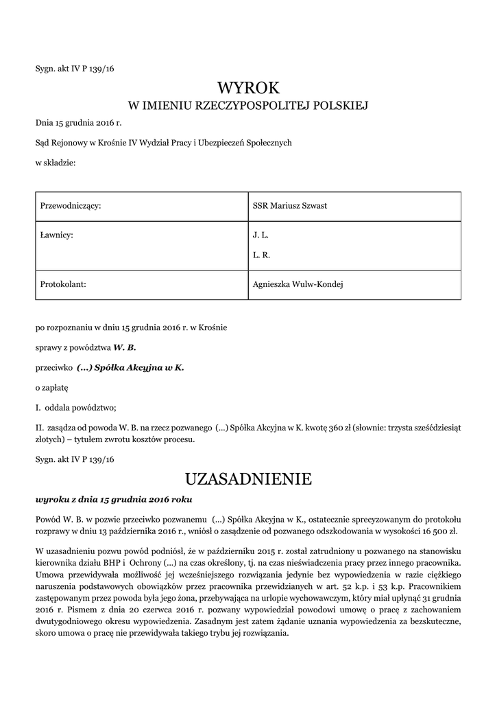 Sygn. akt IV P 139/16 WYROK W IMIENIU RZECZYPOSPOLITEJ POLSKIEJ Dnia 15 grudnia 2016 r. Sąd Rejonowy w Krośnie IV Wydział Pracy i Ubezpieczeń Społecznych w składzie: Przewodniczący: SSR Mariusz Szwast Ławnicy: J. L. L. R. Protokolant: Agnieszka Wulw-Kondej po rozpoznaniu w dniu 15 grudnia 2016 r. w Krośnie sprawy z powództwa W. B. przeciwko (...) Spółka Akcyjna w K. o zapłatę I. oddala powództwo; II. zasądza od powoda W. B. na rzecz pozwanego (...) Spółka Akcyjna w K. kwotę 360 zł (słownie: trzysta sześćdziesiąt złotych) – tytułem zwrotu kosztów procesu. Sygn. akt IV P 139/16 UZASADNIENIE wyroku z dnia 15 grudnia 2016 roku Powód W. B. w pozwie przeciwko pozwanemu (...) Spółka Akcyjna w K., ostatecznie sprecyzowanym do protokołu rozprawy w dniu 13 października 2016 r., wniósł o zasądzenie od pozwanego odszkodowania w wysokości 16 500 zł. W uzasadnieniu pozwu powód podniósł, że w październiku 2015 r. został zatrudniony u pozwanego na stanowisku kierownika działu BHP i Ochrony (...) na czas określony, tj. na czas nieświadczenia pracy przez innego pracownika. Umowa przewidywała możliwość jej wcześniejszego rozwiązania jedynie bez wypowiedzenia w razie ciężkiego naruszenia podstawowych obowiązków przez pracownika przewidzianych w art. 52 k.p. i 53 k.p. Pracownikiem zastępowanym przez powoda była jego żona, przebywająca na urlopie wychowawczym, który miał upłynąć 31 grudnia 2016 r. Pismem z dnia 20 czerwca 2016 r. pozwany wypowiedział powodowi umowę o pracę z zachowaniem dwutygodniowego okresu wypowiedzenia. Zasadnym jest zatem żądanie uznania wypowiedzenia za bezskuteczne, skoro umowa o pracę nie przewidywała takiego trybu jej rozwiązania. W odpowiedzi na pozew pozwany (...) S.A. w K. wniósł o oddalenie powództwa w całości oraz zasądzenie od powoda na rzecz pozwanego kosztów postępowania według norm przepisanych, w tym kosztów zastępstwa procesowego oraz opłaty skarbowej od pełnomocnictwa. W uzasadnieniu odpowiedzi na pozew pozwany zarzucił, że rozwiązanie z powodem umowy o pracę nastąpiło na podstawie przepisów ustawy z 13 marca 2003 r. o szczególnych zasadach rozwiązywania z pracownikami stosunków pracy z przyczyn niedotyczących pracowników. Umowa na zastępstwo jest traktowana przez kodeks pracy jako szczególna forma umowy na czas określony. Według stanu prawnego obowiązującego na dzień zawarcia z powodem umowy o pracę, na podstawie obowiązującego na dzień 22 lutego 2016 r. przepisu art. 33 1 k.p., umowa mogła zostać rozwiązana za trzydniowym okresem wypowiedzenia. Łącząca strony umowa o pracę również przewidywała możliwość jej rozwiązania za wypowiedzeniem (§ 8 umowy), potwierdzając regulację kodeksową w tym zakresie. Przepis art. 33 i art. 33 1 k.p. zostały uchylone z dniem 22 lutego 2016 r. Według stanu prawnego obowiązującego na dzień rozwiązania umowy o pracę okres wypowiedzenia umowy zawartej na czas określony, jak i na czas nieokreślony, zostały ujednolicone przez art. 36 k.p., przy czym do rozwiązania przedmiotowej umowy o pracę pracodawca posłużył się korzystniejszym dla pracownika dwutygodniowym okresem wypowiedzenia. Sąd ustalił i zważył, co następuje : Na podstawie umowy o pracę na zastępstwo zawartej dnia 6 października 2015 r. pozwany (...) Spółka Akcyjna w K. zatrudnił powoda W. B. na stanowisku kierownika działu BHP i Ochrony (...) na czas nieświadczenia pracy przez S. B., w pełnym wymiarze czasu pracy od 6 października 2015 r. W § 8, w ust. 1 umowy zastrzeżono możliwość jej wypowiedzenia w sposób przewidziany kodeksem pracy, natomiast w ust. 2 tego paragrafu wskazano, że w każdym czasie, w razie ciężkiego naruszenia podstawowych obowiązków przez pracownika, pracodawca ma prawo do rozwiązania umowy bez wypowiedzenia zgodnie z art. 52 k.p. i 53 k.p. W piśmie z dnia 6 października 2015 r. zawierającym informacje o warunkach zatrudnienia pracownika w pkt. 5 wskazano, że okres wypowiedzenia umowy o pracę na czas zastępstwa wynosi 3 dni robocze – art. 33 1 k.p. W piśmie z dnia 20 czerwca 2016 r. pracodawca zawarł oświadczenie o rozwiązaniu z pracownikiem umowy o pracę z zachowaniem okresu wypowiedzenia, który wynosi dwa tygodnie i upłynął 9 lipca 2016 r. Pracodawca powoda miał świadomość, że nieobecność żony powoda będzie trwać dłużej niż 6 miesięcy. Dowód : akta osobowe powoda, zeznania świadka M. P. k.42, Sąd dał wiarę zeznaniom świadka, bowiem są spójne i jednolite. Sąd dał wiarę dowodom z dokumentów, których wiarygodność nie budzi wątpliwości, a strony im nie zaprzeczyły. W dacie zawarcia przez strony procesu umowy o pracę obowiązywał art. 25 § 1 k.p., w brzmieniu z którego wynikało, że umowę o pracę zawiera się na czas nieokreślony, na czas określony lub na czas wykonania określonej pracy. Jeżeli zachodzi konieczność zastępstwa pracownika w czasie jego usprawiedliwionej nieobecności w pracy, pracodawca może w tym celu zatrudnić innego pracownika na podstawie umowy o pracę na czas określony, obejmujący czas tej nieobecności. W tamtym czasie obowiązywał również art. 331 k.p., który stanowił, że okres wypowiedzenia umowy o pracę zawartej na czas określony w okolicznościach, o których mowa w art. 25 § 1 zdanie drugie, wynosi 3 dni robocze. Umowa na czas zastępstwa była szczególną odmianą umowy na czas określony. Umowa ta nie została bliżej określona w kodeksie pracy, zatem należało do niej stosować wszelkie reguły wynikające z norm dotyczących umowy na czas określony - tak Kodeks pracy Komentarz pod redakcją M. G., K. R. i J. S. Wydawnictwa (...) k.152. Zgodnie z art. 18 ustawy z dnia 25 czerwca 2015 r. o zmianie ustawy - Kodeks pracy oraz niektórych innych ustaw (Dz.U. z 2015, poz. 1220) ustawa wchodzi w życie po upływie 6 miesięcy od dnia ogłoszenia, z wyjątkiem art. 12, który wchodzi w życie z dnie