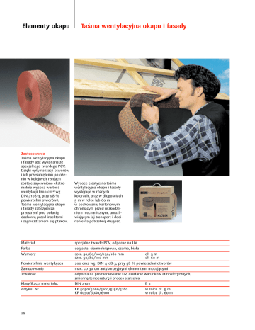 Elementy okapu Taśma wentylacyjna okapu i fasady Zastosowanie Taśma wentylacyjna okapu i fasady jest wykonana ze specjalnego twardego PCV. Dzięki optymalizacji otworów i ich przesuniętemu po⌅o˝eniu w kolejnych rzędach zostaje zapewniona ekstremalnie wysoka wartość wentylacji (200 cm2 wg DIN 4108-3, przy 58 % powierzchni otworów). Taśma wentylacyjna okapu i fasady zabezpiecza przestrzeƒ pod po⌅acią dachową przed insektami i zagnie˝d˝aniem się ptaków. Wysoce elastyczna taśma wentylacyjna okapu i fasady występuje w ró˝nych kolorach, oraz w d⌅ugościach 5 m w rolce lub 60 m w opakowaniu kartonowym chroniącym przed uszkodzeniem mechanicznym, umo˝liwiającym jej transport i docinanie na potrzebną d⌅ugość. Materia⌅ specjalne twarde PCV, odporne na UV Farba ceglasta, ciemnobrązowa, czarna, bia⌅a Wymiary szer. 50/80/100/150/180 mm szer. 50/80/100 mm Powierzchnia wentylująca 200 cm2 wg. DIN 4108-3, przy 58 % powierzchni otworów Zamocowanie max. co 30 cm antykorozyjnymi elementami mocującymi Trwa⌅ość odporna na promieniowanie UV, dzia⌅anie warunków atmosferycznych, zmienną temperaturę i proces starzenia Klasyfikacja materia⌅u, DIN 4102 B2 Artyku⌅ Nr KP 5050/5080/5100/5150/5180 KP 6050/6080/6100 w rolce d⌅. 5 m w rolce d⌅. 60 m 28 d⌅. 5 m d⌅. 60 m