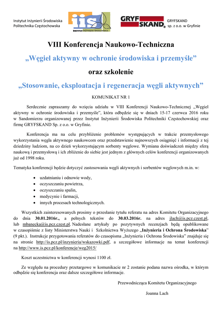 Instytut Inżynierii Środowiska GRYFSKAND Politechnika Częstochowska sp. z o.o. w Gryfinie VIII Konferencja Naukowo-Techniczna „Węgiel aktywny w ochronie środowiska i przemyśle” oraz szkolenie „Stosowanie, eksploatacja i regeneracja węgli aktywnych” KOMUNIKAT NR 1 Serdecznie zapraszamy do wzięcia udziału w VIII Konferencji Naukowo-Technicznej ,,Węgiel aktywny w ochronie środowiska i przemyśle”, która odbędzie się w dniach 15-17 czerwca 2016 roku w Sandomierzu organizowanej przez Instytut Inżynierii Środowiska Politechniki Częstochowskiej oraz firmę GRYFSKAND Sp. z o.o. w Gryfinie. Konferencja ma na celu przybliżenie problemów występujących w trakcie przemysłowego wykorzystania węgla aktywnego naukowcom oraz przedstawienie najnowszych osiągnięć i informacji z tej dziedziny ludziom, na co dzień wykorzystującym sorbenty węglowe. Wymiana doświadczeń między sferą naukową i przemysłową i ich zbliżenie do siebie jest jednym z głównych celów konferencji organizowanych już od 1998 roku. Tematyka konferencji będzie dotyczyć zastosowania węgli aktywnych i sorbentów węglowych m.in. w:      uzdatnianiu i odnowie wody, oczyszczaniu powietrza, oczyszczaniu spalin, medycynie i farmacji, innych procesach technologicznych. Wszystkich zainteresowanych prosimy o przesłanie tytułu referatu na adres Komitetu Organizacyjnego do dnia 30.01.2016r., a pełnych tekstów do 30.03.2016r. na adres [email protected], lub [email protected]. Nadesłane artykuły po pozytywnych recenzjach będą opublikowane w czasopiśmie z listy Ministerstwa Nauki i Szkolnictwa Wyższego „Inżynieria i Ochrona Środowiska” (9 pkt.). Instrukcje przygotowania referatów do czasopisma „Inżynieria i Ochrona Środowiska” znajduje się na stronie http://is.pcz.pl/inzynieria/wskazowki.pdf, a szczegółowe informacje na temat konferencji na http://www.is.pcz.pl/konferencje/weg2015/ Koszt uczestnictwa w konferencji wynosi 1100 zł. Ze względu na procedury przetargowe w komunikacie nr 2 zostanie podana nazwa ośrodka, w którym odbędzie się konferencja oraz dalsze szczegółowe informacje. Przewodnicząca Komitetu Organizacyjnego Joanna Lach