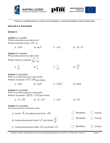 Seria GZ-3.4. Pierwiastki Zestaw 4. Zadanie 1. (1 punkt) Wskaż jedną poprawną odpowiedź. Wskaż wyrażenie równe 32 , to: A. 2 16 B. 16 2 C. 4 2 D. 4 2 7 12 D. 2 5 Zadanie 2. (1 punkt) Wskaż jedną poprawną odpowiedź. 1 1 Wskaż wartość wyrażenia . 9 16 A. 5 12 B. 1 5 C. Zadanie 3. (2 punkty) Wskaż wszystkie poprawne odpowiedzi. Wartość wyrażenia 23 12 3 36 jest równa: B. 123 2 A. 243 3 C. 123 12 D. 63 16 C. 5 6 D. 5 5 Zadanie 4. (2 punkty) Wskaż wszystkie poprawne odpowiedzi. Wartość wyrażenia 2 12 27 jest równa: A. 2 39 B. 2 5 3 Zadanie 5. (3 punkty) Oceń prawdziwość poniższych zdań. A. Liczba 5 jest jedną trzecią liczby 45 . B. Liczbą odwrotną do liczby 5 5 jest liczba 5 . 25 C. Liczbą przeciwną do liczby 2 3 jest liczba 3 2 . PRAWDA FAŁSZ PRAWDA FAŁSZ PRAWDA FAŁSZ „Wespół w zespół z Matematyką bez Granic do egzaminu gimnazjalnego” Seria GZ-3.4. Pierwiastki. Zestaw 4. Strona 1 Zadanie 6. (3 punkty) Oceń prawdziwość poniższych zdań. A. Liczba 3 9 3 24 jest liczbą całkowitą. PRAWDA FAŁSZ 3 24 3 jest liczbą całkowitą. 6 PRAWDA FAŁSZ B. Liczba 28 21 jest liczbą całkowitą. 3 PRAWDA FAŁSZ C. Liczba Zadanie 7. (2 punkt) Połącz w pary bryły z odpowiadającymi im objętościami: I. II. B. 363 2 A. 183 18 C. 183 36 Zadanie 8. (2 punkty) Połącz wyrażenia z ich wartościami: I. 2 98 3 18 4 II. A. 1 B. 0 3 50 32 6 C. 1 Zadanie 9. (2 punkty) Uzupełnij luki tak, aby otrzymać zdania prawdziwe. a) Najmniejszą liczbą naturalną większą od 300 jest liczba . . . . . . .. b) Największą liczbą naturalną mniejszą od 3 300 jest liczba . . . . . . .. Zadanie 10. (4 punkty) Przekątna prostokąta P1 o boku długości 3 cm ma długość 4 cm, natomiast przekątna prostokąta P2 o boku długości 4 cm ma długość 3 2 cm. Który z tych prostokątów ma większe pole? „Wespół w zespół z Matematyką bez Granic do egzaminu gimnazjalnego” Seria GZ-3.4. Pierwiastki. Zestaw 4. Strona 2