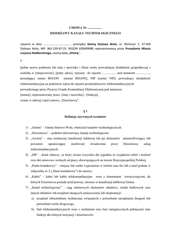 UMOWA Nr .................. DZIERŻAWY KANAŁU TECHNOLOGICZNEGO zawarta w dniu ................................... pomiędzy Gminą Stalowa Wola, ul. Wolności 7, 37-450 Stalowa Wola, NIP: 865-239-87-25, REGON 830409086 reprezentowaną przez Prezydenta Miasta Lucjusza Nadbereżnego, zwaną dalej „Gminą”, a [pełna nazwa podmiotu lub imię i nazwisko i firma osoby prowadzącej działalność gospodarczą] z siedzibą w [miejscowość], [pełny adres], wpisany do rejestru .................. pod numerem ................., posiadający numer REGON [numer REGON], NIP [numer NIP], prowadzący działalność telekomunikacyjną na podstawie wpisu do rejestru przedsiębiorców telekomunikacyjnych prowadzonego przez Prezesa Urzędu Komunikacji Elektronicznej pod numerem [numer], reprezentowany przez: [imię i nazwisko] - [funkcja], zwany w dalszej części umowy „Dzierżawcą”. §1 Definicje używanych terminów 1) „Gmina” – Gmina Stalowa Wola, właściciel kanałów technologicznych. 2) „Dzierżawca” – podmiot dzierżawiący kanały technologiczne. 3) „Awaria” – stan techniczny kanalizacji kablowej lub jej elementów uniemożliwiający lub poważnie ograniczający możliwość świadczenia przez Dzierżawcę usług telekomunikacyjnych. 4) „DR” – dzień roboczy, za który uważa wszystkie dni tygodnia za wyjątkiem sobót i niedziel oraz dni ustawowo wolnych od pracy obowiązujących na terenie Rzeczypospolitej Polskiej. 5) „Punkt kontaktowy” – miejsce lub osoba wyposażone w telefon oraz fax lub e-mail podane w załączniku nr 2 („Dane kontaktowe”) do umowy. 6) „Kable” – kabel lub kable telekomunikacyjne wraz z elementami towarzyszącymi, do których Dzierżawca posiada tytuł prawny, ułożone w kanalizacji kablowej Gminy. 7) „Kanał technologiczny” – ciąg osłonowych elementów obudowy, studni kablowych oraz innych obiektów lub urządzeń służących umieszczeniu lub eksploatacji: a) urządzeń infrastruktury technicznej związanych z potrzebami zarządzania drogami lub potrzebami ruchu drogowego, b) linii telekomunikacyjnych wraz z zasilaniem oraz linii energetycznych pełniącymi inne funkcje dla różnych instytucji i dzierżawców. 8) „Opłata za nadzór” – opłata za nadzór Gminy podczas prac Dzierżawcy tj. prace eksploatacyjne, awarie, uwolnienie kanałów technologicznych. §2 Przedmiot Umowy 1. Przedmiotem Umowy jest odpłatne udostępnienie Dzierżawcy przez Gminę kanału technologicznego, w celu ułożenia w nim kabla. 2. Kanał technologiczny udostępniany będzie w następującym zakresie: a) Odcinek nr 1 początek relacji zakończenie relacji długość odcinka [mb] Stopień zajęcia otworu [ułamek] Średnica otworu [mm] b) Odcinek nr 2 […] c) Odcinek nr 3 […] 3. W ramach udostępnionego kanału technologicznego Gmina zobowiązuje się do umożliwienia Dzierżawcy korzystania z kanału technologicznego, którego łączna długość, ustalona na podstawie dokumentacji technicznej infrastruktury Gminy wynosi [...] mb słownie: ....................... mb oraz dostępu do studni kablowych Gminy zlokalizowanych na odcinkach, o których mowa w ust. 2. §3 Obowiązywanie Umowy 1. Umowa wchodzi w życie z dniem podpisania. 2. Umowa zostaje zawarta na czas nie/określony od ................... do .................... *. §4 Rozwiązanie Umowy 1. Dzierżawca ma prawo w każdym czasie rozwiązać umowę w trybie natychmiastowym w przypadku: a) braku możliwości korzystania z kanału technologicznego w sposób ciągły przez okres 30 dni, z winy Gminy, b) jednorazowego wzrostu o co najmniej 15% obowiązującej opłaty za korzystanie z kanału technologicznego, w trybie o którym mowa w § 10 ust. 5. 2. Gmina ma prawo w każdym czasie rozwiązać umowę w trybie natychmiastowym w niżej opisanych przypadkach: a) wykorzystywania przez Dzierżawcę kanału technologicznego: w sposób niezgodny z powszechnie obowiązującymi przepisami prawa, w sposób naruszający postanowienia niniejszej umowy (powyższe obejmuje również naruszenie przez Dzierżawcę którekolwiek z postanowień §5) lub w sposób sprzeczny z jego przeznaczeniem. b) wykorzystywania przez Dzierżawcę kanału technologicznego w sposób powodujący lub mogący powodować szkody w kanale technologicznym, znajdujących się w nim kablach telekomunikacyjnych bądź urządzeniach stanowiących element infrastruktury telekomunikacyjnej lub w sposób powodujący lub mogący powodować zakłócenia w ich funkcjonowaniu, c) zalegania z opłatami z tytułu korzystania z kanału technologicznego za dwa okresy rozliczeniowe, d) poddzierżawienia lub oddania kanału technologicznego przez Dzierżawcę w inną formę odpłatnego albo nieodpłatnego korzystania osobom lub podmiotom trzecim bez uzyskania uprzedniej zgody Gminy. e) Dzierżawca utracił uprawnienia do prowadzenia działalności telekomunikacyjnej, 3. Każda ze Stron może rozwiązać Umowę z zachowaniem czteromiesięcznego okresu wypowiedzenia ze skutkiem na ostatni dzień miesiąca kalendarzowego. 4. Wypowiedzenie Umowy wymaga formy pisemnej pod rygorem nieważności. §5 Zasady realizacji zamówień 1. Udostępnianie kanału technologicznego na rzecz Dzierżawcy następuje na zasadach zawartych w art. 39 ust. 7 ustawy z dnia 21 marca 1985 r. o drogach publicznych (tj. Dz. U. z 2015 poz. 460) i na warunkach przekazanych Dzierżawcy przez Gminę oraz określonych w niniejszej umowie. 2. Warunkiem udostępnienia kanału technologicznego będzie wykonanie, przez Dzierżawcę, projektu wykonawczego, opracowanego na podstawie pisemnych warunków technicznych i organizacyjnych dzierżawy, określonych przez Gminę, z zastrzeżeniem ust. 8. 3. Dzierżawca, po pisemnym uzgodnieniu projektu wykonawczego instalacji kabla z Gminą, a następnie po podpisaniu umowy i podpisaniu protokołu przekazania terenu ze szczegółowym określeniem daty rozpoczęcia i zakończenia robót, przystępuje do realizacji instalacji, 