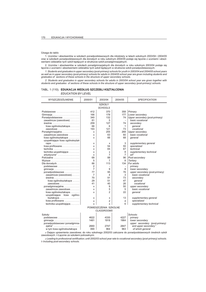 TABL. 1 (110). EDUKACJA WED£UG SZCZEBLI KSZTA£CENIA