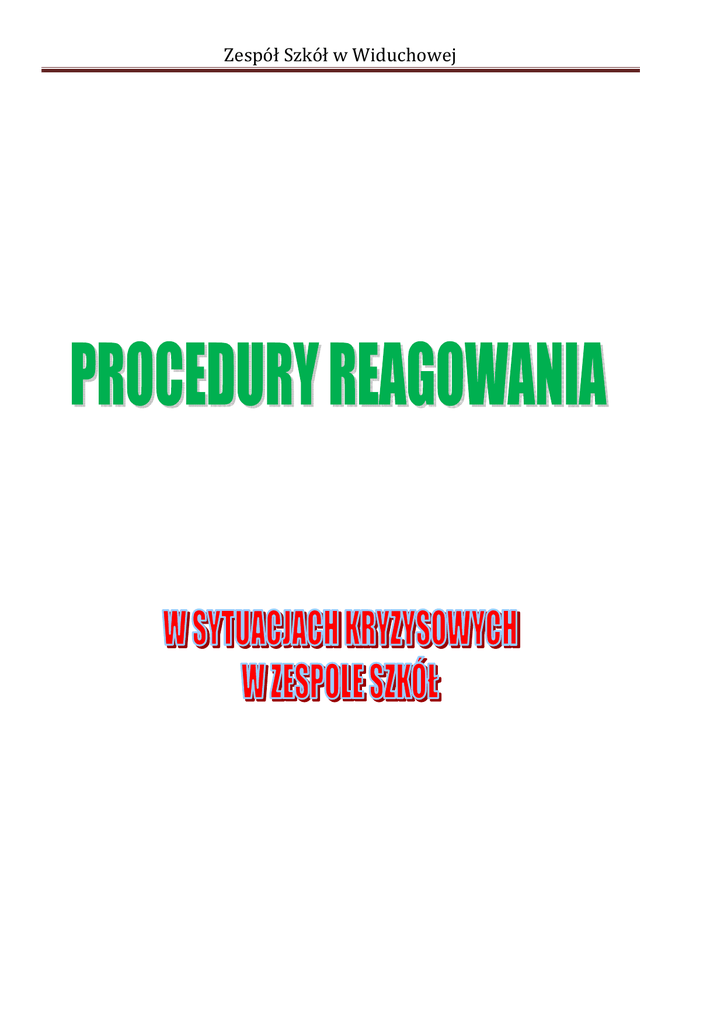 Zespół Szkół w Widuchowej Zespół Szkół w Widuchowej Procedura postępowania w przypadku, gdy uczeń obraża nauczyciela lub pracownika szkoły 1. Zgłoszenie problemu wychowawcy (wpis uwagi do dziennika) 2. Rozmowa wychowawcy z uczniem na temat niewłaściwego zachowania. 3. Jeśli uczeń wyrazi chęć poprawy (naprawienia błędu) problem wygasa – ale uczeń jest pod obserwacją. 4. Jeżeli uczeń przeprosi i obieca poprawę, nie dojdzie do obniżenia oceny z zachowania (rehabilitacja). 5. W przypadku, gdy uczeń wykazuje bierna postawę, powiadamiani są rodzice z prośbą o kontakt (przybycie do szkoły), wychowawca odnotowuje w dzienniku. 6. Osoba obrażana ma prawo wnieść pozew z powództwa cywilnego (w przypadku braku konsensusu). Koszt sądowy ponosi obrażona osoba. _______________________ Procedury postępowania w sytuacji ucieczek i wagarów z lekcji oraz świetlicy 1. Wychowawca przeprowadza z uczniem rozmowę, której celem jest poznanie przyczyny wagarów, ucieczek z lekcji oraz stanu świadomości ucznia dotyczącej konsekwencji dokonywanych wyborów i podejmowanych decyzji. 2. Wychowawca informuje rodziców (prawnych opiekunów) o nieusprawiedliwionych nieobecnościach ucznia w szkole. 3. Jeżeli nie występuje poprawa frekwencji, wychowawca przekazuje pedagogowi wykaz uczniów z podaną informacją o skali problemu, podjętych przez siebie działaniach, efektach tychże działań, sytuacji szkolnej i rodzinnej ucznia. 4. Pedagog podejmuje działania wobec ucznia i jego rodziców. 5. Po wyczerpaniu możliwości oddziaływania szkoły na ucznia i jego rodziców, przy braku pożądanych zmian w realizacji obowiązku szkolnego, pedagog kieruje sprawę ucznia do Sądu Rodzinnego i Nieletnich. _______________ Procedury postępowania nauczycieli W sytuacjach zagrożenia dzieci i młodzieży demoralizacją W przypadku uzyskania informacji, że uczeń przejawia zachowania świadczące o jego demoralizacji (naruszanie zasad współżycia społecznego, popełnienie czynu zabronionego, systematycznie uchylanie się od spełniania obowiązku szkolnego, włóczęgostwo, udział w działalności grup przestępczych) nauczyciel powinien podjąć następujące kroki: 1. przekazuje uzyskaną informację wychowawcy klasy, 2. wychowawca informuje o fakcie wymienionym w ust. I pedagoga szkolnego i dyrekcję szkoły, Zespół Szkół w Widuchowej 3. wychowawca wzywa do szkoły rodziców ucznia i przekazuje im uzyskaną informację, wychowawca wraz z pedagogiem (lub dyrektorem) przeprowadza rozmowę z rodzicami oraz w ich obecności z uczniem, zobowiązuje pisemnie ucznia do zaniechania negatywnego postępowania, a rodziców do bezwzględnego nadzoru nad dzieckiem, 4. wychowawca z pedagogiem sporządzają notatkę z przeprowadzonych czynności i umieszczają w dokumentacji pedagoga, 5. jeżeli rodzice odmawiają współpracy z kadrą pedagogiczną szkoły lub nie reagują na wezwania do stawiennictwa w szkole, a nadal z wiarygodnych źródeł napływają informacje o wymienionych w ust. I przejawach demoralizacji, szkoła pisemnie powiadamia o zaistniałej sytuacji sąd rodzinny lub policję, 6. w sytuacji, gdy szkoła wykorzysta wszystkie dostępne jej źródła oddziaływań wychowawczych i ich zastosowanie nie przynosi oczekiwanych rezultatów, szkoła pisemnie powiadamia o zaistniałej sytuacji sąd rodzinny lub policję, 7. w przypadku uzyskania informacji o popełnieniu przez ucznia, który ukończył 17 lat, przestępstwa ściganego z urzędu lub udziału w działalności grup przestępczych, szkoła jako instytucja jest zobowiązana do niezwłocznego zawiadomienia o tym prokuratury lub policji. _____________ Procedura reagowania interwencyjnego wobec przemocy rówieśniczej w Zespole Szkół w Widuchowej. 1. W sytuacjach zachowania agresywnego ze strony ucznia nauczyciel będący świadkiem zdarzenia zobowiązany jest do natychmiastowego odizolowania sprawcy od ofiary i przerwania aktu przemocy. 2. W razie wyższej konieczności nauczyciel wysyła innego ucznia w celu sprowadzenia w miejsce zajścia drugiej osoby dorosłej (dyrektora szkoły, innego nauczyciela, wychowawcy klasy, pedagoga szkolnego, itp.). 3. Nauczyciel zapewnia bezpieczeństwo i ewentualną konieczną pomoc medyczną wszystkim uczestnikom zajścia. 4. O zaistniałej sytuacji nauczyciel powiadamia wychowawcę klasy, a w przypadku nieobecności wychowawcy – sam podejmuje dalsze działania. 5. Nauczyciel sporządza notatkę służbową z przebiegu zdarzenia i przekazuje wychowawcy ucznia, która pozostaje w teczce wychowawcy. 6. Wychowawca klasy podejmuje kontakt z rodzicami (prawnymi opiekunami) ucznia powiadamiając o zaistniałej sytuacji. 7. O przebiegu zdarzenia wychowawca powiadamia pedagoga lub psychologa szkolnego oraz dyrektora szkoły. Zespół Szkół w Widuchowej 8. W sytuacji niemożności przerwania agresji ze strony ucznia lub przewidywania kontynuacji zachowań agresywnych pedagog, psycholog, wychowawca klasy lub dyrektor zobowiązany jest do natychmiastowego wezwania do szkoły przedstawiciela policji i niezwłocznego powiadomienia o tym fakcie rodziców (prawnych opiekunów) ucznia. 9. Wychowawca klasy wraz z pedagogiem szkolnym przeprowadza ze sprawcą zajścia rozmowę dyscyplinującą, z której sporządzić należy notatkę służbową. 10. W przypadku wystąpienia powtarzających się aktów agresji ze strony tego samego ucznia wychowawca klasy (pedagog lub psycholog szkolny) zobowiązany jest do podjęcia współpracy z instytucjami wspierającymi pracę szkoły: Poradnią Psychologiczno – Pedagogiczną w Gryfinie, Komisariatem Policji. 11. O wszystkich podejmowanych działaniach należy na bieżąco informować rodziców (prawnych opiekunów) ucznia w formie pisemnej. 12. Zespół wychowawczy zobowiązany jest do analizy tych zachowań uczniów w trakcie posiedzeń zespołu w celu wypracowywania jednolitych oddziaływań wychowawczych. Środki zaradcze: - Rozmowy z pedagogiem. Udzi