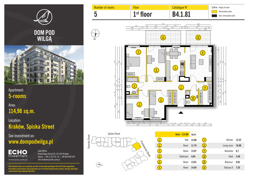 Number of rooms Floor Catalogue N° 5 1 floor B4.1.81 st 2,70 m - Heigh of room Removable walls Non-removable walls 11 12 5 8 7 6 4 1 Apartment: 5-rooms 9 10 2 Area: 3 114,98 sq.m. Location: See investment on: i o śn ie S tree t This brochure does not constitute an offer in the understanding of the Civil Code regulations. Presented visualizations and projections are of strictly demonstrative nature. During realization some details may undergo alteration. e dw Sale Office: Krasickiego Street 30, 30-503 Kraków phone: +48 12 637 81 18, +48 664 900 414 [email protected] Spiska Street Area - 114,98 sq.m. 1 Hall 14,98 7 Kitchen 13,22 2 Room 11,76 8 Living room 19,88 3 Room 12,97 9 Wardrobe 4 Bathroom 4,04 10 Toilet 3,48 5 Room 13,91 11 Balcony I 9,91 6 Room 14,04 12 Balcony II 7,55 Pr z www.dompodwilga.pl Orawska Street Kraków, Spiska Street 6,7