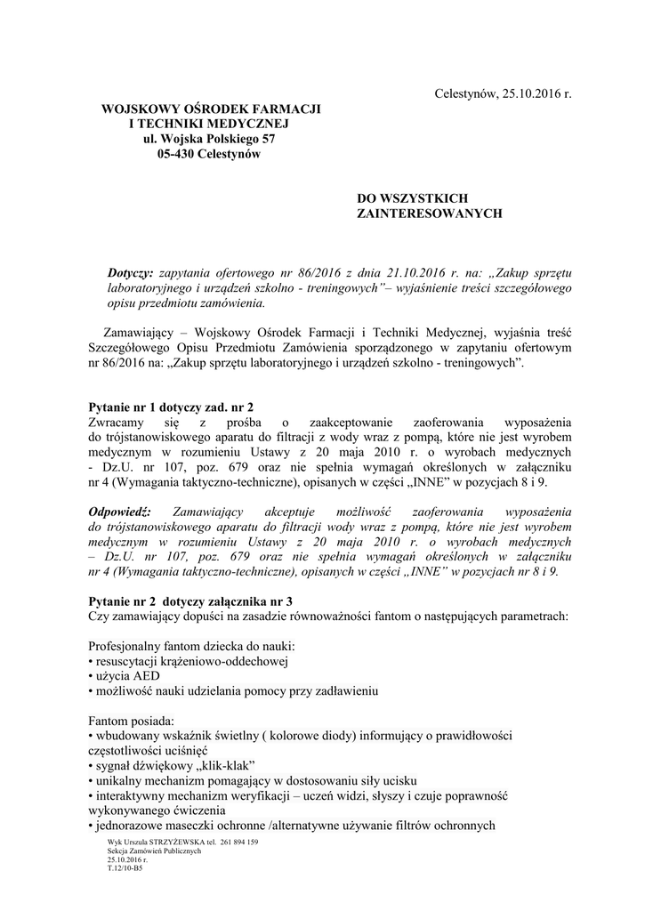 Celestynów, 25.10.2016 r. WOJSKOWY OŚRODEK FARMACJI I TECHNIKI MEDYCZNEJ ul. Wojska Polskiego 57 05-430 Celestynów DO WSZYSTKICH ZAINTERESOWANYCH Dotyczy: zapytania ofertowego nr 86/2016 z dnia 21.10.2016 r. na: „Zakup sprzętu laboratoryjnego i urządzeń szkolno - treningowych”– wyjaśnienie treści szczegółowego opisu przedmiotu zamówienia. Zamawiający – Wojskowy Ośrodek Farmacji i Techniki Medycznej, wyjaśnia treść Szczegółowego Opisu Przedmiotu Zamówienia sporządzonego w zapytaniu ofertowym nr 86/2016 na: „Zakup sprzętu laboratoryjnego i urządzeń szkolno - treningowych”. Pytanie nr 1 dotyczy zad. nr 2 Zwracamy się z prośba o zaakceptowanie zaoferowania wyposażenia do trójstanowiskowego aparatu do filtracji z wody wraz z pompą, które nie jest wyrobem medycznym w rozumieniu Ustawy z 20 maja 2010 r. o wyrobach medycznych - Dz.U. nr 107, poz. 679 oraz nie spełnia wymagań określonych w załączniku nr 4 (Wymagania taktyczno-techniczne), opisanych w części „INNE” w pozycjach 8 i 9. Odpowiedź: Zamawiający akceptuje możliwość zaoferowania wyposażenia do trójstanowiskowego aparatu do filtracji wody wraz z pompą, które nie jest wyrobem medycznym w rozumieniu Ustawy z 20 maja 2010 r. o wyrobach medycznych – Dz.U. nr 107, poz. 679 oraz nie spełnia wymagań określonych w załączniku nr 4 (Wymagania taktyczno-techniczne), opisanych w części „INNE” w pozycjach nr 8 i 9. Pytanie nr 2 dotyczy załącznika nr 3 Czy zamawiający dopuści na zasadzie równoważności fantom o następujących parametrach: Profesjonalny fantom dziecka do nauki: • resuscytacji krążeniowo-oddechowej • użycia AED • możliwość nauki udzielania pomocy przy zadławieniu Fantom posiada: • wbudowany wskaźnik świetlny ( kolorowe diody) informujący o prawidłowości częstotliwości uciśnięć • sygnał dźwiękowy „klik-klak” • unikalny mechanizm pomagający w dostosowaniu siły ucisku • interaktywny mechanizm weryfikacji – uczeń widzi, słyszy i czuje poprawność wykonywanego ćwiczenia • jednorazowe maseczki ochronne /alternatywne używanie filtrów ochronnych Wyk Urszula STRZYŻEWSKA tel. 261 894 159 Sekcja Zamówień Publicznych 25.10.2016 r. T.12/10-B5 • Realistyczny profesjonalny trening technik resuscytacji: • realistyczne odwzorowanie anatomii i fizjonomii człowieka • widoczne i wyczuwalne anatomiczne punkty orientacyjne (żebra, mostek, sutki), szybkie i łatwe odnalezienie właściwego miejsca ucisku i przyklejenia elektrod AED • konieczność odchylenia głowy w celu prawidłowego udrożnienia dróg oddechowych • widoczne unoszenie i opadanie klatki piersiowej w czasie wentylacji • uciśnięcie nadbrzusza - możliwość nauki udzielania pomocy przy zadławieniu • widoczna relaksacja klatki piersiowej potwierdzająca poprawną głębokość masażu Zestaw zawiera: fantom (tors +głowa) dziecka ze wskaźnikiem, 10 maseczek ochronnych, 10 dróg oddechowych, 2 baterie AA oraz nylonową torbę transportową. Odpowiedź: Zamawiający nie wyraża zgody na zaoferowanie w/w fantomu. Pytanie nr 3 dotyczy WTT pkt. INNE ppkt. 1 Czy zamawiający zrezygnuje z zapisu autoryzowanego serwisu gwarancyjnego na terenie Polski i dopuści Wykonawcę, który zapewni opiekę serwisową przez cały okres gwarancji? Odpowiedź: Zamawiający pozostaje przy wymaganiach zawartych w WTT. Pytanie nr 4 dotyczy WTT pkt. INNE ppkt. 5 Czy Zamawiający zmieni zapis odnośnie czasu reakcji serwisu od momentu zgłoszenia do momentu rozpoczęcia naprawy z max 72h na 5 dni roboczych? Odpowiedź: Zamawiający pozostaje przyw wymaganiach zawartych w WTT. KOMENDANT WOJSKOWEGO OŚRODKA FARMACJI I TECHNIKI MEDYCZNEJ Z upoważnienia ZASTĘPCA KOMENDANTA ppłk Piotr LEWANDOWSKI Wyk Urszula STRZYŻEWSKA tel. 261 894 159 Sekcja Zamówień Publicznych 25.10.2016 r. T.12/10-B5