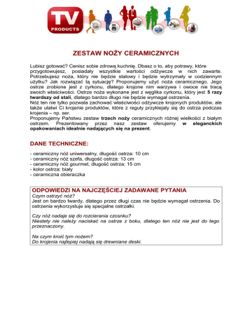 ZESTAW NOŻY CERAMICZNYCH Lubisz gotować? Cenisz sobie zdrową kuchnię. Dbasz o to, aby potrawy, które przygotowujesz, posiadały wszystkie wartości odżywcze w nich zawarte. Potrzebujesz noża, który nie będzie stalowy i będzie wytrzymały w codziennym użytku? Jak rozwiązać tą sytuację? Proponujemy użyć noża ceramicznego. Jego ostrze zrobione jest z cyrkonu, dlatego krojone nim warzywa i owoce nie tracą swoich właściwości. Ostrze noża wykonane jest z węglika cyrkonu, który jest 5 razy twardszy od stali, dlatego bardzo długo nie będzie wymagał ostrzenia. Nóż ten nie tylko pozwala zachować właściwości odżywcze krojonych produktów, ale także ułatwi Ci krojenie produktów, które z reguły przyklejały się do ostrza podczas krojenia – np. ser. Proponujemy Państwu zestaw trzech noży ceramicznych różnej wielkości z białym ostrzem. Prezentowany przez nasz zestaw oferujemy w eleganckich opakowaniach idealnie nadających się na prezent. DANE TECHNICZNE: - ceramiczny nóż uniwersalny, długość ostrza: 10 cm - ceramiczny nóż szefa, długość ostrza: 13 cm - ceramiczny nóż gourmet, długość ostrza: 15 cm - kolor ostrza: biały - ceramiczna obieraczka ODPOWIEDZI NA NAJCZĘŚCIEJ ZADAWANE PYTANIA Czym ostrzyć nóż? Jest on bardzo twardy, dlatego przez długi czas nie będzie wymagał ostrzenia. Do ostrzenia wykorzystuje się specjalne ostrzałki. Czy nóż nadaje się do rozcierania czosnku? Niestety nie należy naciskać na ostrze z boku, dlatego ten nóż nie jest do tego przeznaczony. Na czym kroić tym nożem? Do krojenia najlepiej nadają się drewniane deski.