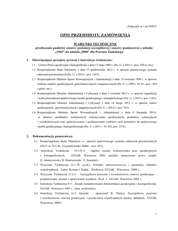 Załącznik nr 1 do SIWZ OPIS PRZEDMIOTU ZAMÓWIENIA WARUNKI TECHNICZNE przeliczenia punktów osnowy poziomej szczegółowej i osnowy pomiarowej z układu „1965” do układu,,2000” dla Powiatu Żnińskiego 1. Obowiązujące przepisy prawne i instrukcje techniczne: 1.1 Ustawa Prawo geodezyjne i kartograficzne z dnia 17 maja 1989 r. (Dz. U. z 2015 r., poz. 520 ze zm.). 1.2 Rozporządzenie Rady Ministrów z dnia 15 października 2012 r. w sprawie państwowego systemu odniesień przestrzennych (Dz. U. z 2012 r. poz. 1247). 1.3 Rozporządzenie Ministra Spraw Wewnętrznych i Administracji z dnia 15 kwietnia 1999 r. w sprawie ochrony znaków geodezyjnych, grawimetrycznych i magnetycznych (Dz. U. z 1999 r. Nr 45 , poz . 454 z późn. zm.). 1.4 Rozporządzenie Ministra Administracji i Cyfryzacji z dnia 5 września 2013 r. w sprawie organizacji i trybu prowadzenia państwowego zasobu geodezyjnego i kartograficznego (Dz. U. z 2013 r. poz. 1183). 1.5 Rozporządzenie Ministra Administracji i Cyfryzacji z dnia 14 lutego 2012 r. w sprawie osnów geodezyjnych , grawimetrycznych i magnetycznych (Dz. U. z 2012 r., poz. 352). 1.6 Rozporządzenie Ministra Spraw Wewnętrznych i Administracji z dnia 9 listopada 2011r. w sprawie standardów technicznych wykonywania geodezyjnych pomiarów sytuacyjnych i wysokościowych oraz opracowywania i przekazywania wyników tych pomiarów do państwowego zasobu geodezyjnego i kartograficznego (Dz. U. z 2011 r. Nr 263, poz. 1572). 2. Dokumentacja pomocnicza: 2.1 Rozporządzenie Rady Ministrów w sprawie państwowego systemu odniesień przestrzennych (Dz.U nr 70 z dn. 24 października 2000r., poz. 821). 2.2 Instrukcja Techniczna i kartograficznych. O-1/O-2: GUGiK Ogólne zasady wykonywania prac geodezyjnych Warszawa 2001 (projekt opracowany przez zespół: Z. Adamczewski, R. Staniszewski, Z. Szumski). 2.3 Wytyczne Techniczne G-1.10 (n.ed.): Formuły odwzorowawcze i parametry układów współrzędnych. Autor: Roman J. Kadaj, Wydawca: GUGiK, Warszawa, 2000 r. 2.4 Wytyczne Techniczne G-2.5: Szczegółowa pozioma i wysokościowa osnowa geodezyjna – projektowanie, pomiar i opracowanie wyników. Wyd. 1, GUGiK Warszawa 2002 r. 2.5 Instrukcja Techniczna 0-3: Zasady kompletowania dokumentacji geodezyjnej i kartograficznej. GUGiK Warszawa 1985 r. (mat. archiwalny). 2.6 Instrukcja Techniczna G-2 (projekt – opracował R. Pażus): Szczegółowa pozioma i wysokościowa osnowa geodezyjna i przeliczenia współrzędnych miedzy układami. GUGiK Warszawa, 2000 r. 1 3. Cel i zakres prac. 3.1 Celem prac jest: 3.1.1 Zeskanowanie operatów technicznych związanych z osnową szczegółową i pomiarową 3.1.2 Dokładna weryfikacja punktów z bazy osnowy szczegółowej zaadaptowanych z prac Zbiornik Wodny Folusz – KERG 80/75 i Trasa Czewujewo – Izdebno – Wola - KERG 99/84 (około 60 pkt). 3.1.3 Przeliczenie punktów osnowy III klasy dla Powiatu Żnińskiego wykonane metodą ścisłego wyrównania sieci. Metodę transformacyjną dopuszcza się jedynie w sytuacji braku danych obserwacyjnych (dla pozostałej części sieci III klasy) oraz dla osnowy pomiarowej. 3.1.4 Transformacja punktów do układu 2000. 3.1.5 Aktualizacja banku osnów o współrzędne z układu 2000 w systemie TurboEWID 8.5 oraz wydruki tych punktów na podkładach map topograficznych otrzymanych z PODGiK. 3.2 Zakres prac do wykonania w ramach zlecenia: 3.2.1 Zeskanowanie operatów technicznych związanych z osnową szczegółową i pomiarową. 3.2.2 Pomiar metodą GPS około 60 punktów z bazy osnowy szczegółowej zaadaptowanych z prac Zbiornik Wodny Folusz – KERG 80/75 i Trasa Czewujewo – Izdebno – Wola KERG 99/84 . 3.2.3 Przeliczenie punktów poziomej osnowy III klasy dla Powiatu Żnińskiego powinno być wykonane zasadniczo metodą ścisłego wyrównania sieci. Metodę transformacyjną dopuszcza się jedynie w sytuacji braku danych obserwacyjnych (dla pozostałej części sieci III klasy) oraz dla osnowy pomiarowej. 3.2.4 Metoda ścisła [ jednoczesne, ścisłe wyrównanie osnowy poziomej III klasy w układzie „2000” lub „1992” (w drugim przypadku - z matematyczną transformacją do układu „2000” ) wraz z analizą dokładności i niezawodności sieci ]. 3.2.5 Przeliczenie punktów pozostałych III klasy oraz osnowy pomiarowej do układu „2000” przy wykorzystaniu jako punktów dostosowania wszystkich punktów klasy wyższej, zgodnie z ogólnymi zasadami ujętymi w przepisach. 3.2.6 Skompletowanie operatu z wykonanych prac i przekazanie do Powiatowego Ośrodka Dokumentacji Geodezyjnej i Kartograficznej w Żninie. 4. Charakterystyka obiektu Obszar opracowania: teren Powiatu Żnińskiego oraz części gmin sąsiednich, na których znajdują się punkty nawiązania ciągów poligonowych; Powierzchnia geodezyjna Powiatu Żnińskiego - 98448 ha; Gminy: Barcin, Janowiec Wlkp., Gąsawa, Łabiszyn, Rogowo, Żnin; Obręby ewidencyjne – 144; 2 Klasa II 235 Klasa III 2060 szacunkowo 15000 Osnowa szczegółowa Osnowa pomiarowa 5. Analiza istniejącej dokumentacji geodezyjnej 5.1.1 Szczegółowa osnowa pozioma I i II klasy Osnowa pozioma I i II klasy została przekazana do zasobu PODGiK w Żninie w 2000 roku przez Urząd Wojewódzki w Bydgoszczy. Posiadamy również bazę osnowy poziomej II w układzie 2000 przekazaną przez CODGiK. 5.1.2 Szczegółowa osnowa pozioma III klasy Szczegółowa osnowa pozioma III klasy w Powiecie Żnińskim usystematyzowana jest w pracy geodezyjnej ZB-1-119/96. Celem pracy było zebranie zaadaptowanie istniejących osnów, dodanie nowych punktów osnowy, pomiar i wyrównanie do osnowy wyższego rzędu II klasy. Efektem jest zebranie wszystkich punktów osnowy 6 gmin tj. Żnina, Janowca Wlkp., Gąsawy, Rogowa, Barcina i Łabiszyna w jeden obiekt o oznaczeniu 4644. Do obiektu 4644 – osnowy III klasy zaadaptowano następujące ciągi poligonowe z prac geodezyjnych: 1. Struga Ryszewska – KERG 226/87 2. Trasa Świątkowo – Tonowo - Izdebno – Ks. rob. WBG RoVIII-7423/35/