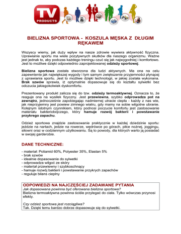BIELIZNA SPORTOWA - KOSZULA MĘSKA Z DŁUGIM RĘKAWEM Wszyscy wiemy, jak duży wpływ na nasze zdrowie wywiera aktywność fizyczna. Uprawianie sportu ma wiele pozytywnych skutków dla naszego organizmu. Ważne jest jednak to, aby podczas każdego treningu czuć się jak najwygodniej i komfortowo. Jest to możliwe dzięki odpowiednio zaprojektowanej odzieży sportowej. Bielizna sportowa została stworzona dla ludzi aktywnych. Ma ona na celu zapewnienie jak największej wygody i tym samym zwiększenie przyjemności płynącej z uprawiania sportu. Jest to możliwe dzięki technologii, w jakiej została wykonana. Brak szwów sprawia, iż optymalnie dopasowuje się do kształtu sylwetki bez odczucia jakiegokolwiek dyskomfortu. Prezentowany produkt zalicza się do tzw. odzieży termoaktywnej. Oznacza to, że reaguje ona na wysiłek fizyczny. Jest przewiewna, szybko odprowadza pot na zewnątrz, jednocześnie zapobiegając nadmiernej utracie ciepła - każdy z nas wie, jak nieprzyjemny jest powiew zimnego wiatru, gdy mamy na sobie wilgotne ubranie. Kolejnym istotnym czynnikiem, który podnosi poczucie komfortu jest zastosowanie materiału bakteriobójczego, który hamuje rozwój bakterii i powstawanie przykrego zapachu. Odzież sportowa znajdzie zastosowanie praktycznie w każdej dziedzinie sportu: jeździe na nartach, jedzie na rowerze, wędrówce po górach, piłce nożnej, joggingu, siłowni oraz w codziennym użytkowaniu. Są to powody, dla których warto ją posiadać w swojej garderobie. DANE TECHNICZNE: - materiał: Poliamid 60%, Polyester 35%, Elastan 5% - brak szwów - idealnie dopasowanie do sylwetki - odprowadza wilgoć ze skóry - materiał przewiewny i szybkoschnący - hamuje rozwój bakterii i powstawanie przykrych zapachów - reguluje bilans cieplny ODPOWIEDZI NA NAJCZĘŚCIEJ ZADAWANE PYTANIA Jak dopasowana powinna być oferowana bielizna sportowa? Bielizna termoaktywna powinna ściśle przylegać do ciała. Tylko wówczas przynosi efekty. Czy odzież sportowa jest rozciągliwa? Tak. Dzięki temu bardzo dobrze dopasowuje się do sylwetki.