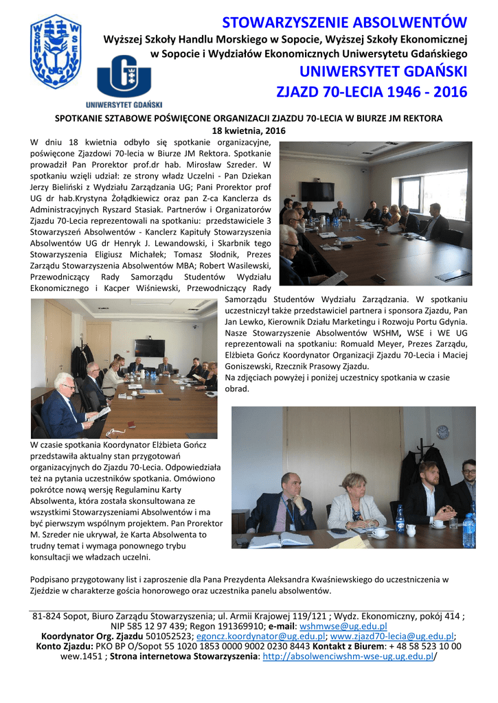 STOWARZYSZENIE ABSOLWENTÓW Wyższej Szkoły Handlu Morskiego w Sopocie, Wyższej Szkoły Ekonomicznej w Sopocie i Wydziałów Ekonomicznych Uniwersytetu Gdańskiego UNIWERSYTET GDAŃSKI ZJAZD 70-LECIA 1946 - 2016 SPOTKANIE SZTABOWE POŚWIĘCONE ORGANIZACJI ZJAZDU 70-LECIA W BIURZE JM REKTORA 18 kwietnia, 2016 W dniu 18 kwietnia odbyło się spotkanie organizacyjne, poświęcone Zjazdowi 70-lecia w Biurze JM Rektora. Spotkanie prowadził Pan Prorektor prof.dr hab. Mirosław Szreder. W spotkaniu wzięli udział: ze strony władz Uczelni - Pan Dziekan Jerzy Bieliński z Wydziału Zarządzania UG; Pani Prorektor prof UG dr hab.Krystyna Żołądkiewicz oraz pan Z-ca Kanclerza ds Administracyjnych Ryszard Stasiak. Partnerów i Organizatorów Zjazdu 70-Lecia reprezentowali na spotkaniu: przedstawiciele 3 Stowarzyszeń Absolwentów - Kanclerz Kapituły Stowarzyszenia Absolwentów UG dr Henryk J. Lewandowski, i Skarbnik tego Stowarzyszenia Eligiusz Michałek; Tomasz Słodnik, Prezes Zarządu Stowarzyszenia Absolwentów MBA; Robert Wasilewski, Przewodniczący Rady Samorządu Studentów Wydziału Ekonomicznego i Kacper Wiśniewski, Przewodniczący Rady Samorządu Studentów Wydziału Zarządzania. W spotkaniu uczestniczył także przedstawiciel partnera i sponsora Zjazdu, Pan Jan Lewko, Kierownik Działu Marketingu i Rozwoju Portu Gdynia. Nasze Stowarzyszenie Absolwentów WSHM, WSE i WE UG reprezentowali na spotkaniu: Romuald Meyer, Prezes Zarządu, Elżbieta Gończ Koordynator Organizacji Zjazdu 70-Lecia i Maciej Goniszewski, Rzecznik Prasowy Zjazdu. Na zdjęciach powyżej i poniżej uczestnicy spotkania w czasie obrad. W czasie spotkania Koordynator Elżbieta Gończ przedstawiła aktualny stan przygotowań organizacyjnych do Zjazdu 70-Lecia. Odpowiedziała też na pytania uczestników spotkania. Omówiono pokrótce nową wersję Regulaminu Karty Absolwenta, która została skonsultowana ze wszystkimi Stowarzyszeniami Absolwentów i ma być pierwszym wspólnym projektem. Pan Prorektor M. Szreder nie ukrywał, że Karta Absolwenta to trudny temat i wymaga ponownego trybu konsultacji we władzach uczelni. Podpisano przygotowany list i zaproszenie dla Pana Prezydenta Aleksandra Kwaśniewskiego do uczestniczenia w Zjeździe w charakterze gościa honorowego oraz uczestnika panelu absolwentów. 81-824 Sopot, Biuro Zarządu Stowarzyszenia; ul. Armii Krajowej 119/121 ; Wydz. Ekonomiczny, pokój 414 ; NIP 585 12 97 439; Regon 191369910; e-mail: [email protected] Koordynator Org. Zjazdu 501052523; [email protected]; [email protected]; Konto Zjazdu: PKO BP O/Sopot 55 1020 1853 0000 9002 0230 8443 Kontakt z Biurem: + 48 58 523 10 00 wew.1451 ; Strona internetowa Stowarzyszenia: http://absolwenciwshm-wse-ug.ug.edu.pl/ STOWARZYSZENIE ABSOLWENTÓW Wyższej Szkoły Handlu Morskiego w Sopocie, Wyższej Szkoły Ekonomicznej w Sopocie i Wydziałów Ekonomicznych Uniwersytetu Gdańskiego UNIWERSYTET GDAŃSKI ZJAZD 70-LECIA 1946 - 2016 Partnerzy organizacji Zjazdu poinformowali o podejmowanych przez siebie działaniach w celu promowania tego wydarzenia. Pan Rzecznik przekazał informację o kolejnych patronatach dla Zjazdu. Patronem zostało PTE i trwają rozmowy z Giełdą Papierów Wartościowych. Z zadowoleniem przyjęto informację o nawiązaniu partnerskiej współpracy z Instytutem Badań nad Gospodarką Rynkową. Uczestnicy spotkania zostali zaopatrzeni w plakaty Zjazdowe, które zostały wydrukowane na prośbę Samorządów Studentów, celem zainteresowania studentów wydarzeniem i współorganizacją Zjazdu. Każdy z Partnerów otrzymał plakaty celem promocji wydarzenia w swojej siedzibie. Za zgodą Biura Kanclerza plakaty będą eksponowane na Wydziałach Zarządzania, Ekonomicznym, Nauk Społecznych i w Bibliotekach UG. Plakat demonstrujemy poniżej. Uczestnicy spotkania zostali zaopatrzeni w plakaty Zjazdowe, które zostały wydrukowane na prośbę Samorządów Studentów, celem zainteresowania studentów wydarzeniem i współorganizacją Zjazdu. Każdy z Partnerów otrzymał plakaty celem promocji wydarzenia w swojej siedzibie. Za zgodą Biura Kanclerza plakaty będą eksponowane na Wydziałach Zarządzania, Ekonomicznym, Nauk Społecznych i w Bibliotekach UG. Spotkanie stało się też okazją do wręczenia zaproszeń na Zjazd dla Wszystkich Rektorów i Prorektorów oraz także dla Partnerów obecnych na spotkaniu. 81-824 Sopot, Biuro Zarządu Stowarzyszenia; ul. Armii Krajowej 119/121 ; Wydz. Ekonomiczny, pokój 414 ; NIP 585 12 97 439; Regon 191369910; e-mail: [email protected] Koordynator Org. Zjazdu 501052523; [email protected]; [email protected]; Konto Zjazdu: PKO BP O/Sopot 55 1020 1853 0000 9002 0230 8443 Kontakt z Biurem: + 48 58 523 10 00 wew.1451 ; Strona internetowa Stowarzyszenia: http://absolwenciwshm-wse-ug.ug.edu.pl/ STOWARZYSZENIE ABSOLWENTÓW Wyższej Szkoły Handlu Morskiego w Sopocie, Wyższej Szkoły Ekonomicznej w Sopocie i Wydziałów Ekonomicznych Uniwersytetu Gdańskiego UNIWERSYTET GDAŃSKI ZJAZD 70-LECIA 1946 - 2016 Omówiono kwestię gadżetów reklamowych UG dla uczestników Zjazdu. Przyjęto deklarację Kanclerza Ryszarda Stasiaka, że możliwości zaopatrzenia organizatorów Zjazdu w bloki do notatek, długopisy i pendrivy z logiem UG zostaną pilnie przeanalizowane i otrzymamy decyzję w tej sprawie. Przedmiotem ustaleń była także forma umów sponsoringowych i zwolnienia przelewów z tego tytułu z narzutów na koszty stałe, jeśli stroną umowy sponsoringowej byłby Uniwersytet a nie Stowarzyszenie. Ustalono dalsze działania co do promocji wydarzenia w sieci LinkedIn i Facebook. Ustalono, że plakaty będą ponownie wydrukowane i eksponowane na początku czerwca w wersji zaktualizowanej. Na zakończenie spotkania wykonano zdjęcia grupowe uczestników spotkania, które prezentujemy poniżej. W czasie spotkania ustalono także termin posiedzenia Jury Konkursu Kół Naukowych, któremu przewodniczy Pan Prorektor Prof. Mirosław Szreder. Posiedzenie to odbędzie się w