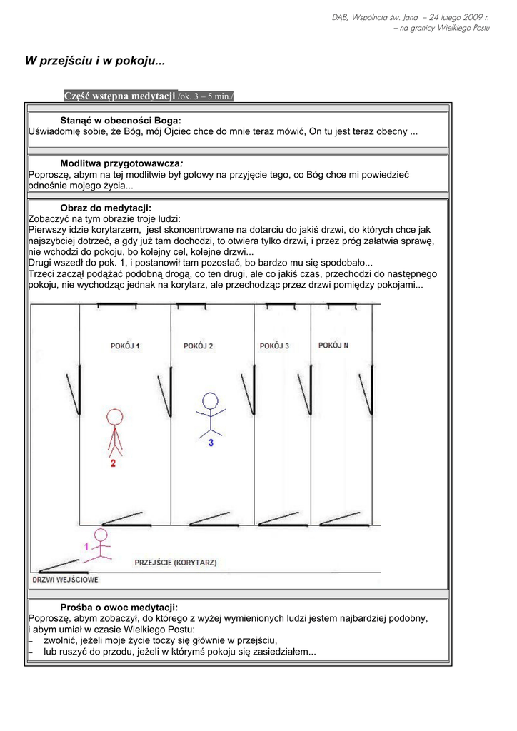 DĄB, Wspólnota św. Jana – 24 lutego 2009 r. – na granicy Wielkiego Postu W przejściu i w pokoju... Część wstępna medytacji /ok. 3 – 5 min./ Stanąć w obecności Boga: Uświadomię sobie, że Bóg, mój Ojciec chce do mnie teraz mówić, On tu jest teraz obecny ... Modlitwa przygotowawcza: Poproszę, abym na tej modlitwie był gotowy na przyjęcie tego, co Bóg chce mi powiedzieć odnośnie mojego życia... Obraz do medytacji: Zobaczyć na tym obrazie troje ludzi: Pierwszy idzie korytarzem, jest skoncentrowane na dotarciu do jakiś drzwi, do których chce jak najszybciej dotrzeć, a gdy już tam dochodzi, to otwiera tylko drzwi, i przez próg załatwia sprawę, nie wchodzi do pokoju, bo kolejny cel, kolejne drzwi... Drugi wszedł do pok. 1, i postanowił tam pozostać, bo bardzo mu się spodobało... Trzeci zaczął podążać podobną drogą, co ten drugi, ale co jakiś czas, przechodzi do następnego pokoju, nie wychodząc jednak na korytarz, ale przechodząc przez drzwi pomiędzy pokojami... Prośba o owoc medytacji: Poproszę, abym zobaczył, do którego z wyżej wymienionych ludzi jestem najbardziej podobny, i abym umiał w czasie Wielkiego Postu: – zwolnić, jeżeli moje życie toczy się głównie w przejściu, – lub ruszyć do przodu, jeżeli w którymś pokoju się zasiedziałem... Część właściwa medytacji /ok. 25 min./ 1) W przejściu (na korytarzu) (1) Zobaczyć Przyjrzeć się drodze pierwszego człowieka... (2) Rozważyć ● Na ile wchodzę do danego pokoju i w nim „siadam”, i wypełniam go swoją obecnością, a na ile jestem już przy innych drzwiach, w innym pokoju? ○ Na ile robiąc coś, jestem cały w tym, co robię? Na ile rozmawiając z kimś, jestem w tej rozmowie obecny? itd. 2) Zatrzymanie się w jednym pokoju → piekło (1) Zobaczyć Wtedy Piotr rzekł do Jezusa: Rabbi, dobrze, że tu jesteśmy; postawimy trzy namioty (...) (Mk 9,5) (5) (2) Rozważyć Nie jest dobre życie na korytarzu, ale nie jest też dobre zatrzymanie się w jednym pokoju – postawienia sobie namiotu, w nadziei, że to coś, co sprawia, że mi jest dobrze, zatrzymam na długo (na zawsze)... taki pokój (namiot) z czasem staje się... piekłem... ● Czy ja się nie zasiedziałem, w jakimś pokoju: w swoich wyobrażeniach o czymś, wśród jakichś ludzi, w swojej wizji dnia dzisiejszego i jutrzejszego – czy to coś nie staje (stało się) moim piekłem? 3) Z pokoju do pokoju → POKÓJ (1) Zobaczyć (...) z obłoku odezwał się głos: To jest mój Syn umiłowany, Jego słuchajcie. (Mk 9,7) Wstańcie, idźmy stąd!” (J 14,31) On bowiem jest naszym pokojem. (Ef 2,14) (2) Rozważyć Nie mogąc zostać w jednym pokoju, pozostaje mi jedno – Jego słuchać, ale żeby Jego słuchać, trzeba za Nim podążać, On mówi tylko: Wstańmy i idźmy stąd!, ale nie mówi gdzie mnie doprowadzi... Ta droga za Nim (i z Nim) , to przechodzenie z pokoju do pokoju wiąże się z zagrożeniem: przeciągi, zmiana klimatu, inni ludzie, inne otoczenie... i dlatego, w tych szczególnych chwilach, muszę trzymać się blisko Niego... Zmiany i podążanie naprzód jest konieczne... ● Jak przeżywam zmiany, które zachodzą w moim życiu? ● Czy w tych chwilach staram się szukać zrozumienia u Tego, który mnie prowadzi? W drodze przez wszystkie pokoje mojego życia, nie może mi towarzyszyć żadna osoba (rzecz, cokolwiek), są takie osoby, z którymi przejdę przez wiele pokoi, ale nigdy przez wszystkie... Nigdy już nie wrócę do tego samego pokoju, do tych samych warunków... zawsze będzie coś nowego... Ta droga wymaga konkretnych decyzji, odnośnie tego jak długo pozostawać w danym pokoju, i tego kiedy udać się w dalszą drogę zostawiając za sobą, to co było... To decyzje prowadzą do POKOJU... ● Jaką decyzję powinienem podjąć dziś? Zawsze jest do podjęcia jakaś decyzja, zawsze jest jakieś „miejsce”, o którym powinienem świadomie zadecydować: pozostaje, albo: idę stąd... Pyszny i chciwy nigdy nie zaznają spokoju; pokorny i ubogi duchem pozostaje w wielkim pokoju. (T. a Kempis, O naśladowaniu Chrystusa, I,6) ROZMOWA KOŃCOWA Można porozmawiać z Jezusem, który jest naszym POKOJEM, lub z Bogiem-Ojcem; odnośnie tego, co w czasie tej medytacji (1) zobaczyłem i (2) rozważyłem...