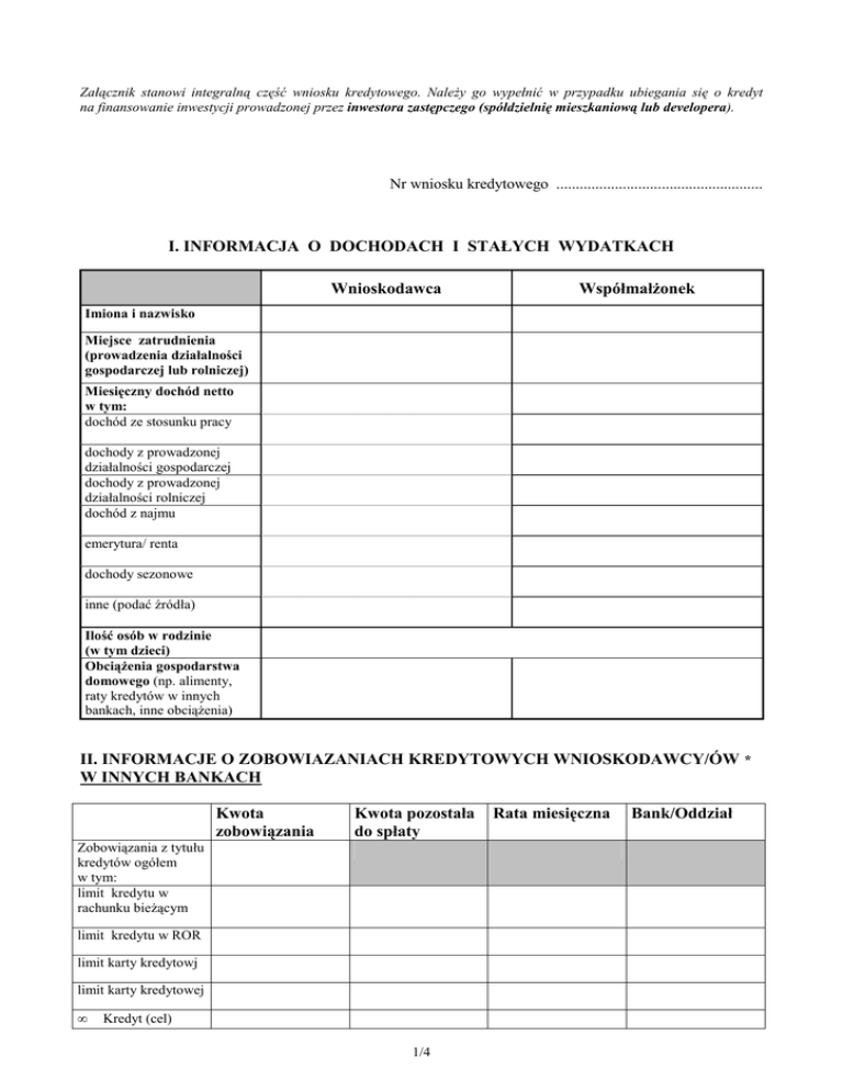 Załącznik stanowi integralną część wniosku kredytowego. NaleŜy go wypełnić w przypadku ubiegania się o kredyt na finansowanie inwestycji prowadzonej przez inwestora zastępczego (spółdzielnię mieszkaniową lub developera). Nr wniosku kredytowego ..................................................... I. INFORMACJA O DOCHODACH I STAŁYCH WYDATKACH Wnioskodawca WspółmałŜonek Imiona i nazwisko Miejsce zatrudnienia (prowadzenia działalności gospodarczej lub rolniczej) Miesięczny dochód netto w tym: dochód ze stosunku pracy dochody z prowadzonej działalności gospodarczej dochody z prowadzonej działalności rolniczej dochód z najmu emerytura/ renta dochody sezonowe inne (podać źródła) Ilość osób w rodzinie (w tym dzieci) ObciąŜenia gospodarstwa domowego (np. alimenty, raty kredytów w innych bankach, inne obciąŜenia) II. INFORMACJE O ZOBOWIAZANIACH KREDYTOWYCH WNIOSKODAWCY/ÓW * W INNYCH BANKACH Kwota zobowiązania Kwota pozostała do spłaty Zobowiązania z tytułu kredytów ogółem w tym: limit kredytu w rachunku bieŜącym limit kredytu w ROR limit karty kredytowj limit karty kredytowej • Kredyt (cel) 1/4 Rata miesięczna Bank/Oddział ………………........… Kredyt (cel) ……………................ Kredyt (cel) …………………........ III. INFORMACJE O POSIADANYCH RACHUNKACH WNIOSKODAWCY/ ÓW* W INNYCH BANKACH Nazwa Banku Nr rachunku IV. INFORMACJE O POSIADANYM MAJĄTKU WNIOSKODAWCY/ ÓW* (NIE DOTYCZY OSÓB POSIADAJĄCYCH GOSPODARSTWA ROLNE) 1. Nieruchomości (rodzaj, adres, przybliŜona wartość rynkowa, nr KW i Sąd prowadzący) ......................... ....................................................................................................................................................................... ....................................................................................................................................................................... 2. Pojazdy (marka, rok produkcji, przybliŜona wartość rynkowa) .................................................................. ....................................................................................................................................................................... ....................................................................................................................................................................... 3. Oszczędności, (kwota, waluta, okres lokaty), papiery wartościowe (ilość, wartość) .................................. ....................................................................................................................................................................... ....................................................................................................................................................................... 4. Inne (wymienić) ........................................................................................................................................... ....................................................................................................................................................................... OŚWIADCZENIE Oświadczam, Ŝe: 1) Zobowiązuję się do załoŜenia księgi wieczystej niezwłocznie po uzyskaniu tytułu własności do lokalu/domu; 2) Dokonam zabezpieczenia kredytu hipoteką na lokalu/domu objętym wnioskiem, po załoŜeniu księgi wieczystej dla tego lokalu /domu, w przypadku gdy zabezpieczeniem kredytu będzie hipoteka; 3) Ubezpieczę dom /lokal od ognia i innych zdarzeń losowych, oraz dokonam cesji praw z umowy ubezpieczenia na rzecz Banku w całym okresie kredytowania tj. do czasu całkowitej spłaty kredytu; w przypadku gdy zabezpieczeniem kredytu będzie cesja praw z umowy ubezpieczenia; 4) Ubiegam się o kredyt/ poŜyczkę w innym banku (nazwa i adres banku, cel kredytu, wnioskowana kwota kredytu i termin spłaty, proponowane zabezpieczenia spłaty kredytu): ......................................................................................................................................................................................... ......................................................................................................................................................................................... 5) Posiadam inne zobowiązania (alimenty, poŜyczki, poręczenia, gwarancje – w stosunku do kogo i w jakiej wysokości): ........................................................................................................................................................................................ ........................................................................................................................................................................................ 2/4 ZAŁĄCZNIKI Wraz z wnioskiem o kredyt składam następujące dokumenty: 1) umowę z developerem lub spółdzielnią mieszkaniową wraz z zobowiązaniem spółdzielni mieszkaniowej lub developera do przeniesienia tytułu własności lokalu/ domu jednorodzinnego po zakończeniu budowy, 2) dokumenty dotyczące spółdzielni lub developera: wyciąg z rejestru spółdzielni/wyciąg z rejestru handlowego/ zaświadczenie o wpisie działalności gospodarczej x 3) zaświadczenie ze spółdzielni mieszkaniowej lub developera oxx: a) stanie zaawansowania budowy, b) całkowitym koszcie domu lub lokalu mieszkalnego, c) kwocie wniesionej przedpłaty, 4) aktualny odpis (z datą wydania nie wcześniejszą niŜ 3 miesiące przed złoŜeniem wniosku o kredyt) czterech działów księgi wieczystej (w przypadku braku księgi wieczystej - zaświadczenie sądu o zbiorze dokumentów, a w przypadku braku zbioru dokumentów - dowód własności gruntu lub nabycia prawa uŜytkowania wieczystego gruntu i dowód własności budynku lub lokalu oraz opłacony wniosek o załoŜenie księgi wieczystej wraz z dowode