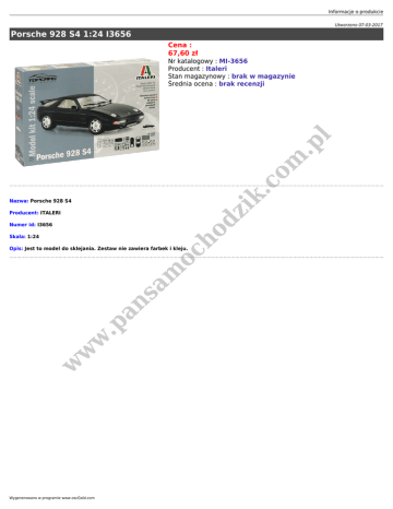 Informacje o produkcie Utworzono 07-03-2017 Porsche 928 S4 1:24 I3656 Cena : 67,60 zł dz ik .c om .p l Nr katalogowy : MI-3656 Producent : Italeri Stan magazynowy : brak w magazynie Średnia ocena : brak recenzji Nazwa: Porsche 928 S4 Producent: ITALERI ho Numer id: I3656 Skala: 1:24 w w w .p an sa m oc Opis: Jest to model do sklejania. Zestaw nie zawiera farbek i kleju. Wygenerowano w programie www.oscGold.com