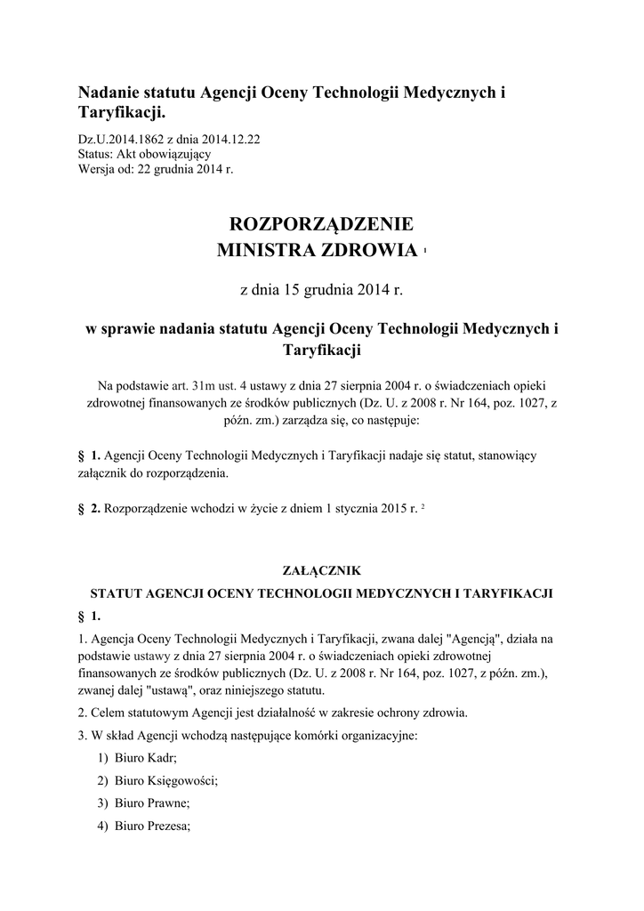 Nadanie statutu Agencji Oceny Technologii Medycznych i Taryfikacji. Dz.U.2014.1862 z dnia 2014.12.22 Status: Akt obowiązujący Wersja od: 22 grudnia 2014 r. ROZPORZĄDZENIE MINISTRA ZDROWIA 1 z dnia 15 grudnia 2014 r. w sprawie nadania statutu Agencji Oceny Technologii Medycznych i Taryfikacji Na podstawie art. 31m ust. 4 ustawy z dnia 27 sierpnia 2004 r. o świadczeniach opieki zdrowotnej finansowanych ze środków publicznych (Dz. U. z 2008 r. Nr 164, poz. 1027, z późn. zm.) zarządza się, co następuje: § 1. Agencji Oceny Technologii Medycznych i Taryfikacji nadaje się statut, stanowiący załącznik do rozporządzenia. § 2. Rozporządzenie wchodzi w życie z dniem 1 stycznia 2015 r. 2 ZAŁĄCZNIK STATUT AGENCJI OCENY TECHNOLOGII MEDYCZNYCH I TARYFIKACJI § 1. 1. Agencja Oceny Technologii Medycznych i Taryfikacji, zwana dalej "Agencją", działa na podstawie ustawy z dnia 27 sierpnia 2004 r. o świadczeniach opieki zdrowotnej finansowanych ze środków publicznych (Dz. U. z 2008 r. Nr 164, poz. 1027, z późn. zm.), zwanej dalej "ustawą", oraz niniejszego statutu. 2. Celem statutowym Agencji jest działalność w zakresie ochrony zdrowia. 3. W skład Agencji wchodzą następujące komórki organizacyjne: 1) Biuro Kadr; 2) Biuro Księgowości; 3) Biuro Prawne; 4) Biuro Prezesa; 5) Biuro Obsługi Rady Przejrzystości i Rady do spraw Taryfikacji; 6) Wydział Oceny Technologii Medycznych; 7) Wydział Taryfikacji; 8) Wydział Informatyki; 9) Samodzielne Stanowisko Pracy Rzecznika Prasowego; 10) Samodzielne Stanowisko Pracy do spraw Audytu Wewnętrznego. § 2. 1. Prezesowi Agencji bezpośrednio podlegają komórki organizacyjne, o których mowa w § 1 ust. 3 pkt 1-5 oraz 9 i 10. 2. Zastępcy Prezesa Agencji do spraw Oceny Technologii Medycznych bezpośrednio podlega komórka organizacyjna, o której mowa w § 1 ust. 3 pkt 6. 3. Zastępcy Prezesa Agencji do spraw Taryfikacji bezpośrednio podlegają komórki organizacyjne, o których mowa w § 1 ust. 3 pkt 7 i 8. 4. Prezesa Agencji, w razie jego nieobecności, zastępuje wskazany przez niego Zastępca Prezesa Agencji. § 3. 1. Do zadań zastępców Prezesa Agencji należy: 1) planowanie i organizowanie realizacji zadań podległych komórek organizacyjnych; 2) koordynacja działalności podległych komórek organizacyjnych; 3) rozstrzyganie o sposobie załatwiania spraw przez podległe komórki organizacyjne; 4) występowanie do Prezesa Agencji z wnioskami w sprawach personalnych pracowników podległych komórek organizacyjnych; 5) przygotowywanie sprawozdań i informacji dotyczących prac podległych komórek organizacyjnych w zakresie i terminach określonych przez Prezesa Agencji; 6) wykonywanie innych poleceń Prezesa Agencji. 2. Zastępcy Prezesa Agencji reprezentują Agencję na zewnątrz w zakresie udzielonego przez Prezesa Agencji upoważnienia. § 4. Szczegółowy zakres działania komórek organizacyjnych, o których mowa w § 1 ust. 3, ich wewnętrzną organizację oraz tryb pracy określa regulamin organizacyjny nadany przez Prezesa Agencji. Minister Zdrowia kieruje działem administracji rządowej - zdrowie, na podstawie § 1 ust. 2 rozporządzenia Prezesa Rady Ministrów z dnia 22 września 2014 r. w sprawie szczegółowego zakresu działania Ministra Zdrowia (Dz. U. poz. 1268). 1 Niniejsze rozporządzenie było poprzedzone rozporządzeniem Ministra Zdrowia z dnia 18 sierpnia 2009 r. w sprawie nadania statutu Agencji Oceny Technologii Medycznych (Dz. U. Nr 133, poz. 1102 oraz z 2014 r. poz. 168), które traci moc z dniem wejścia w życie ustawy z dnia 22 lipca 2014 r. o zmianie ustawy o świadczeniach opieki zdrowotnej finansowanych ze środków publicznych oraz niektórych innych ustaw (Dz. U. poz. 1138 i 1491). 2