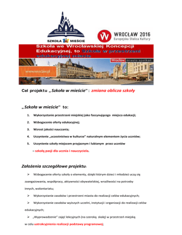Cel projektu „ Szkoła w mieście” : zmiana oblicza szkoły „ Szkoła w mieście” to: 1. Wykorzystanie przestrzeni miejskiej jako fascynującego miejsca edukacji; 2. Wzbogacenie oferty edukacyjnej; 3. Wzrost jakości nauczania; 4. Uczynienie „uczestnictwa w kulturze” naturalnym elementem życia uczniów; 5. Uczynienie szkoły miejscem przyjaznym i lubianym przez uczniów – szkołą pasji dla ucznia i nauczyciela. Założenia szczegółowe projektu: Wzbogacenie oferty szkoły o elementy, dzięki którym dzieci i młodzież uczą się zaangażowania, współpracy, aktywności obywatelskiej, wrażliwości na potrzeby innych, wolontariatu; Wykorzystanie zasobów i przestrzeni miasta do realizacji celów edukacyjnych; Wykorzystanie zasobów wyższych uczelni, instytucji i organizacji do realizacji celów edukacyjnych; „Wyprowadzenie” zajęć lekcyjnych (na szeroką skalę) w przestrzeń miejską w celu uatrakcyjnienia realizacji podstawy programowej; Realizacja podstawy programowej: Tworzenie sytuacji sprzyjających poznawaniu otoczenia, w którym przebywa uczeń, instytucji i obiektów, z których będzie w przyszłości korzystał; Umożliwianie uczniowi udziału w różnych wydarzeniach społecznych i kulturalnych w roli odbiorcy i twórcy kultury, uczenie przy tym wyrażania swoich przeżyć i emocji; Przybliżanie tradycji i obyczajów lokalnych, narodowych, rozbudzanie poczucia przynależności do społeczności lokalnej, regionu, kraju; Umożliwianie poznawania środowiska przyrodniczego, budzenie zainteresowania i szacunku dla otaczającej przyrody i wychowanie do życia w harmonii z przyrodą; Wspieranie rozwoju sprawności psychofizycznej uczniów, prowadzenie zajęć niezbędnych do rozwoju psychoruchowego.