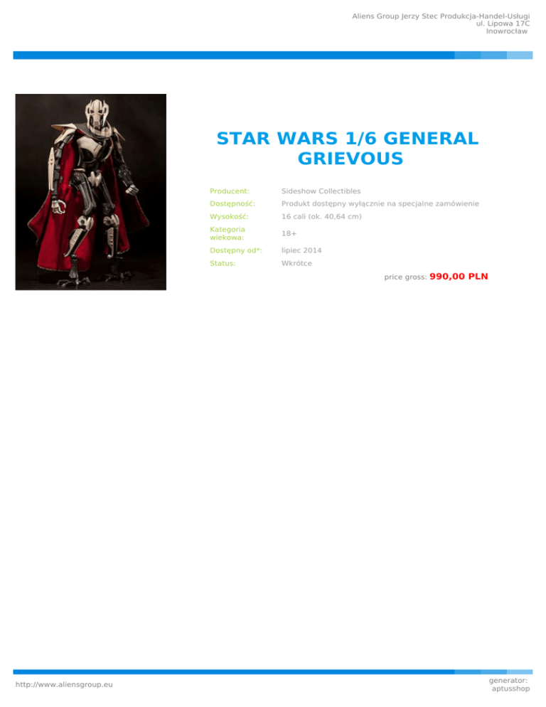 Aliens Group Jerzy Stec Produkcja-Handel-Usługi ul. Lipowa 17C Inowrocław STAR WARS 1/6 GENERAL GRIEVOUS Producent: Sideshow Collectibles Dostępność: Produkt dostępny wyłącznie na specjalne zamówienie Wysokość: 16 cali (ok. 40,64 cm) Kategoria wiekowa: 18+ Dostępny od*: lipiec 2014 Status: Wkrótce price gross: http://www.aliensgroup.eu 990,00 PLN generator: aptusshop