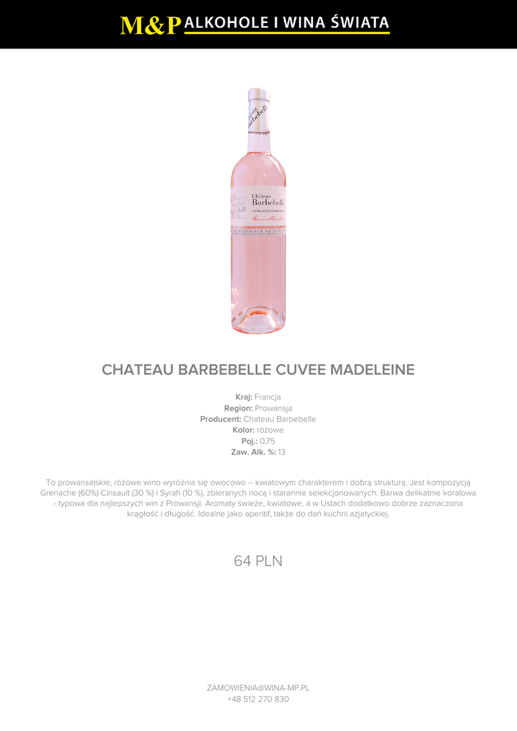 CHATEAU BARBEBELLE CUVEE MADELEINE Kraj: Francja Region: Prowansja Producent: Chateau Barbebelle Kolor: różowe Poj.: 0,75 Zaw. Alk. %: 13 To prowansalskie, różowe wino wyróżnia się owocowo – kwiatowym charakterem i dobrą strukturą. Jest kompozycją Grenache (60%) Cinsault (30 %) i Syrah (10 %), zbieranych nocą i starannie selekcjonowanych. Barwa delikatnie koralowa - typowa dla najlepszych win z Prowansji. Aromaty świeże, kwiatowe, a w Ustach dodatkowo dobrze zaznaczona krągłość i długość. Idealne jako aperitif, także do dań kuchni azjatyckiej. 64 PLN [email protected] +48 512 270 830