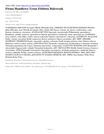 Adres URL strony http://www.adresyfirm.net/25020 Firma Handlowa Tytan Elżbieta Balcerzak Łęczyca, 99-100, woj. łódzkie Ulica: Staromiejska 5 Telefon: 247213310 Fax: 247213310 Strona www: http://www.tytangostynin.pl NARZĘDZIA RĘCZNE Szczypce Młotki Wkrętaki Inne, oSPRZĘT DO ELEKTRONARZĘDZI Wiertła i dłuta SDS plus, max Wiertła do metalu: hSS, cobalt, hM Tarcze: ścierne, do cięcia i szlifowania, i inne Korony wiertnicze, otwornice, sPAWALNICTWO Spawarki i prostowniki Półautomaty spawalnicze Reduktory, palniki, uchwyty spawalnicze Osprzęt spawalniczy (elektrody, druty spawalnicze). ZAWIESIA Liny stalowe, celne Haki, szekle, kausze Łańcuchy Ogniwa zatrzaskowe i skręcane, eLEMENTY ZŁĄCZNE Śruby, wkręty, gwoździe Kołki rozporowe Kotwy metalowe Złącza ciesielskie, aRT. BHP i ŚRODKI OCHRONY OSOBISTEJ Kaski, nauszniki i okulary ochronne Szelki bezpieczeństwa i liny Odzież robocza Rękawice robocze (duży wybór), pNEUMATYKA Sprężarki i kompresory Szybkozłącza i elementy instalacji Narzędzia pneumatyczne Części zamienne (presostaty, wyłączniki), mASZYNY BUDOWLANE Betoniarki i mieszalniki Zagęszczarki i ubijaki Narzędzia brukarskie, aRT. METALOWE Kłódki Zamki Zawiasy Zasuwy i wrzeciądze, iNNE Pojemniki warsztatowe Narzędzia warsztatowe Artykuły pomiarowe i malarskie Klucze, zestawy nakładek Wózki, zestawy kołowe. ELEKTRONARZĘDZIA BOSCH EINHELL SKIL METABO MAKITA DeWALT CELMA, pONADTO W NASZEJ OFERCIE ART. FIRM: beta Stanley Wiha Wera Honiton King Tony. Kategorie: Przemysł i energetyka Łęczyca, Narzędzia Łęczyca Słowa kluczowe: elektronarzędzia, narzędzia, osprzęt, hurt Numer ID: 25020, liczba odsłon: 144, aktywacja: 15/12/2010 06:54:42, edycja: 15/12/2010 06:54:42 Strona 1 / 1