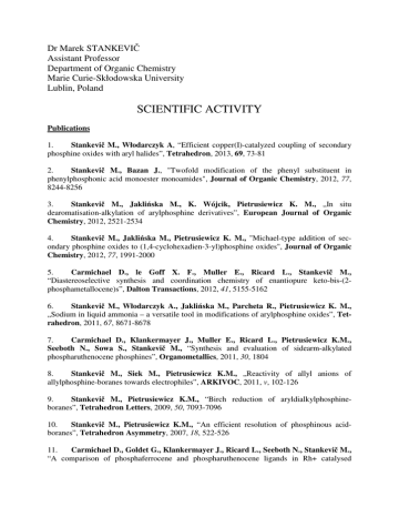 Dr Marek STANKEVIČ Assistant Professor Department of Organic Chemistry Marie Curie-Skłodowska University Lublin, Poland SCIENTIFIC ACTIVITY Publications 1. Stankevič M., Włodarczyk A, “Efficient copper(I)-catalyzed coupling of secondary phosphine oxides with aryl halides”, Tetrahedron, 2013, 69, 73-81 2. Stankevič M., Bazan J., "Twofold modification of the phenyl substituent in phenylphosphonic acid monoester monoamides", Journal of Organic Chemistry, 2012, 77, 8244-8256 3. Stankevič M., Jaklińska M., K. Wójcik, Pietrusiewicz K. M., „In situ dearomatisation-alkylation of arylphosphine derivatives”, European Journal of Organic Chemistry, 2012, 2521-2534 4. Stankevič M., Jaklińska M., Pietrusiewicz K. M., "Michael-type addition of secondary phosphine oxides to (1,4-cyclohexadien-3-yl)phosphine oxides", Journal of Organic Chemistry, 2012, 77, 1991-2000 5. Carmichael D., le Goff X. F., Muller E., Ricard L., Stankevič M., “Diastereoselective synthesis and coordination chemistry of enantiopure keto-bis-(2phosphametallocene)s”, Dalton Transactions, 2012, 41, 5155-5162 6. Stankevič M., Włodarczyk A., Jaklińska M., Parcheta R., Pietrusiewicz K. M., „Sodium in liquid ammonia – a versatile tool in modifications of arylphosphine oxides”, Tetrahedron, 2011, 67, 8671-8678 7. Carmichael D., Klankermayer J., Muller E., Ricard L., Pietrusiewicz K.M., Seeboth N., Sowa S., Stankevič M., “Synthesis and evaluation of sidearm-alkylated phospharuthenocene phosphines”, Organometallics, 2011, 30, 1804 8. Stankevič M., Siek M., Pietrusiewicz K.M., „Reactivity of allyl anions of allylphosphine-boranes towards electrophiles”, ARKIVOC, 2011, v, 102-126 9. Stankevič M., Pietrusiewicz K.M., “Birch reduction of aryldialkylphosphineboranes”, Tetrahedron Letters, 2009, 50, 7093-7096 10. Stankevič M., Pietrusiewicz K.M., “An efficient resolution of phosphinous acidboranes”, Tetrahedron Asymmetry, 2007, 18, 522-526 11. Carmichael D., Goldet G., Klankermayer J., Ricard L., Seeboth N., Stankevič M., “A comparison of phosphaferrocene and phospharuthenocene ligands in Rh+ catalysed enamide hydrogenations. Superior performance of the phospharuthenocene”, Chemistry - a European Journal, 2007, 13, 5492-5502 12. Stankevič M., Pietrusiewicz K.M., „Resolution and stereochemistry of tertbutylphenylphosphinous acid-borane”, Journal of Organic Chemistry, 2007, 72, 816-822 13. Mattiza J., Albert D., Stankevič M., Dziuba K., Szmigielska A., Pietrusiewicz K.M., Duddeck H., „Rh2[(R)-(+)-MTPA]4 as NMR Auxiliary for the Enantiodifferentiation of Chiral Secondary and Tertiary Phosphine-Borane Complexes“, Tetrahedron Asymmetry, 2006, 17, 2689-2696 14. Stankevič M., Pietrusiewicz K.M., “Synteza i reaktywność kwasów boranatofosfinawych”, Wiadomości Chemiczne, 2006, 60, 323-343 15. Pietrusiewicz K.M., Stankevič M., “Phosphinous acid-boranes”, Current Organic Chemistry, 2005, 9, 1883-1897 16. Stankevič M., Pietrusiewicz K.M., “The synthesis and reactivity of phosphinous acid-boranes”, Synthesis, 2005, 1279-1290 17. Stankevič M., Andrijewski G., Pietrusiewicz K.M., “Direct conversion of secphosphine oxides into phosphinous acid-boranes“, Synlett, 2004, 311-315 18. Stankevič M., Pietrusiewicz K.M., “An expedient reduction of sec-phosphine oxides to sec-phosphine-boranes by BH3-SMe2“, Synlett, 2003, 1012-1016 19. Stankiewicz M., Nycz J., Rachoń J., „Reductive cleavage of the halogen-phosphorus and sulfur-phosphorus bonds with alkali metals”, Heteroatom Chemistry, 2002, 13, 330-339 Books and book chapters 1. Stankevič M., Pietrusiewicz K.M., “1,1-Bis(phosphorus-functionalized) allenes” w: Science of Synthesis (Houben-Weyl), Vol. 24, Ch. 24.1.15, 81-83 2. Stankevič M., Pietrusiewicz K.M., “1-Phosphorus-functionalized 1-haloalk-1-enes” w: Science of Synthesis (Houben-Weyl), Vol. 24, Ch. 24.2.5, 285-292 3. Stankevič M., Pietrusiewicz K.M., “1-Nitrogen-functionalized 1-phosphorusfunctionalized alk-1-enes” w: Science of Synthesis (Houben-Weyl), Vol. 24, Ch. 24.2.18, 767-773 4. Stankevič M., Pietrusiewicz K.M., “1,1-Bis(phosphorus-functionalized) alk-1-enes” w: Science of Synthesis (Houben-Weyl), Vol. 24, Ch. 24.2.19, 775-779 5. Pietrusiewicz K.M., Stankevič M., “1-Phosphorus-functionalized alk-1-ynes” w: Science of Synthesis (Houben-Weyl), Vol. 24, Ch. 24.4.5, 1073-1085 6. Pietrusiewicz K.M., Stankevič M., „Dialkylphosphinous Acids and Derivatives” w: Science of Synthesis (Houben-Weyl), Vol. 42, Ch. 42.7, 221-241 7. Pietrusiewicz K.M., Stankevič M., „Alkylphosphonous Acids and Derivatives” w: Science of Synthesis (Houben-Weyl), Vol. 42, Ch. 42.8, 243-274 8. Stankevič M., Pietrusiewicz K.M., “Phosphorous Acid and Derivatives” w: Science of Synthesis (Houben-Weyl), Vol. 42, Ch. 42.9, 275-346 Oral conference communications 1. Bazan J., Stankevič M., "Funkcjonalizacja podstawnika aromatycznego pochodnych kwasu fenylofosfonowego z wykorzystaniem metody bezpośredniego orto-metalowania", LV Zjazd Polskiego Towarzystwa Chemicznego, LV PTChem, 16-20 września 2011, Białystok 2. Stankevič M., Jaklińska M., Bazan J., „Phenyl at phosphorus - a good starting point for molecule modifications", 19th International Conference on Phosphorus Chemistry, ICPC 2012, 8-12 July 2012, Rotterdam, Holandia 3. Jaklińska M., Stankevič M., Pietrusiewicz K. M., „Zastosowanie produktów redukcji Bircha w syntezie ditlenków difosfin”, 29 Wiosenny Zjazd Sekcji Studenckiej PTChem,18-22 kwietnia 2012, Łazy 4. Stankevič M., Bazan J., „Wygodny sposób na podwójną modyfikację podstawnika aromatycznego estru etylowego N,N-dietyloamidu kwasu fenylofosfonowego”, 29 Wiosenny Zjazd Sekcji Studenckiej PTChem,18-22 kwietnia 2012, Łazy 5. Włodarczyk A., Stankevič M., Pietrusiewicz K. M., “Phenylphosphonous acidborane menthyl ester N,N-di-ethylamide - a novel reagent for enantiomerically pure phosphines and phosphinous acid derivatives