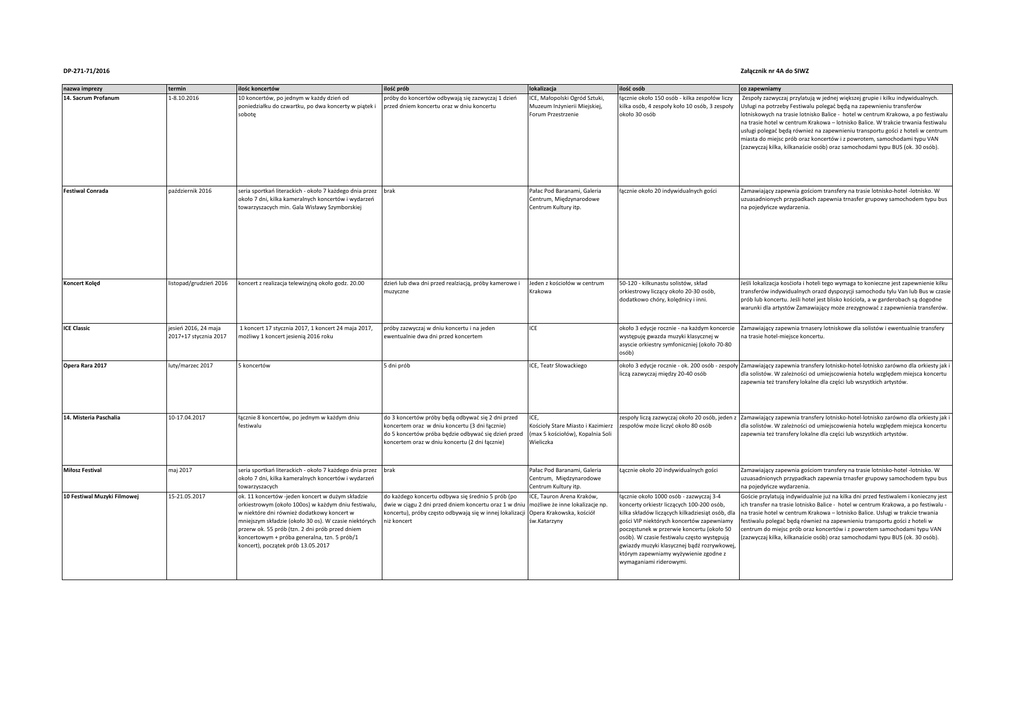 DP-271-71/2016 Załącznik nr 4A do SIWZ nazwa imprezy 14. Sacrum Profanum termin 1-8.10.2016 ilośc koncertów 10 koncertów, po jednym w każdy dzień od poniedziałku do czwartku, po dwa koncerty w piątek i sobotę ilość prób próby do koncertów odbywają się zazwyczaj 1 dzień przed dniem koncertu oraz w dniu koncertu lokalizacja ICE, Małopolski Ogród Sztuki, Muzeum Inżynierii Miejskiej, Forum Przestrzenie ilość osób łącznie około 150 osób - kilka zespołów liczy kilka osób, 4 zespoły koło 10 osób, 3 zespoły około 30 osób co zapewniamy Zespoły zazwyczaj przylatują w jednej większej grupie i kilku indywidualnych. Usługi na potrzeby Festiwalu polegać będą na zapewnieniu transferów lotniskowych na trasie lotnisko Balice - hotel w centrum Krakowa, a po festiwalu na trasie hotel w centrum Krakowa – lotnisko Balice. W trakcie trwania festiwalu usługi polegać będą również na zapewnieniu transportu gości z hoteli w centrum miasta do miejsc prób oraz koncertów i z powrotem, samochodami typu VAN (zazwyczaj kilka, kilkanaście osób) oraz samochodami typu BUS (ok. 30 osób). Festiwal Conrada październik 2016 seria sportkań literackich - około 7 każdego dnia przez około 7 dni, kilka kameralnych koncertów i wydarzeń towarzyszacych min. Gala Wisławy Szymborskiej brak Pałac Pod Baranami, Galeria Centrum, Międzynarodowe Centrum Kultury itp. łącznie około 20 indywidualnych gości Zamawiający zapewnia gościom transfery na trasie lotnisko-hotel -lotnisko. W uzuasadnionych przypadkach zapewnia trnasfer grupowy samochodem typu bus na pojedyńcze wydarzenia. Koncert Kolęd listopad/grudzień 2016 koncert z realizacja telewizyjną około godz. 20.00 dzień lub dwa dni przed realziacją, próby kamerowe i muzyczne Jeden z kościołów w centrum Krakowa 50-120 - kilkunastu solistów, skład orkiestrowy liczący około 20-30 osób, dodatkowo chóry, kolędnicy i inni. Jeśli lokalizacja kosćioła i hoteli tego wymaga to konieczne jest zapewnienie kilku transferów indywidualnych orazd dyspozycji samochodu tylu Van lub Bus w czasie prób lub koncertu. Jeśli hotel jest blisko kościoła, a w garderobach są dogodne warunki dla artystów Zamawiający może zrezygnować z zapewnienia transferów. ICE Classic jesień 2016, 24 maja 2017+17 stycznia 2017 1 koncert 17 stycznia 2017, 1 koncert 24 maja 2017, możliwy 1 koncert jesienią 2016 roku próby zazwyczaj w dniu koncertu i na jeden ewentualnie dwa dni przed koncertem ICE około 3 edycje rocznie - na każdym koncercie Zamawiający zapewnia trnasery lotniskowe dla solistów i ewentualnie transfery występuję gwazda muzyki klasycznej w na trasie hotel-miejsce koncertu. asyscie orkiestry symfoniczniej (około 70-80 osób) Opera Rara 2017 luty/marzec 2017 5 koncertów 5 dni prób ICE, Teatr Słowackiego około 3 edycje rocznie - ok. 200 osób - zespoły Zamawiający zapewnia transfery lotnisko-hotel-lotnisko zarówno dla orkiesty jak i liczą zazwyczaj między 20-40 osób dla solistów. W zależności od umiejscowienia hotelu względem miejsca koncertu zapewnia też transfery lokalne dla części lub wszystkich artystów. 14. Misteria Paschalia 10-17.04.2017 łącznie 8 koncertów, po jednym w każdym dniu festiwalu do 3 koncertów próby będą odbywać się 2 dni przed koncertem oraz w dniu koncertu (3 dni łącznie) do 5 koncertów próba będzie odbywać się dzień przed koncertem oraz w dniu koncertu (2 dni łącznie) ICE, Kościoły Stare Miasto i Kazimierz (max 5 kościołów), Kopalnia Soli Wieliczka zespoły liczą zazwyczaj około 20 osób, jeden z Zamawiający zapewnia transfery lotnisko-hotel-lotnisko zarówno dla orkiesty jak i zespołów może liczyć około 80 osób dla solistów. W zależności od umiejscowienia hotelu względem miejsca koncertu zapewnia też transfery lokalne dla części lub wszystkich artystów. Miłosz Festival maj 2017 seria sportkań literackich - około 7 każdego dnia przez około 7 dni, kilka kameralnych koncertów i wydarzeń towarzyszacych brak Pałac Pod Baranami, Galeria Centrum, Międzynarodowe Centrum Kultury itp. Łącznie około 20 indywidualnych gości Zamawiający zapewnia gościom transfery na trasie lotnisko-hotel -lotnisko. W uzuasadnionych przypadkach zapewnia trnasfer grupowy samochodem typu bus na pojedyńcze wydarzenia. 10 Festiwal Muzyki Filmowej 15-21.05.2017 ok. 11 koncertów -jeden koncert w dużym składzie orkiestrowym (około 100os) w każdym dniu festiwalu, w niektóre dni również dodatkowy koncert w mniejszym składzie (około 30 os). W czasie niektórych przerw ok. 55 prób (tzn. 2 dni prób przed dniem koncertowym + próba generalna, tzn. 5 prób/1 koncert), początek prób 13.05.2017 do każdego koncertu odbywa się średnio 5 prób (po dwie w ciągu 2 dni przed dniem koncertu oraz 1 w dniu koncertu), próby często odbywają się w innej lokalizacji niż koncert ICE, Tauron Arena Kraków, możliwe że inne lokalizacje np. Opera Krakowska, kościół św.Katarzyny łącznie około 1000 osób - zazwyczaj 3-4 koncerty orkiestr liczących 100-200 osób, kilka składów liczących kilkadziesiąt osób, dla gości VIP niektórych koncertów zapewniamy poczęstunek w przerwie koncertu (około 50 osób). W czasie festiwalu często występują gwiazdy muzyki klasycznej bądź rozrywkowej, którym zapewniamy wyżywienie zgodne z wymaganiami riderowymi. Goście przylatują indywidualnie już na kilka dni przed festiwalem i konieczny jest ich transfer na trasie lotnisko Balice - hotel w centrum Krakowa, a po festiwalu na trasie hotel w centrum Krakowa – lotnisko Balice. Usługi w trakcie trwania festiwalu polegać będą również na zapewnieniu transportu gości z hoteli w centrum do miejsc prób oraz koncertów i z powrotem samochodami typu VAN (zazwyczaj kilka, kilkanaście osób) oraz samochodami typu BUS (ok. 30 osób).