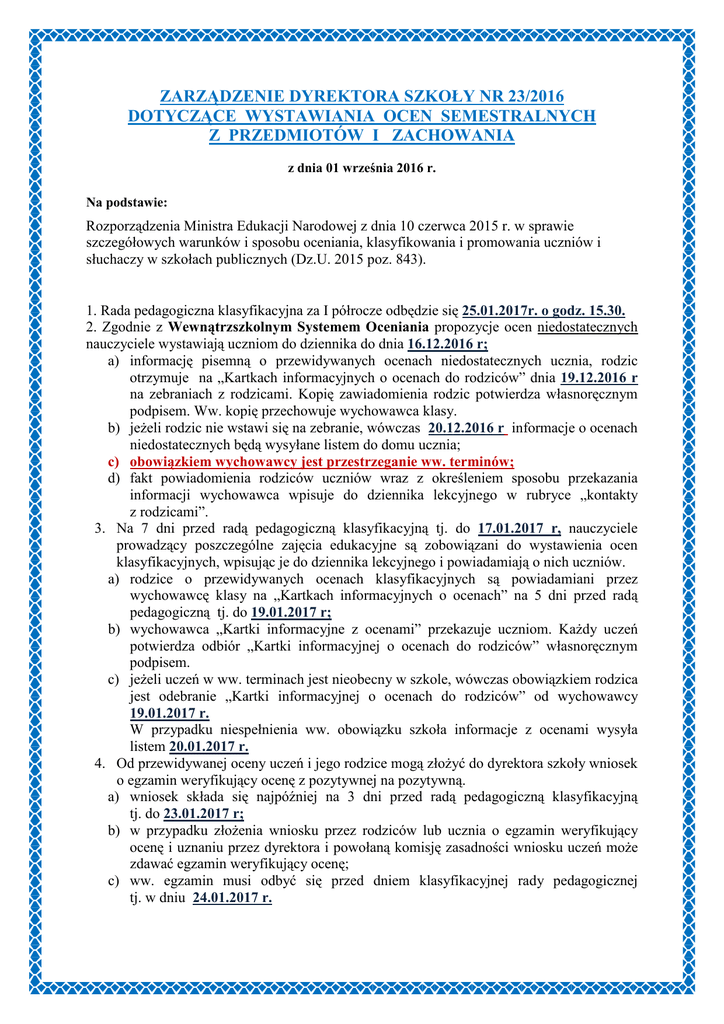 ZARZĄDZENIE DYREKTORA SZKOŁY NR 23/2016 DOTYCZĄCE WYSTAWIANIA OCEN SEMESTRALNYCH Z PRZEDMIOTÓW I ZACHOWANIA z dnia 01 września 2016 r. Na podstawie: Rozporządzenia Ministra Edukacji Narodowej z dnia 10 czerwca 2015 r. w sprawie szczegółowych warunków i sposobu oceniania, klasyfikowania i promowania uczniów i słuchaczy w szkołach publicznych (Dz.U. 2015 poz. 843). 1. Rada pedagogiczna klasyfikacyjna za I półrocze odbędzie się 25.01.2017r. o godz. 15.30. 2. Zgodnie z Wewnątrzszkolnym Systemem Oceniania propozycje ocen niedostatecznych nauczyciele wystawiają uczniom do dziennika do dnia 16.12.2016 r; a) informację pisemną o przewidywanych ocenach niedostatecznych ucznia, rodzic otrzymuje na „Kartkach informacyjnych o ocenach do rodziców” dnia 19.12.2016 r na zebraniach z rodzicami. Kopię zawiadomienia rodzic potwierdza własnoręcznym podpisem. Ww. kopię przechowuje wychowawca klasy. b) jeżeli rodzic nie wstawi się na zebranie, wówczas 20.12.2016 r informacje o ocenach niedostatecznych będą wysyłane listem do domu ucznia; c) obowiązkiem wychowawcy jest przestrzeganie ww. terminów; d) fakt powiadomienia rodziców uczniów wraz z określeniem sposobu przekazania informacji wychowawca wpisuje do dziennika lekcyjnego w rubryce „kontakty z rodzicami”. 3. Na 7 dni przed radą pedagogiczną klasyfikacyjną tj. do 17.01.2017 r, nauczyciele prowadzący poszczególne zajęcia edukacyjne są zobowiązani do wystawienia ocen klasyfikacyjnych, wpisując je do dziennika lekcyjnego i powiadamiają o nich uczniów. a) rodzice o przewidywanych ocenach klasyfikacyjnych są powiadamiani przez wychowawcę klasy na „Kartkach informacyjnych o ocenach” na 5 dni przed radą pedagogiczną tj. do 19.01.2017 r; b) wychowawca „Kartki informacyjne z ocenami” przekazuje uczniom. Każdy uczeń potwierdza odbiór „Kartki informacyjnej o ocenach do rodziców” własnoręcznym podpisem. c) jeżeli uczeń w ww. terminach jest nieobecny w szkole, wówczas obowiązkiem rodzica jest odebranie „Kartki informacyjnej o ocenach do rodziców” od wychowawcy 19.01.2017 r. W przypadku niespełnienia ww. obowiązku szkoła informacje z ocenami wysyła listem 20.01.2017 r. 4. Od przewidywanej oceny uczeń i jego rodzice mogą złożyć do dyrektora szkoły wniosek o egzamin weryfikujący ocenę z pozytywnej na pozytywną. a) wniosek składa się najpóźniej na 3 dni przed radą pedagogiczną klasyfikacyjną tj. do 23.01.2017 r; b) w przypadku złożenia wniosku przez rodziców lub ucznia o egzamin weryfikujący ocenę i uznaniu przez dyrektora i powołaną komisję zasadności wniosku uczeń może zdawać egzamin weryfikujący ocenę; c) ww. egzamin musi odbyć się przed dniem klasyfikacyjnej rady pedagogicznej tj. w dniu 24.01.2017 r. 5. Uczeń nieklasyfikowany z powodu usprawiedliwionej nieobecności (powyżej 50%) może zdawać egzamin klasyfikacyjny. 6. Na pisemną prośbę ucznia, złożoną do dnia klasyfikacyjnej rady pedagogicznej, potwierdzoną przez rodziców (opiekunów prawnych), dyrektor w porozumieniu z rodzicami ucznia i z nauczycielem przedmiotu (nauczycielami przedmiotów) wyznacza egzamin klasyfikacyjny z materiału realizowanego w danym semestrze (roku szkolnym). 7. W przypadku nieobecności nieusprawiedliwionej ucznia, wniosek rozpatruje rada pedagogiczna. Decyzje podejmuje się większością głosów, w czasie głosowania nauczycieli na radzie pedagogicznej. 8. Egzaminy klasyfikacyjne uczeń jest zobowiązany zdać: a) po I semestrze – do końca zajęć lekcyjnych w roku szkolnym; b) po II semestrze - do przedostatniego dnia roboczego ferii letnich; 9. Uczeń, który w wyniku klasyfikacji uzyskał ocenę niedostateczną z jednych zajęć edukacyjnych, może zdawać egzamin poprawkowy. 10. W wyjątkowych przypadkach rada pedagogiczna może wyrazić zgodę na egzamin poprawkowy z dwóch zajęć edukacyjnych. 11. Egzamin poprawkowy mogą zdawać również uczniowie klas programowo najwyższych. 12. Egzaminy poprawkowe odbywają się na podstawie wniosku rodziców (prawnych opiekunów) ucznia, złożonych u dyrektora do rocznej rady klasyfikacyjnej. 13. Egzaminy poprawkowe odbywają się w ostatnim tygodniu ferii letnich. 14. Zachowanie uczniów: a) na dwa tygodnie przed klasyfikacyjną radą pedagogiczną za I półrocze tj. do dnia 11.01.2017 r, wychowawca klasy konsultuje wstępną propozycję oceny z zachowania z: - uczniem ocenianym; - uczniami w klasie; - nauczycielami prowadzącymi zajęcia edukacyjne w danym zespole klasowym. b) obowiązkiem wychowawcy klasy jest wystawienie oceny z zachowania na tydzień przed radą klasyfikacyjną tj. do dnia 17.01.2017 r. oraz powiadomienie rodziców na „Kartkach informacyjnych do rodziców” łącznie z ocenami; c) wystawienie oceny z zachowania niezgodne z przewidywaną procedurą umożliwia uczniom złożenie, w formie pisemnej, potwierdzonej przez rodziców (opiekunów prawnych) odwołanie się od tej oceny do dyrektora w terminie do 3 dni od jej wystawienia; d) tryb odwoławczy dotyczy tylko ocen zachowania rocznych; 15. Zebrania z rodzicami odbędą się 19.12.2016 r. i 27.01.2017 r. 16. Przypominam, że procedury powiadamiania rodziców dotyczą również nauczycieli klas nauczania początkowego. 17. Za wyniki w nauce i osiągnięcia sportowe uczniowi na wniosek wychowawcy klasy, przysługuje stypendium przyznawane zgodnie z regulaminem przyznawania stypendium motywacyjnego. Dyrektor Szkoły mgr Maria Cisowska
