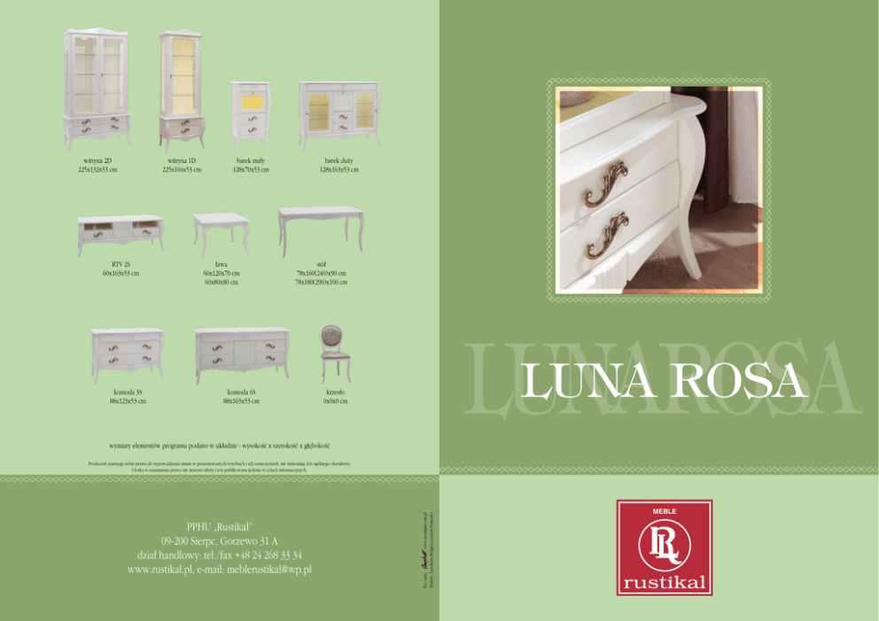 witryna 2D 225x132x53 cm witryna 1D 225x104x53 cm RTV 2S 60x163x53 cm komoda 3S 88x123x53 cm barek ma∏y 128x70x53 cm ∏awa 60x120x70 cm 60x80x80 cm barek du˝y 128x163x53 cm stó∏ 78x160(240)x90 cm 78x180(290)x100 cm komoda 6S 88x163x53 cm LUNAROSA LUNA ROSA krzes∏o 0x0x0 cm wymiary elementów programu podano w uk∏adzie - wysokoÊç x szerokoÊç x g∏´bokoÊç PPHU „Rustikal” 09-200 Sierpc, Gorzewo 31 A dzia∏ handlowy: tel./fax +48 24 268 33 34 www.rustikal.pl, e-mail: [email protected] Fot. i proj. www.srcomplex.com.pl Dodatki - Eurofirany Bydgoszcz Galeria Pomorska Producent zastrzega sobie prawo do wprowadzenia zmian w prezentowanych wyrobach i ich oznaczeniach, nie zmieniajàc ich ogólnego charakteru. Ulotka w rozumieniu prawa nie stanowi oferty i jest publikowana jedynie w celach informacyjnych. Luna Rosa to klasyczne meble o pi´knych, lekko falujàcych kszta∏tach. JaÊminowa biel oraz ozdobne uchwyty z kryszta∏kami nadajà uroku i luksusu. Ró˝norodnoÊç bry∏ sprawia, ˝e umeblowane pomieszczenie jest pi´kne i funkcjonalne.