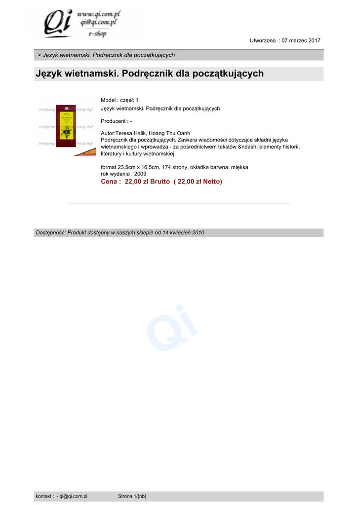 Utworzono : 07 marzec 2017 > Język wietnamski. Podręcznik dla początkujących Język wietnamski. Podręcznik dla początkujących Model : część 1 Język wietnamski. Podręcznik dla początkujących Producent : Autor:Teresa Halik, Hoang Thu Oanh Podręcznik dla początkujących. Zawiera wiadomości dotyczące składni języka wietnamskiego i wprowadza - za pośrednictwem tekstów – elementy historii, literatury i kultury wietnamskiej. format 23,5cm x 16,5cm, 174 strony, okładka barwna, miękka rok wydania : 2009 Cena : 22,00 zł Brutto ( 22,00 zł Netto) Dostępność: Produkt dostępny w naszym sklepie od 14 kwiecień 2010 i Q kontakt : - [email protected] Strona 1/{nb}
