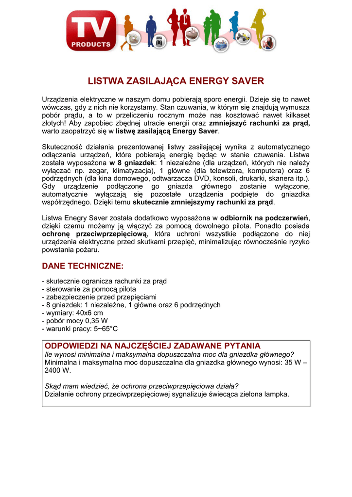 LISTWA ZASILAJĄCA ENERGY SAVER Urządzenia elektryczne w naszym domu pobierają sporo energii. Dzieje się to nawet wówczas, gdy z nich nie korzystamy. Stan czuwania, w którym się znajdują wymusza pobór prądu, a to w przeliczeniu rocznym może nas kosztować nawet kilkaset złotych! Aby zapobiec zbędnej utracie energii oraz zmniejszyć rachunki za prąd, warto zaopatrzyć się w listwę zasilającą Energy Saver. Skuteczność działania prezentowanej listwy zasilającej wynika z automatycznego odłączania urządzeń, które pobierają energię będąc w stanie czuwania. Listwa została wyposażona w 8 gniazdek: 1 niezależne (dla urządzeń, których nie należy wyłączać np. zegar, klimatyzacja), 1 główne (dla telewizora, komputera) oraz 6 podrzędnych (dla kina domowego, odtwarzacza DVD, konsoli, drukarki, skanera itp.). Gdy urządzenie podłączone go gniazda głównego zostanie wyłączone, automatycznie wyłączają się pozostałe urządzenia podpięte do gniazdka współrzędnego. Dzięki temu skutecznie zmniejszymy rachunki za prąd. Listwa Enegry Saver została dodatkowo wyposażona w odbiornik na podczerwień, dzięki czemu możemy ją włączyć za pomocą dowolnego pilota. Ponadto posiada ochronę przeciwprzepięciową, która uchroni wszystkie podłączone do niej urządzenia elektryczne przed skutkami przepięć, minimalizując równocześnie ryzyko powstania pożaru. DANE TECHNICZNE: - skutecznie ogranicza rachunki za prąd - sterowanie za pomocą pilota - zabezpieczenie przed przepięciami - 8 gniazdek: 1 niezależne, 1 główne oraz 6 podrzędnych - wymiary: 40x6 cm - pobór mocy 0,35 W - warunki pracy: 5~65°C ODPOWIEDZI NA NAJCZĘŚCIEJ ZADAWANE PYTANIA Ile wynosi minimalna i maksymalna dopuszczalna moc dla gniazdka głównego? Minimalna i maksymalna moc dopuszczalna dla gniazdka głównego wynosi: 35 W – 2400 W. Skąd mam wiedzieć, że ochrona przeciwprzepięciowa działa? Działanie ochrony przeciwprzepięciowej sygnalizuje świecąca zielona lampka.