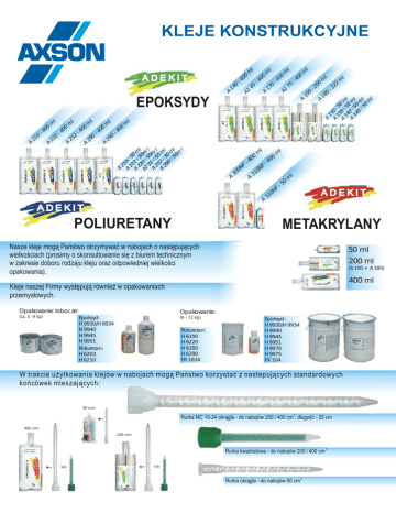-2 22 0 13 - 5 0 5 A 14 - 5 ml 0 0 m A 14 - 50 l 5 m -5 l 0 m l 18 0 A m l 00 m l m l m l -4 00 NF -5 0 A m l 31 0N F -4 00 30 0N F A A A 21 0 21 - 5 0 1 A 22 - 5 ml 0 0 A2 - m 5 50 l A 1- m 25 50 l A 2- m 29 5 l 0 0m -5 l 0m l A 29 0 -4 m l 28 0 A A -4 00 m l -4 00 25 2 -4 00 22 0 A A 21 0 -4 00 m l A 13 A 10 0 A m l m l m l 75 A1 A -2 00 m l -4 00 m l 17 0 -4 00 45 A1 EPOKSYDY A 14 0 -4 00 ADEKIT -4 00 m l KLEJE KONSTRUKCYJNE A 31 0 ADEKIT ADEKIT POLIURETANY METAKRYLANY Nasze kleje mogą Państwo otrzymywać w nabojach o następujących wielkościach (prosimy o skonsultowanie się z biurem technicznym w zakresie doboru rodzaju kleju oraz odpowiedniej wielkości opakowania). 50 ml 200 ml (A 100 + A 180) 400 ml Kleje naszej Firmy występują również w opakowaniach przemysłowych. Opakowanie robocze: (ca. 5 -9 kg) Opakowanie: (9 - 72 kg) Epoksyd: H 9930/H 9934 H 9940 H 9945 H 9951 Poliuretan: H 6203 H 6210 Poliuretan: H 6190 H 6220 H 6280 H 6290 FR 1634 Epoksyd: H 9930/H 9934 H 9940 H 9945 H 9951 H 9970 H 9975 FX 104 W trakcie użytkowania klejów w nabojach mogą Państwo korzystać z nastepujących standardowych końcówek mieszających: 50 ccm 3 Rurka MC 10-24 okrągła - do nabojów 200 i 400 cm , długość - 25 cm 400 ccm 200 ccm Rurka kwadratowa - do nabojów 200 i 400 cm lub lub Rurka okrągła - do nabojów 50 cm 3 3 Mały podręczny pistolet do nabojów 50 ml Podręczny pistolet do nabojów 200 ml Podręczny pistolet do nabojów 400 ml Pneumatyczny pistolet do nabojów 400 ml (Wszystkie pistolety dopasowane są dla osób prawo i leworęcznych) Co powinni Państwo wiedzieć przed rozpoczęciem pracy z naszym produktem: Wszystkie nasze kleje ADEKIT mają odpowiedni do wielkości i rodzaju naboju pistolet. (Do opakowań przemysłowych może być dołączony dozownik. Prosimy o konsultację z biurem technicznym.) O O Temperatura stosowania powinna wahać się w zakresie od +18 C do max. +35 C. Należy pamiętać o środkach ostrożności takich jak: dobra wentylacja, rękawice, okulary ochronne. (Pełną informację o środkach bezpieczeństwa zawiera karta charakterystyki substancji niebezpiecznej danego produktu.) Warunki składowania: O O Kleje należy przechowywać w opakowaniu oryginalnym w temperaturze od +15 C do +25 C W przypadku kleju metakrylowego najlepsza temperatura przechowywania O wynosi +4 C (lodówka). 25° 15° - 18° Wyższe temperatury przechowywania zależą od terminów ważności. 4° Temperatura przechowywania: Opakowania przemysłowe nadają się do ponownego zamknięcia. Epoksydowy, Poliuretanowy i Metakrylowy klej, w zależności od składu chemicznego ma następujące terminy ważności: Epoksydy 12 Miesięcy Poliuretany 9 - 12 Miesięcy Metakrylany 12 Miesięcy (Pełną informację zawiera karta techniczna produktu jak również naklejka na opakowaniu.) Uwaga: Puste pojemniki (naboje jak i opakowania przemysłowe) należy przekazać do recyclingu bądź utylizacji zgodnie z obowiązującymi przepisami (ustawa o opakowaniach i odpadach opakowaniowych). Nie wolno traktować zużytych opakowań oraz nabojów jako odpadu komunalnego (nie wyrzucać razem ze śmieciami gospodarczymi). Twój światowy partner w technologii max temperatura Epoksyd Poliuretan Metakrylan AMOD - Andrzej Modrzewski, ul. Rydygiera 8, 01-793 Warszawa, tel./fax (0-22) 633 85 06, tel. (0-22) 669 39 76, tel. kom. 0-602 26 11 15, e-mail: [email protected], http://www.amod.com.pl Pistolety przystosowane do pracy z naszymi nabojami: