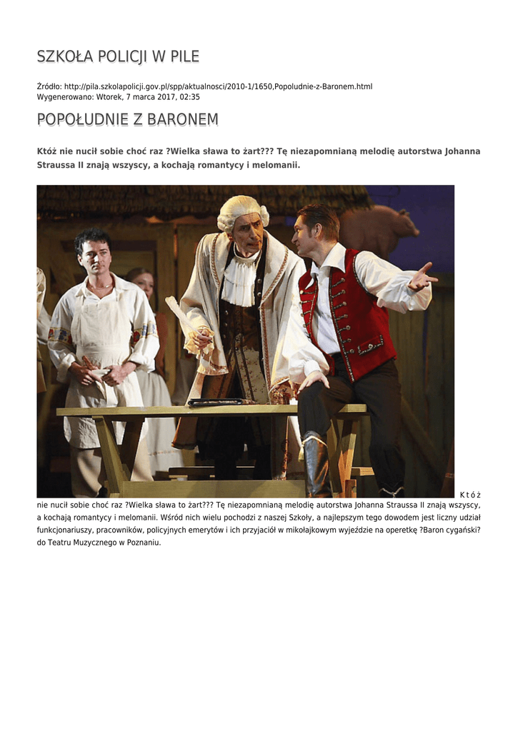 SZKOŁA POLICJI W PILE Źródło: http://pila.szkolapolicji.gov.pl/spp/aktualnosci/2010-1/1650,Popoludnie-z-Baronem.html Wygenerowano: Wtorek, 7 marca 2017, 02:35 POPOŁUDNIE Z BARONEM Któż nie nucił sobie choć raz ?Wielka sława to żart??? Tę niezapomnianą melodię autorstwa Johanna Straussa II znają wszyscy, a kochają romantycy i melomanii. Któż nie nucił sobie choć raz ?Wielka sława to żart??? Tę niezapomnianą melodię autorstwa Johanna Straussa II znają wszyscy, a kochają romantycy i melomanii. Wśród nich wielu pochodzi z naszej Szkoły, a najlepszym tego dowodem jest liczny udział funkcjonariuszy, pracowników, policyjnych emerytów i ich przyjaciół w mikołajkowym wyjeździe na operetkę ?Baron cygański? do Teatru Muzycznego w Poznaniu. Podczas przedstawienia miłośnicy ?podkasanej muzy? jak żartobliwie określa się właśnie operetkę, mieli okazję uczestniczyć w niezwykle widowiskowej uczcie. Nic w tym dziwnego, ?Baron cygański? to jedno z najpopularniejszych i najbardziej lubianych dzieł Johanna Straussa II, słusznie okrzyknięte arcydziełem już wkrótce po pierwszym wystawieniu. Operetka opowiada o perypetiach uczuciowych pięknej Cyganki Saffi i młodego węgierskiego szlachcica Sandora Barinkaya, który w wyniku splotu rozmaitych wydarzeń zostaje tytułowym cygańskim baronem. Oprócz wątku romantycznego na scenie króluje przede wszystkim wspaniała muzyka ? chwytliwe arie i kuplety czy pełne namiętności cygańskie pieśni perfekcyjnie wykonane z towarzyszeniem chóru, baletu i orkiestry. Do tego wszystkiego przepiękne dekoracje, cudowne kostiumy i znakomici artyści, wśród których w jednej z głównych ról wystąpił Mirosław Kin rodowity pilanin, którego mogliśmy podziwiać m.in. podczas zeszłorocznych Maryjek. Za swój występ artysta otrzymał od nas kwiaty i specjalne podziękowania. Zdjęcia z przedstawienia autorstwa Romana Lipigórskiego pochodzą ze strony internetowej Teatru Muzycznego w Poznaniu. autor: Anna Fons (06.12.10) Ocena: 0/5 (0) Tweetnij