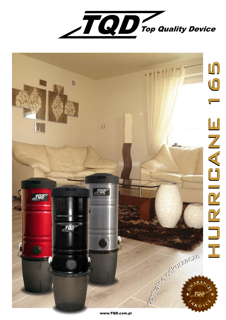 Silnik z turbiną: AMETEK LAMB ® - najwyższej jakości światowego, czołowego producenta silników do centralnych odkurzaczy. PODŁĄCZENIE PRZEW. SYGNAŁ. SILNIK AMETEK LAMB® WSKAŹNIK ZASILANIA WYRZUT PRZEŁĄCZNIK TRYBU PRACY: AUTO / RĘCZNEJ ZABEZPIECZENIE PRZECIĄŻENIOWE STALOWA OBUDOWA FILTR SAMOCZYSZCZĄCY SSANIE PRAWOSTRONNE SSANIE LEWOSTRONNE Unikalny system filtracji: cyklon + system samoczyszczącego się filtra, zapewnia długą pracę odkurzacza bez konieczności wymiany i czyszczenia filtra. Podczas, gdy większe zanieczyszczenia zostają odseparowane od strumienia powietrza za pomocą cyklonu w dalszej kolejności filtr samoczyszczący zatrzyma drobniejsze zanieczyszczenia (o średnicy > 0,3 µm.). Sprawność filtracji jest wysoka i sięga 99,7%. Specjalna powierzchnia filtra samoczyszczącego w odkurzaczu H U R R I C A N E 1 6 5 zabezpiecza przed przedostawaniem się drobin zanieczyszczeń do wnętrza struktury filtra - zachowując jego pełne właściwości filtracyjne bez spadku ciągu co ma często miejsce w przypadku tradycyjnych filtrów w centralnych odkurzaczach. Zastosowany system samoczyszczenia zabezpiecza przed osadzaniem się brudu na powierzchni (nie spada siła ciągu) - nie ma konieczności wymiany i czyszczenia filtra. ZAWSZE KIEDY Silnik z turbiną AMETEK LAMB® Filtr samoczyszczący podczas pracy odkurzacza WYŁĄCZASZ ODKURZACZ FILTR CZYŚCI SIĘ SAM. GNIAZDO GOSPODARCZE CYKLON PRZEZROCZYSTY ZBIORNIK >> black / czarny >> cherry / wiśnia >> INOX Podłączenie: możliwość podłączenia rurociągu ssącego z lewej lub prawej strony. Łatwy montaż. Niski poziom hałasu: wyciszona komora silnika. Filtr samoczyszczący podczas postoju odkurzacza Przezroczysty zbiornik: możliwość łatwego sprawdzenia stopnia zapełnienia zbiornika bez jego demontażu. Materiał: tworzywo sztuczne. Tłumik: o wysokich właściwościach tłumiących. Dostępny wraz z odkurzaczem. Wentylacja silnika: konstrukcja zapewniająca odpowiednie chłodzenie silnika zwiększając jego żywotność. WIDOK Z BOKU Dostępny jesienią 2011 WIDOK Z TYŁU Model Obudowa Silnik Moc [W] Napięcie [V] Podciśnienie [kPa] Przepływ powietrza [m3/h] Moc ssąca [AirWatt] System filtracji Gniazdo gospodarcze w odkurzaczu Zabezpieczenie silnika Pojemność zbiornika [l] Wymiary wys. / śr. [mm] Waga [kg] Dostępne kolory Poziom hałasu (3m) [db] Max. powierzchnia sprzątania [m2] Max. odległość od najdalszego gniazda [m] Przybliżona max. ilość gniazd ssących Gwarancja Niski poziom hałasu wygłuszona komora silnika + tłumik Hurricane 165 Hurricane 180 Stal nierdzewna AMETEK LAMB 1650 1800 220/240 32 36 260 300 500 cyklon + filtr samoczyszczący TAK TAK 20 900 x 300 9,5 Czarny, Wiśniowy, INOX 61 350 35 8 3 lata Tłumik DO G IK ON/OFF W ZN RĄ ĄC CZ EŁ CE OBROTOWA KOŃCÓWKA PRZY RĘKOJEŚCI JAK I PRZY PRZYŁĄCZU PR Z ZESTAW SPRZĄTAJĄCY TQD MASTER KIT / STANDARD KIT y tając sprzą w a t zes CJA Nowy jako OP NI AZ DA CZKA DOSTĘ RĄ P SSAWKA DO POLEROWANIA MOP ST ELA WIESZAK NA WĄŻ RU RA L TE A W PO KO ES HR (C OM A) AN OW UCHWYT DO ZAMOCOWANIA SSAWEK NA RURZE TELESKOPOWEJ AWKA S NA SS Z YCZ 60cm OWA ELIN CZ www.TQD.com.pl Elementy nie występujące w zestawie STANDARD KIT WĄŻ Z PRZEŁĄCZNIKIEM ON/OFF W RĄCZCE (9m) SYSTEM OBR UCHWYT ŚCIENNY TELESKOPU EJ ŚC KOJE I JAK I PR RĘ o 0 36 Z DO GNIAZDA SSAWKA SZCZELINOWA W ZA OT O SZCZOTKA MAŁA OKRĄGŁA SZCZOTKA DO PODŁÓG LUB SZARYM SZCZOTKA DO TAPICEREK LORZE CZE KO RW ĄC YŁ Dystrybutor: “TURBO” SZCZOTKA W M NY SZCZOTKA DO PODŁÓG I DYWANÓW A O N TORBA NA SZCZOTKI