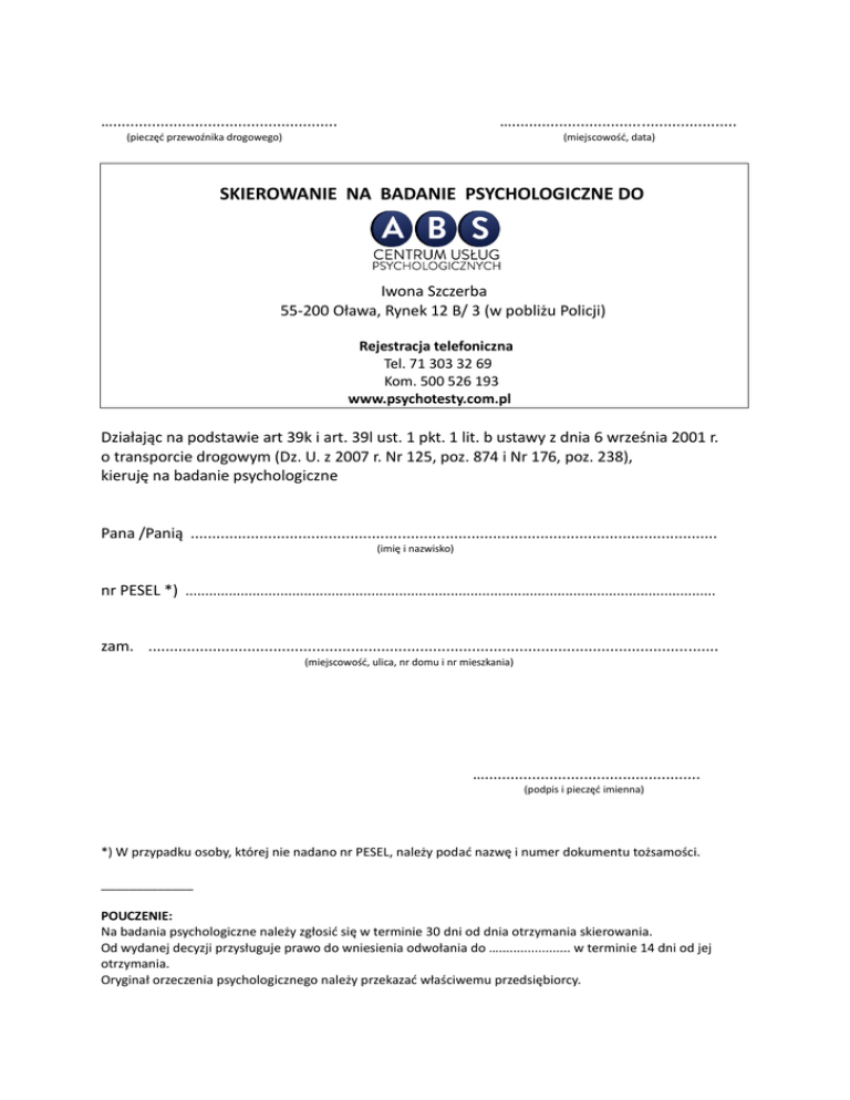 ….................................................... ….................................................... (pieczęd przewoźnika drogowego) (miejscowośd, data) SKIEROWANIE NA BADANIE PSYCHOLOGICZNE DO Iwona Szczerba 55-200 Oława, Rynek 12 B/ 3 (w pobliżu Policji) Rejestracja telefoniczna Tel. 71 303 32 69 Kom. 500 526 193 www.psychotesty.com.pl Działając na podstawie art 39k i art. 39l ust. 1 pkt. 1 lit. b ustawy z dnia 6 września 2001 r. o transporcie drogowym (Dz. U. z 2007 r. Nr 125, poz. 874 i Nr 176, poz. 238), kieruję na badanie psychologiczne Pana /Panią .......................................................................................................................... (imię i nazwisko) nr PESEL *) ...................................................................................................................................... zam. .................................................................................................................................... (miejscowośd, ulica, nr domu i nr mieszkania) ….................................................. (podpis i pieczęd imienna) *) W przypadku osoby, której nie nadano nr PESEL, należy podad nazwę i numer dokumentu tożsamości. _____________ POUCZENIE: Na badania psychologiczne należy zgłosid się w terminie 30 dni od dnia otrzymania skierowania. Od wydanej decyzji przysługuje prawo do wniesienia odwołania do ….................... w terminie 14 dni od jej otrzymania. Oryginał orzeczenia psychologicznego należy przekazad właściwemu przedsiębiorcy.