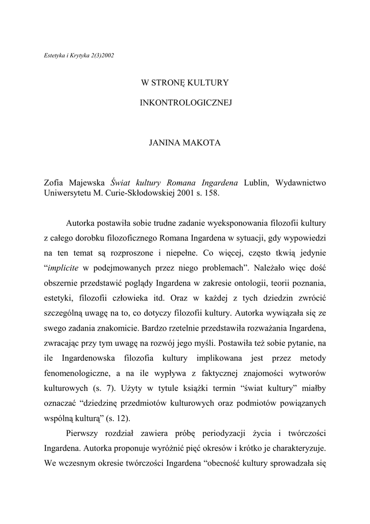 Estetyka i Krytyka 2(3)2002 W STRONĘ KULTURY INKONTROLOGICZNEJ JANINA MAKOTA Zofia Majewska Świat kultury Romana Ingardena Lublin, Wydawnictwo Uniwersytetu M. Curie-Skłodowskiej 2001 s. 158. Autorka postawiła sobie trudne zadanie wyeksponowania filozofii kultury z całego dorobku filozoficznego Romana Ingardena w sytuacji, gdy wypowiedzi na ten temat są rozproszone i niepełne. Co więcej, często tkwią jedynie “implicite w podejmowanych przez niego problemach”. Należało więc dość obszernie przedstawić poglądy Ingardena w zakresie ontologii, teorii poznania, estetyki, filozofii człowieka itd. Oraz w każdej z tych dziedzin zwrócić szczególną uwagę na to, co dotyczy filozofii kultury. Autorka wywiązała się ze swego zadania znakomicie. Bardzo rzetelnie przedstawiła rozważania Ingardena, zwracając przy tym uwagę na rozwój jego myśli. Postawiła też sobie pytanie, na ile Ingardenowska filozofia kultury implikowana jest przez metody fenomenologiczne, a na ile wypływa z faktycznej znajomości wytworów kulturowych (s. 7). Użyty w tytule książki termin “świat kultury” miałby oznaczać “dziedzinę przedmiotów kulturowych oraz podmiotów powiązanych wspólną kulturą” (s. 12). Pierwszy rozdział zawiera próbę periodyzacji życia i twórczości Ingardena. Autorka proponuje wyróżnić pięć okresów i krótko je charakteryzuje. We wczesnym okresie twórczości Ingardena “obecność kultury sprowadzała się do wzmianek o dziełach i artystach w rozważaniach ogólnofilozoficznych” (s. 34). Pod koniec lat dwudziestych Ingarden rozwija ontologię dzieł sztuki. “Wtedy explicite wyraził przekonanie, że sztuka i filozofia stanowią wyróżnione dziedziny kultury” (s. 35). Autorka zwraca uwagę na to, że w rozwijaniu problematyki estetycznej dużą rolę odgrywają kontakty z dziełami sztuki i “autentyczne przeżycia Ingardena-odbiorcy”. Rozdział drugi jest poświęcony wytworom kultury (jako przedmiotowi refleksji filozoficznej). Autorka stwierdza, że Ingarden zaliczał do wytworów kulturowych “dzieła sztuki, dzieła naukowe, język, moralność, systemy filozoficzne i religijne, instytucje publiczne i prywatne, a nawet w przedmiotach użytkowych rozważał pewien aspekt kulturowy” (s. 37). Wiemy, że nie wszystkie wyliczone tu wytwory będą przedmiotem obszernych analiz Ingardena. Biorąc na razie pod uwagę same nazwy stwierdzamy, że niepokoić tu może “moralność”. Prawdopodobnie Ingarden miał na myśli “systemy etyczne” (analogicznie do systemów religijnych), ale użyte słowo może znaczyć raczej coś innego, np. moralność charakteryzującą określoną grupę ludzką, a w takim przypadku nie byłby to żaden przedmiot intencjonalny. Autorka bardzo dokładnie analizuje poglądy Ingardena dotyczące sztuki, proponując zarazem przejrzyste ich uporządkowanie. Uwzględnia budowę poszczególnych typów dzieł, proces twórczy i odbiorczy, konkretyzację dzieł sztuki, wartości realizowane w sztuce oraz relacje między sztuką a innymi dziedzinami kultury. Szczególną uwagę poświęca dziełu literackiemu, które i dla Ingardena stanowiło uprzywilejowany teren dociekań. Wyraża zastrzeżenie odnośnie do tezy Ingardena, że w utworach literackich nie ma, czy raczej nie powinno być filozofii. A fenomenologicznemu nastawieniu Ingardena na istotę przedmiotów przypisuje pomijanie przezeń światopoglądowej i społecznej funkcji sztuki. Następnie przedstawia autorka pogląd Ingardena na dzieło naukowe, podkreślając to, co je różni od dzieła sztuki literackiej. Ważne jest wymaganie stawiane odbiorcy dzieła naukowego: powinien on mianowicie za pośrednictwem dzieła dojść do odpowiedniej rzeczywistości, przyjrzeć się jej i swoje doświadczenie porównać z tym, co wyczytał w dziele. Dalej omawia autorka poglądy Ingardena na język, w tym specjalnie na znaczenie wyrazów. Podkreśla, że Ingarden odrzuca zarówno psychologistyczne, jak i idealistyczne ujęcie języka. Kolejny ustęp zawiera omówienie poglądów Ingardena na filozofię (pamiętamy, że zajmuje ona “wyróżnioną pozycję w kulturze”). Według Ingardena filozofia “zaspokaja (...) bezinteresowną ciekawość intelektualną człowieka, umożliwia dotarcie do tajemnic bytu i głębsze zrozumienie sensu ludzkiego istnienia” (s. 58). Poznanie filozoficzne zaczyna się od ontologii rozważającej czyste możliwości, ale zmierza ku metafizyce dotyczącej faktycznego istnienia wszelkiego bytu. Ingarden opracował znaczną część ontologii, natomiast metafizyki już nie zdążył opracować. Autorka zauważa jednak, że znajdujemy w dziełach Ingardena szereg twierdzeń, które można interpretować jako metafizyczne. “Należą do nich m.in. sądy egzystencjalne o ideach, przedmiotach idealnych, samoistnych i intencjonalnych” (s. 60). Zdaniem autorki, Ingarden wielokrotnie wracał do pytania o sposób istnienia świata i skłaniał się do rozstrzygnięcia realistycznego, ale ostatecznego twierdzenia metafizycznego w tej kwestii nie wygłosił, co mimo podziwu dla wielkości jego dokonań rodzi pewne rozczarowanie. Poza ontologią opracował Ingarden podstawy teorii poznania, a także rozważał różne zagadnienia szczegółowe. Ponownie wymienia autorka wytwory kultury, wśród nich obyczaj i moralność. Do “obyczaju” odnoszą się te same zastrzeżenia, które wyraziłam wyżej odnośnie do “moralności”. Obyczaj rozumie się przede wszystkim jako konkretne zachowania się określonych społeczności, a wtedy nie jest to żaden wytwór intencjonalny, ale coś po stronie życia. Autorka pisze, że pod koniec II tomu Sporu Ingarden bierze pod uwagę możliwość istnienia Boga, co było powodem uważania go za zwolennika fideizmu” (s. 63). Nie wiem, czy jest to określenie wprowadzone przez autorkę, czy przez tych, którzy o Ingardenie pisali. Jest to określenie błędne. Ani każdego człowieka wierzące