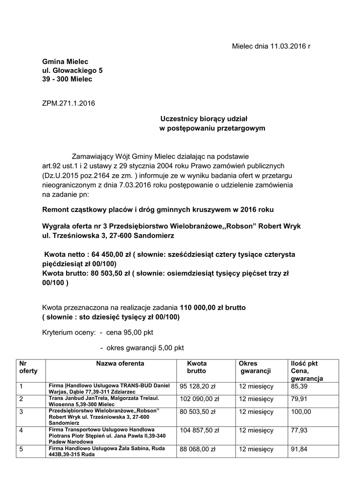 Mielec dnia 11.03.2016 r Gmina Mielec ul. Głowackiego 5 39 - 300 Mielec ZPM.271.1.2016 Uczestnicy biorący udział w postępowaniu przetargowym Zamawiający Wójt Gminy Mielec działając na podstawie art.92 ust.1 i 2 ustawy z 29 stycznia 2004 roku Prawo zamówień publicznych (Dz.U.2015 poz.2164 ze zm. ) informuje ze w wyniku badania ofert w przetargu nieograniczonym z dnia 7.03.2016 roku postępowanie o udzielenie zamówienia na zadanie pn: Remont cząstkowy placów i dróg gminnych kruszywem w 2016 roku Wygrała oferta nr 3 Przedsiębiorstwo Wielobranżowe,,Robson” Robert Wryk ul. Trześniowska 3, 27-600 Sandomierz Kwota netto : 64 450,00 zł ( słownie: sześćdziesiąt cztery tysiące czterysta pięćdziesiąt zł 00/100) Kwota brutto: 80 503,50 zł ( słownie: osiemdziesiąt tysięcy pięćset trzy zł 00/100 ) Kwota przeznaczona na realizacje zadania 110 000,00 zł brutto ( słownie : sto dziesięć tysięcy zł 00/100) Kryterium oceny: - cena 95,00 pkt - okres gwarancji 5,00 pkt Nr oferty 1 2 3 4 5 Nazwa oferenta Firma |Handlowo Usługowa TRANS-BUD Daniel Warjas, Dąbie 77,39-311 Zdziarzec Trans Janbud JanTrela, Malgorzata Trelaul. Wiosenna 5,39-300 Mielec Przedsiębiorstwo Wielobranżowe,,Robson” Robert Wryk ul. Trześniowska 3, 27-600 Sandomierz Firma Transportowo Uslugowo Handlowa Piotrans Piotr Stępień ul. Jana Pawła II,39-340 Padew Narodowa Firma Handlowo Usługowa Żala Sabina, Ruda 443B,39-315 Ruda Kwota brutto Okres gwarancji 95 128,20 zł 12 miesięcy Ilość pkt Cena, gwarancja 85,39 102 090,00 zł 12 miesięcy 79,91 80 503,50 zł 12 miesięcy 100,00 104 857,50 zł 12 miesięcy 77,93 88 068,00 zł 12 miesięcy 91,84 6 7 FUH Trans- Majaworo Chrzastów 8, 39-331 Chorzelów Firma Produkcyjno Handlowo Usługowa Józef Turek Kasprzaka 12E, 39-300 Mielec 100 158,90 zł 12 miesięcy 81,35 99 015,00 zł 12 miesięcy 82,23 Na podstawie art. 92 ust.1 pkt 4 ustawy Prawo zamówień publicznych. Zamawiający informuje, że umowa w sprawie zamówienia publicznego w przedmiotowym postępowaniu, zgodnie z art. 94 ust.1 pkt.1 ustawy Prawo zamówień publicznych może zostać zawarta w dniu 22 marca 2016 roku. Osoba do kontaktu Andrzej Bieniek tel. 17 774 56 66 Wójt Gminy Mielec /-/ Józef Piątek Otrzymują : 1.Firma |Handlowo Usługowa TRANS-BUD Daniel Warjas, Dąbie 77, 39-311 Zdziarzec 2. Trans Janbud JanTrela, Malgorzata Trelaul. Wiosenna 5,39-300 Mielec 3. Przedsiębiorstwo Wielobranżowe,,Robson” Robert Wryk ul. Trześniowska 3, 27-600 Sandomierz 4. Firma Transportowo Uslugowo Handlowa Piotrans Piotr Stępień ul. Jana Pawła II,39-340 Padew Narodowa 5. Firma Handlowo Usługowa Żala Sabina, Ruda 443B,39-315 Ruda 6. FUH Trans- Majaworo Chrzastów 8, 39-331 Chorzelów 7. Firma Produkcyjno Handlowo Usługowa Józef Turek Kasprzaka 12E, 39-300 Mielec 8.a/a