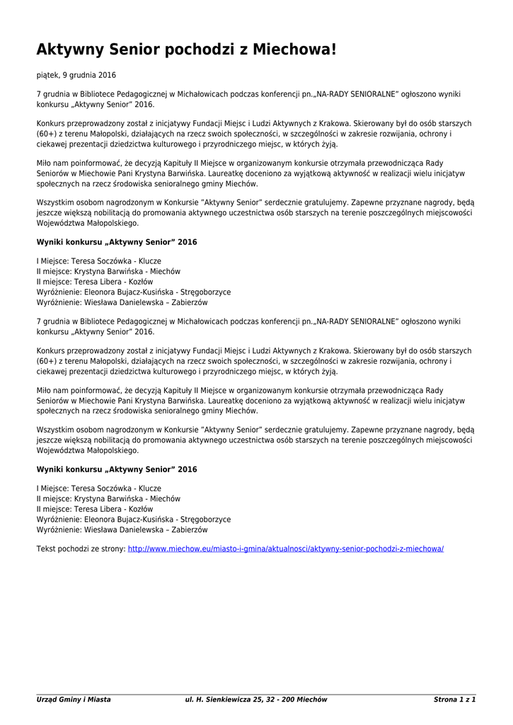 Aktywny Senior pochodzi z Miechowa! piątek, 9 grudnia 2016 7 grudnia w Bibliotece Pedagogicznej w Michałowicach podczas konferencji pn.„NA-RADY SENIORALNE” ogłoszono wyniki konkursu „Aktywny Senior” 2016. Konkurs przeprowadzony został z inicjatywy Fundacji Miejsc i Ludzi Aktywnych z Krakowa. Skierowany był do osób starszych (60+) z terenu Małopolski, działających na rzecz swoich społeczności, w szczególności w zakresie rozwijania, ochrony i ciekawej prezentacji dziedzictwa kulturowego i przyrodniczego miejsc, w których żyją. Miło nam poinformować, że decyzją Kapituły II Miejsce w organizowanym konkursie otrzymała przewodnicząca Rady Seniorów w Miechowie Pani Krystyna Barwińska. Laureatkę doceniono za wyjątkową aktywność w realizacji wielu inicjatyw społecznych na rzecz środowiska senioralnego gminy Miechów. Wszystkim osobom nagrodzonym w Konkursie ”Aktywny Senior” serdecznie gratulujemy. Zapewne przyznane nagrody, będą jeszcze większą nobilitacją do promowania aktywnego uczestnictwa osób starszych na terenie poszczególnych miejscowości Województwa Małopolskiego. Wyniki konkursu „Aktywny Senior” 2016 I Miejsce: Teresa Soczówka - Klucze II miejsce: Krystyna Barwińska - Miechów II miejsce: Teresa Libera - Kozłów Wyróżnienie: Eleonora Bujacz-Kusińska - Stręgoborzyce Wyróżnienie: Wiesława Danielewska – Zabierzów 7 grudnia w Bibliotece Pedagogicznej w Michałowicach podczas konferencji pn.„NA-RADY SENIORALNE” ogłoszono wyniki konkursu „Aktywny Senior” 2016. Konkurs przeprowadzony został z inicjatywy Fundacji Miejsc i Ludzi Aktywnych z Krakowa. Skierowany był do osób starszych (60+) z terenu Małopolski, działających na rzecz swoich społeczności, w szczególności w zakresie rozwijania, ochrony i ciekawej prezentacji dziedzictwa kulturowego i przyrodniczego miejsc, w których żyją. Miło nam poinformować, że decyzją Kapituły II Miejsce w organizowanym konkursie otrzymała przewodnicząca Rady Seniorów w Miechowie Pani Krystyna Barwińska. Laureatkę doceniono za wyjątkową aktywność w realizacji wielu inicjatyw społecznych na rzecz środowiska senioralnego gminy Miechów. Wszystkim osobom nagrodzonym w Konkursie ”Aktywny Senior” serdecznie gratulujemy. Zapewne przyznane nagrody, będą jeszcze większą nobilitacją do promowania aktywnego uczestnictwa osób starszych na terenie poszczególnych miejscowości Województwa Małopolskiego. Wyniki konkursu „Aktywny Senior” 2016 I Miejsce: Teresa Soczówka - Klucze II miejsce: Krystyna Barwińska - Miechów II miejsce: Teresa Libera - Kozłów Wyróżnienie: Eleonora Bujacz-Kusińska - Stręgoborzyce Wyróżnienie: Wiesława Danielewska – Zabierzów Tekst pochodzi ze strony: http://www.miechow.eu/miasto-i-gmina/aktualnosci/aktywny-senior-pochodzi-z-miechowa/ Urząd Gminy i Miasta ul. H. Sienkiewicza 25, 32 - 200 Miechów Strona 1 z 1