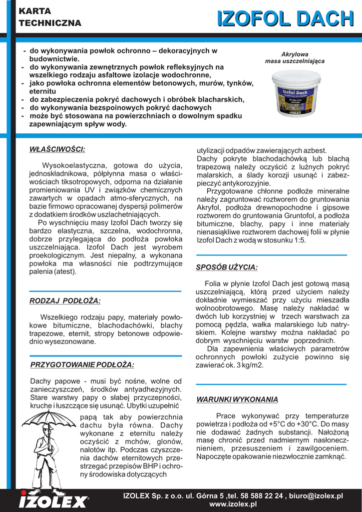 KARTA TECHNICZNA IZOFOL DACH - do wykonywania pow³ok ochronno – dekoracyjnych w budownictwie. - do wykonywania zewnêtrznych pow³ok refleksyjnych na wszelkiego rodzaju asfaltowe izolacje wodochronne, - jako pow³oka ochronna elementów betonowych, murów, tynków, eternitu - do zabezpieczenia pokryæ dachowych i obróbek blacharskich, - do wykonywania bezspoinowych pokryæ dachowych - mo¿e byæ stosowana na powierzchniach o dowolnym spadku zapewniaj¹cym sp³yw wody. W£AŒCIWOŒCI: Wysokoelastyczna, gotowa do u¿ycia, jednosk³adnikowa, pó³p³ynna masa o w³aœciwoœciach tiksotropowych, odporna na dzia³anie promieniowania UV i zwi¹zków chemicznych zawartych w opadach atmo-sferycznych, na bazie firmowo opracowanej dyspersji polimerów z dodatkiem œrodków uszlachetniaj¹cych. Po wyschniêciu masy Izofol Dach tworzy siê bardzo elastyczna, szczelna, wodochronna, dobrze przylegaj¹ca do pod³o¿a pow³oka uszczelniaj¹ca. Izofol Dach jest wyrobem proekologicznym. Jest niepalny, a wykonana pow³oka ma w³asnoœci nie podtrzymuj¹ce palenia (atest). RODZAJ POD£O¯A: Wszelkiego rodzaju papy, materia³y pow³okowe bitumiczne, blachodachówki, blachy trapezowe, eternit, stropy betonowe odpowiednio wysezonowane. PRZYGOTOWANIE POD£O¯A: Dachy papowe - musi byæ noœne, wolne od zanieczyszczeñ, œrodków antyadhezyjnych. Stare warstwy papy o s³abej przyczepnoœci, kruche i ³uszcz¹ce siê usun¹æ. Ubytki uzupe³niæ pap¹ tak aby powierzchnia dachu by³a równa. Dachy wykonane z eternitu nale¿y oczyœciæ z mchów, glonów, nalotów itp. Podczas czyszczenia dachów eternitowych przestrzegaæ przepisów BHP i ochrony œrodowiska dotycz¹cych Akrylowa masa uszczelniaj¹ca utylizacji odpadów zawieraj¹cych azbest. Dachy pokryte blachodachówk¹ lub blach¹ trapezow¹ nale¿y oczyœciæ z luŸnych pokryæ malarskich, a œlady korozji usun¹æ i zabezpieczyæ antykorozyjnie. Przygotowane ch³onne pod³o¿e mineralne nale¿y zagruntowaæ roztworem do gruntowania Akryfol, pod³o¿a drewnopochodne i gipsowe roztworem do gruntowania Gruntofol, a pod³o¿a bitumiczne, blachy, papy i inne materia³y nienasi¹kliwe roztworem dachowej folii w p³ynie Izofol Dach z wod¹ w stosunku 1:5. SPOSÓB U¯YCIA: Folia w p³ynie Izofol Dach jest gotow¹ mas¹ uszczelniaj¹c¹, któr¹ przed u¿yciem nale¿y dok³adnie wymieszaæ przy u¿yciu mieszad³a wolnoobrotowego. Masê nale¿y nak³adaæ w dwóch lub korzystniej w trzech warstwach za pomoc¹ pêdzla, wa³ka malarskiego lub natryskiem. Kolejne warstwy mo¿na nak³adaæ po dobrym wyschniêciu warstw poprzednich. Dla zapewnienia w³aœciwych parametrów ochronnych pow³oki zu¿ycie powinno siê zawieraæ ok. 3 kg/m2. WARUNKI WYKONANIA Prace wykonywaæ przy temperaturze powietrza i pod³o¿a od +5°C do +30°C. Do masy nie dodawaæ ¿adnych substancji. Na³o¿on¹ masê chroniæ przed nadmiernym nas³onecznieniem, przesuszeniem i zawilgoceniem. Napoczête opakowanie niezw³ocznie zamkn¹æ. IZOLEX Sp. z o.o. ul. Górna 5 ,tel. 58 588 22 24 , [email protected] www.izolex.pl DANE TECHNICZNE: - barwa - gruboœæ pojedynczej warstwy - czas schniêcia warstwy - iloœæ warstw - pozosta³oœæ suchej masy - zu¿ycie - temperatura pod³o¿a i powietrza podczas stosowania - metoda nak³adania - warunki przechowywania i transportu - okres przydatnoœci (od daty produkcji) - mycie narzêdzi - dokumenty odniesienia ceglasto-br¹zowa, szara 0,8 – 1,2mm do 12 godzin minimum 2 (zalecane 3) ok. 60% 2 od. 0,8 do1,2 kg/m /warstwê 0 +5 - +35 C pêdzel, szczotka, wa³ek malarski 0 w suchych i ch³odnych pomieszczeniach, w temperaturze powy¿ej +5 C do 12 miesiêcy woda Apr. Tech. ITB AT-15-7116/2008 , atest PZH ZALECENIA OGÓLNE: OPAKOWANIA Jednostkowe 4 kg 7 kg 12 kg 25 kg Wiaderko Wiaderko Wiaderko Wiaderko Zbiorcze 576 kg 560 kg 660 kg 825 kg Prace prowadziæ zgodnie z zasadami sztuki budowlanej, instrukcj¹ producenta, normami i w³aœciwymi przepisami BHP. UWAGI: NARZÊDZIA: Mieszarka wolnoobrotowa, mieszad³o koszykowe, pêdzel, wa³ek malarski, urz¹dzenie natryskowe. PRZECHOWYWANIE: W oryginalnych, nieuszkodzonych, szczelnie zamkniêtych opakowaniach, suchych, ch³odnych pomieszczeniach w temperaturze powy¿ej +5°C. Okres przydatnoœci do u¿ycia 12 miesiêcy od daty produkcji. Produkt nale¿y chroniæ przed mrozem. Dane techniczne i informacje o sposobie stosowania podane s¹ dla temperatury 23°C ± 2°C i wilgotnoœci wzglêdnej 50% - 60%. W innych warunkach czas schniêcia ulega zmianie. Produkt chroniæ przed dzieæmi. W razie zabrudzenia oczu nale¿y natychmiast przemyæ je du¿¹ iloœci¹ wody i skontaktowaæ siê z lekarzem. Chroniæ równie¿ skórê u¿ywaj¹c ubrañ i rêkawic ochronnych. Narzêdzia i ewentualne zanieczyszczenia natychmiast zmyæ wod¹. Producent nie odpowiada za szkody wynik³e z nieumiejêtnego lub niezgodnego z przeznaczeniem u¿ycia wyrobu. Niniejsza karta techniczna produktu jest obowi¹zuj¹ca i zastêpuje wszystkie poprzednie. Wyrób dopuszczony do obrotu i powszechnego stosowania w budownictwie. Skarszewy, dnia 21.03.2011. IZOLEX Sp. z o.o. ul. Górna 5 ,tel. 58 588 22 24 , [email protected] www.izolex.pl