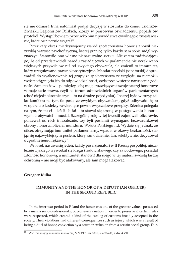 Immunitet a zdolność honorowa posła (oficera) w II RP 885 się nie odniósł. Inną natomiast podjął decyzję w stosunku do ośmiu członków Związku Legionistów Polskich, którzy w prasowym oświadczeniu poparli ów protokół. Wystąpił bowiem przeciwko nim z powództwa cywilnego o zniesławienie, które ostatecznie wygrał77. Przez cały okres międzywojenny wśród społeczeństwa honor stanowił niezwykłą wartość psychofizyczną, której granicę tylko każdy sam sobie mógł wyznaczyć. Stanowiło ono własne nienaruszalne sacrum. Nic zatem zadziwiającego, że od przedstawicieli narodu zasiadających w parlamencie nie oczekiwano większych przywilejów niż od zwykłego obywatela, ale zmienił to immunitet, który uregulowano prawnokonstytucyjnie. Mandat poselski (senatorski) doprowadził do wyalienowania tej grupy ze społeczeństwa ze względu na niemożliwość pociągnięcia ich do odpowiedzialności, zwłaszcza w sferze naruszenia godności. Sami posłowie pomiędzy sobą mogli rozwiązywać swoje zatargi honorowe w majestacie prawa, czyli na forum odpowiednich organów parlamentarnych (choć niejednokrotnie czynili to na drodze pojedynku). Inaczej było w przypadku konfliktu na tym tle posła ze zwykłym obywatelem, gdyż odbywało się to w oparciu o kodeksy zawierające pewne zwyczajowe przepisy. Różnica polegała na tym, że poseł – jeżeli chciał – to stawał się stroną w postępowaniu honorowym, a obywatel – musiał. Szczególną rolę w tej kwestii zajmowali oficerowie, ponieważ od nich (niezależnie, czy byli posłami) wymagano bezwarunkowej obrony honoru...oficera, munduru, Wojska Polskiego itd. Wydaje się jednak, że oficer, otrzymując immunitet parlamentarny, wpadał w okowy bezkarności, stając się najzwyklejszym posłem, który samodzielnie, tzn. selektywnie, decydował o „podniesieniu rękawicy”. Wniosek nasuwa się jeden: każdy poseł (senator) w II Rzeczypospolitej, niezależnie z jakiego wywodził się kręgu środowiskowego czy zawodowego, posiadał zdolność honorową, a immunitet stanowił dla niego w tej materii swoistą tarczę ochronną – nie mógł być atakowany, ale sam mógł atakować. Grzegorz Kulka Immunity and the Honor of a Deputy (an Officer) in the Second Republic In the inter-war period in Poland the honor was one of the greatest values possessed by a man, a socio-professional group or even a nation. In order to preserve it, certain rules were respected, which created a kind of the catalog of customs broadly accepted in the society. Their violations had different consequences such as injury which was a result of losing a duel of honor, conviction by a court or exclusion from a certain social group. Dur77 Zob. Samosądy honorowe sanatorów, MN 1931, nr 1081, s. 407–411, z dn. 4 VII. 886 Grzegorz Kulka ing that time, in the Second Republic of Poland, the restored parliament provided deputies and senators with immunity, which caused that they were „suspended” in the ability of honor – they could not be asked for any form of honor compensation (except for the insult of honor among parliamentarians themselves). The article presents the impact of parliamentary immunity on the parliamentarians’ ability of honor from the legal, customary and moral points of view (the latter ones are presented on the basis of selected examples, which were described in numerous press articles). Particular attention was paid to the officers, for whom the integrity of honor was even a priority by virtue of their profession. While sitting in the benches of the Sejm and the Senate they sometimes forgot that, which aroused the resentment in the officer corps.