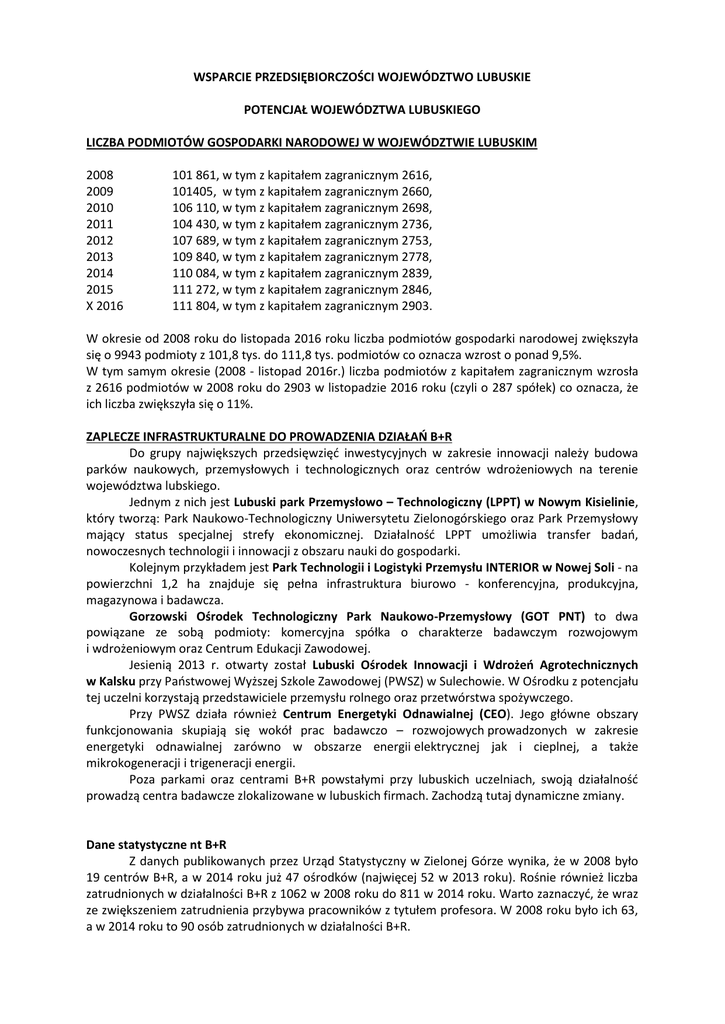 WSPARCIE PRZEDSIĘBIORCZOŚCI WOJEWÓDZTWO LUBUSKIE POTENCJAŁ WOJEWÓDZTWA LUBUSKIEGO LICZBA PODMIOTÓW GOSPODARKI NARODOWEJ W WOJEWÓDZTWIE LUBUSKIM 2008 2009 2010 2011 2012 2013 2014 2015 X 2016 101 861, w tym z kapitałem zagranicznym 2616, 101405, w tym z kapitałem zagranicznym 2660, 106 110, w tym z kapitałem zagranicznym 2698, 104 430, w tym z kapitałem zagranicznym 2736, 107 689, w tym z kapitałem zagranicznym 2753, 109 840, w tym z kapitałem zagranicznym 2778, 110 084, w tym z kapitałem zagranicznym 2839, 111 272, w tym z kapitałem zagranicznym 2846, 111 804, w tym z kapitałem zagranicznym 2903. W okresie od 2008 roku do listopada 2016 roku liczba podmiotów gospodarki narodowej zwiększyła się o 9943 podmioty z 101,8 tys. do 111,8 tys. podmiotów co oznacza wzrost o ponad 9,5%. W tym samym okresie (2008 - listopad 2016r.) liczba podmiotów z kapitałem zagranicznym wzrosła z 2616 podmiotów w 2008 roku do 2903 w listopadzie 2016 roku (czyli o 287 spółek) co oznacza, że ich liczba zwiększyła się o 11%. ZAPLECZE INFRASTRUKTURALNE DO PROWADZENIA DZIAŁAŃ B+R Do grupy największych przedsięwzięć inwestycyjnych w zakresie innowacji należy budowa parków naukowych, przemysłowych i technologicznych oraz centrów wdrożeniowych na terenie województwa lubskiego. Jednym z nich jest Lubuski park Przemysłowo – Technologiczny (LPPT) w Nowym Kisielinie, który tworzą: Park Naukowo-Technologiczny Uniwersytetu Zielonogórskiego oraz Park Przemysłowy mający status specjalnej strefy ekonomicznej. Działalność LPPT umożliwia transfer badań, nowoczesnych technologii i innowacji z obszaru nauki do gospodarki. Kolejnym przykładem jest Park Technologii i Logistyki Przemysłu INTERIOR w Nowej Soli - na powierzchni 1,2 ha znajduje się pełna infrastruktura biurowo - konferencyjna, produkcyjna, magazynowa i badawcza. Gorzowski Ośrodek Technologiczny Park Naukowo-Przemysłowy (GOT PNT) to dwa powiązane ze sobą podmioty: komercyjna spółka o charakterze badawczym rozwojowym i wdrożeniowym oraz Centrum Edukacji Zawodowej. Jesienią 2013 r. otwarty został Lubuski Ośrodek Innowacji i Wdrożeń Agrotechnicznych w Kalsku przy Państwowej Wyższej Szkole Zawodowej (PWSZ) w Sulechowie. W Ośrodku z potencjału tej uczelni korzystają przedstawiciele przemysłu rolnego oraz przetwórstwa spożywczego. Przy PWSZ działa również Centrum Energetyki Odnawialnej (CEO). Jego główne obszary funkcjonowania skupiają się wokół prac badawczo – rozwojowych prowadzonych w zakresie energetyki odnawialnej zarówno w obszarze energii elektrycznej jak i cieplnej, a także mikrokogeneracji i trigeneracji energii. Poza parkami oraz centrami B+R powstałymi przy lubuskich uczelniach, swoją działalność prowadzą centra badawcze zlokalizowane w lubuskich firmach. Zachodzą tutaj dynamiczne zmiany. Dane statystyczne nt B+R Z danych publikowanych przez Urząd Statystyczny w Zielonej Górze wynika, że w 2008 było 19 centrów B+R, a w 2014 roku już 47 ośrodków (najwięcej 52 w 2013 roku). Rośnie również liczba zatrudnionych w działalności B+R z 1062 w 2008 roku do 811 w 2014 roku. Warto zaznaczyć, że wraz ze zwiększeniem zatrudnienia przybywa pracowników z tytułem profesora. W 2008 roku było ich 63, a w 2014 roku to 90 osób zatrudnionych w działalności B+R. Jednostki prowadzące działalność B+R w województwie lubuskim 2008 - 19 (1062 pracowników) 2009 - 17 2010 - 23 2011 - 31 2012 - 37 2013 - 52 2014 - 47 (1088 pracowników) PKB WOJEWÓDZTWA LUBUSKIEGO 2008 - 28,9 mld zł 2009 - 30,4 mld zł 2010 - 32,3 mld zł 2011 - 33,6 mld zł 2012 – 35,7 mld zł 2013 - 36,5 mld zł 2014 - 38,4 mld zł* *Dane szacunkowe: Poziom PKB województwa lubuskiego zwiększył się z 28,9 mld zł w 2008 do 38,3 mld zł. w 2014 roku, co oznacza wzrost o ponad 10 mld złotych. Pomimo tego wzrostu Produkt Krajowy Brutto per capita Polska = 100, oznacza, że województwo lubuskie osiągnęło poziom 84,10% poziomu krajowego, a wartość oczekiwana wynosi 87.5 %. INTELIGENTNE SPECJALIZACJE WOJEWÓDZTWA LUBUSKIEGO W wyniki badań oraz konsultacji wybrano 3 inteligentne specjalizacje w województwie lubuskim, są to: Zielona Gospodarka, Zdrowie i jakość życia, Innowacyjny przemysł. Obejmują one: Zielona Gospodarka – EKOINNOWACJE - Technologie środowiskowe - Biogospodarka - Usługi środowiskowe Branże wspomagające: sektor ICT, przemysł metalowy świadczący usługi dla obszaru technologii i usług środowiskowych, procesy logistyczne. Zdrowie i jakość życia – EKO-ROZWÓJ - Technologie medyczne - Usługi medyczne - Turystyka zdrowotna - Zdrowa, bezpieczna żywność (również produkty regionalne) Branże powiązane: sektor ICT, przemysł metalowy, procesy logistyczne (np. dystrybucja i magazynowanie itp.). Innowacyjny przemysł – ZRÓWNOWAŻONY ROZWÓJ - Przemysł ICT - Przemysł metalowy - Przemysł motoryzacyjny - Przemysł wydobywczy i energetyczny - Przemysł drzewny, meblarski i papierniczy. INICJATYWY WSPIERAJĄCE PRZEDSIĘBIORCZOŚĆ: Konkursy W ramach patronatów WL UMWL od lat wspiera finansowo dwa regionalne konkursy, są to: Lubuski Lider Biznesu oraz Lubuski Mister Budowy. Województwo Lubuskie korzysta z prawa nominowania regionalnych firm do prestiżowych nagród. Dzięki nominacjom WL UMWL w 2015 roku spółka ZUO z Gorzowa Wlkp. wygrała w kategorii Zielona Gospodarka w konkursie Nagroda Gospodarcza Prezydenta RP, a w 2016 roku spółka eobuwie.pl została polskim laureatem konkursu EY Przedsiębiorca Roku. Lubuska Akademia Rozwoju (LAR) W celu wsparcia merytorycznego dla przedstawicieli JST i sfery biznesowej od lipca 2016 do maja 2017 prowadzone są wykłady specjalistów branżowych w ramach Lubuskiej Akademii Rozwoju (LAR). Misją Lubuskiej Akademii Rozwoju (LAR) jest dostarczenie najnowszej wiedzy o teorii i praktyce wynikającej z realizacji Strategii Rozwoju Województwa Lubuskiego oraz płynących z tego tytułu korzyści dla samorządów i prze