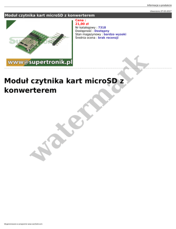 Informacje o produkcie Utworzono 07-03-2017 Moduł czytnika kart microSD z konwerterem Cena : 21,00 zł er m ar k Nr katalogowy : 7318 Dostępność : Dostępny Stan magazynowy : bardzo wysoki Średnia ocena : brak recenzji w at Moduł czytnika kart microSD z konwerterem Wygenerowano w programie www.oscGold.com er m ar k Moduł czytnika kart microSD z konwerterem dane techniczne: ● ● ● ● ● ● ● moduł wyposażony w gniazdo micro SD napięcie zasilania: 5V wbudowany konwerter wbudowany stabilizator 3V3 (LP2985IM5) dioda LED sygnalizująca pracę w zestawie listwa kołkowa 1x7 pin(niewlutowana) możliwość wlutowania listwy kołkowej (po wlutowaniu możliwość podłączenia do płytki stykowej lub przewodów z gniazdami goldpin) lub przewodów współpracuje ze standardową biblioteką Arduino SD library ● ● ● ● ● ● ● w opis wyprowadzeń: at ● CD (card detect)- detekcja karty, w przypadku braku karty w gnieździe pin jest w stanie niskim, gdy karta jest w gnieździe, pin jest w stanie wysokim DO (MISO)- dane wyjściowe w magistrali SPI GND- masa modułu CLK- linia zegarowa magistrali SPI 5 V- napięcie zasilania 5 V DI (MOSI)- dane wejściowe magistrali SPI CS (chip select)- wybór urządzenia w trybie magistrali SPI, do obsługi modułu, należy podać stan niski w at er m ar k Informacje o produkcie Wygenerowano w programie www.oscGold.com