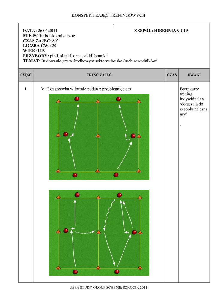 KONSPEKT ZAJĘĆ TRENINGOWYCH 1 DATA: 26.04.2011 ZESPÓŁ: HIBERNIAN U19 MIEJSCE: boisko piłkarskie CZAS ZAJĘĆ: 80’ LICZBA ĆW.: 20 WIEK: U19 PRZYBORY: piłki, słupki, oznaczniki, bramki TEMAT: Budowanie gry w środkowym sektorze boiska /ruch zawodników/ CZĘŚĆ I TREŚĆ ZAJĘĆ Rozgrzewka w formie podań z przebiegnięciem CZAS UWAGI Bramkarze trening indywidualny /dołączają do zespołu na czas gry/ . UEFA STUDY GROUP SCHEME; SZKOCJA 2011 KONSPEKT ZAJĘĆ TRENINGOWYCH Uwagi: II Jakość przyjęć i podań piłki /wszystkie części stopy/ Kierunek, siła podania Przyjęcie piłki ze zmianą kierunku Ustawienia /pozycja ciała/ Podania z przebiegnięciem i bez przebiegnięciem III Podania piłki na drugą stronę poprzez czterech zawodników w środku wyznaczonego pola gry – środkowych pomocników Wymiana podań poprzedzona ruchem czwórki pomocników /tak, aby końcowe ustawienie było zbliżone do ustawienie w grze: 1-2-1 lub 2-2 Rotacja zawodników w środku boiska, Odpowiednia kolejność podań /podania + podanie zwrotne/ maksymalna liczba dwóch kontaktów z piłką Płynność ruchu zawodników UEFA STUDY GROUP SCHEME; SZKOCJA 2011 KONSPEKT ZAJĘĆ TRENINGOWYCH Gra 10x10+1 zawodnik neutralny w strefie środkowej Ustawienie zespołów: 1-4-3-2 Wyprowadzenie piłki ze strefy obrony przez strefę środkową /poprzedzony nauczanym w części głównej ruchem zawodników/ Ustawienie w środkowej strefie 2-2 lub 1-2-1 Budowanie akcji – długie utrzymanie się przy piłce, zmiana tempa Płynność przechodzenie z atakowania do bronienia i odwrotnie Możliwość włączenia się bocznych obrońców w akcję ofensywną Po wprowadzeniu piłki w strefę ataku zawodnicy ze środkowej strefy mogą wbiegać w strefę ataku (gra 6x2), jeden zawodnik ze strefy środkowej zostaje zawsze w tej strefie. UEFA STUDY GROUP SCHEME; SZKOCJA 2011