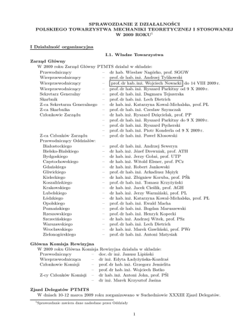 SPRAWOZDANIE Z DZIAŁALNOŚCI POLSKIEGO TOWARZYSTWA MECHANIKI TEORETYCZNEJ I STOSOWANEJ W 2009 ROKU1 I Działalność organizacyjna I.1. Władze Towarzystwa Zarząd Główny W 2009 roku Zarząd Główny PTMTS działał w składzie: Przewodniczący – dr hab. Wiesław Nagórko, prof. SGGW Wiceprzewodniczący – prof. dr hab. inż. Andrzej Tylikowski Wiceprzewodniczący – prof. dr hab. inż. Wojciech Nowacki do 14 VIII 2009 r. Wiceprzewodniczący – prof. dr hab. inż. Ryszard Parkitny od 9 X 2009 r. Sekretarz Generalny – prof. dr hab. inż. Dagmara Tejszerska Skarbnik – prof. dr hab. inż. Lech Dietrich Z-ca Sekretarza Generalnego – dr hab. inż. Katarzyna Kowal-Michalska, prof. PŁ Z-ca Skarbnika – prof. dr hab. inż. Czesław Szymczak Członkowie Zarządu – dr hab. inż. Ryszard Dzięcielak, prof. PP – prof. dr hab. inż. Ryszard Parkitny do 9 X 2009 r. – prof. dr hab. inż. Ryszard Pęcherski – prof. dr hab. inż. Piotr Konderla od 9 X 2009 r. Z-ca Członków Zarządu – prof. dr hab. inż. Paweł Kłosowski Przewodniczący Oddziałów: Białostockiego – prof. dr hab. inż. Andrzej Seweryn Bielsko-Bialskiego – dr hab. inż. Józef Drewniak, prof. ATH Bydgoskiego – dr hab. inż. Jerzy Gołaś, prof. UTP Częstochowskiego – dr hab. inż. Witold Elsner, prof. PCz Gdańskiego – dr hab. inż. Robert Jankowski Gliwickiego – prof. dr hab. inż. Arkadiusz Mężyk Kieleckiego – dr hab. inż. Zbigniew Koruba, prof. PŚk Koszalińskiego – prof. dr hab. inż. Tomasz Krzyżyński Krakowskiego – dr hab. inż. Jacek Cieślik, prof. AGH Lubelskiego – dr hab. inż. Jerzy Warmiński, prof. PL Łódzkiego – dr hab. inż. Katarzyna Kowal-Michalska, prof. PŁ Opolskiego – prof. dr hab. inż. Ewald Macha Poznańskiego – prof. dr hab. inż. Bogdan Maruszewski Rzeszowskiego – prof. dr hab. inż. Henryk Kopecki Szczecińskiego – dr hab. inż. Andrzej Witek, prof. PSz Warszawskiego – prof. dr hab. inż. Lech Dietrich Wrocławskiego – dr hab. inż. Marek Gawliński, prof. PWr Zielonogórskiego – prof. dr hab. inż. Antoni Matysiak Główna Komisja Rewizyjna W 2009 roku Główna Komisja Rewizyjna działała w składzie: Przewodniczący – doc. dr inż. Janusz Lipiński Wiceprzewodnicząca – dr inż. Edyta Ładyżyńska-Kozdraś Członkowie Komisji – prof. dr hab. inż. Grzegorz Jemielita – prof. dr hab. inż. Wojciech Batko Z-cy Członków Komisji – dr hab. inż. Antoni John, prof. PŚl – dr inż. Marek Krzysztof Jasina Zjazd Delegatów PTMTS W dniach 10-12 marca 2009 roku zorganizowano w Suchedniowie XXXIII Zjazd Delegatów. 1 Sprawozdanie zawiera dane nadesłane przez Oddziały 1 Zebrania plenarne ZG PTMTS Odbyły się 4 zebrania plenarne Zarządu Głównego: 30 stycznia, 10 marca, 22 maja i 9 października. Zebrania Prezydium ZG PTMTS W Warszawie odbyły się 3 zebrania Prezydium: 30 stycznia, 22 maja i 9 października. Zebrania Walne w Oddziałach Białostockim: 10 XII (2008), Bielsko-Bialskim: 23 I, Bydgoskim: 13 I, Częstochowskim: 26 I, Gdańskim: 12 I, Gliwickim: 29 I. Kieleckim: 28 I, Koszalińskim: 13 I, Krakowskim: 23 I, Lubelskim: 5 I, Łódzkim: 7 I, Opolskim: 15 I, Poznańskim: 12 I, Rzeszowskim: 10 I, Szczecińskim: 22 I, Warszawskim: 19 I, Wrocławskim: 22 I, Zielonogórskim: 21 I. Zebrania Zarządów Oddziałów W Oddziałach Towarzystwa odbyło się 67 zebrań organizacyjnych (wyszczególnienie podano w załączniku nr 1). I.2. Członkowie Towarzystwa Na koniec 2009 roku Towarzystwo liczyło 951 członków zrzeszonych w 18 Oddziałach terenowych, w tym: • 25 Członków Honorowych • 41 członków zagranicznych Ponadto do Towarzystwa należy 16 członków wspierających. Liczbę członków w poszczególnych Oddziałach podano w załączniku nr 1. I.3. Ważniejsze uchwały i zalecenia organów statutowych Towarzystwa XXXIII Zjazd Delegatów PTMTS • Wybrał nowe władze PTMTS na XXXIV kadencję 2009-2010 (patrz p. I.1). • Wybrał nowych członków Głównej Komisji Rewizyjnej na XXXIV kadencję 2009-2010 (patrz p. I.1). • Nadał godność Członka Honorowego Polskiego Towarzystwa Mechaniki Teoretycznej i Stosowanej pięciu członkom. Nowi Członkowie Honorowi to: prof. prof. prof. prof. prof. Eugeniuszowi Dembickiemu (Oddział Gdański) Bolesławowi Mazurkiewiczowi (Oddział Gdański) Józefowi Kubikowi (Oddział Poznański) Karolowi Grudzińskiemu (Oddział Szczeciński) Emmanuelowi Gdoutosowi (Grecja, Oddział Warszawski) • Odznaczył wyróżniających się członków PTMTS Złotą i Srebrną Odznaką Zasłużony dla Polskiego Towarzystwa Mechaniki Teoretycznej i Stosowanej. Złote Odznaki otrzymali: 1. 2. 3. 4. 5. 6. 7. 8. 9. 10. Czech Michał – Oddział Białostocki Gierulski Wacław – Oddział Kielecki Gołaś Jerzy – Oddział Bydgoski Holka Henryk – Oddział Bydgoski Kasprzyk Stanisław – Oddział Krakowski Kurnik Włodzimierz – Oddział Warszawski Maciąg Edward – Oddział Krakowski Miedziałowski Czesław – Oddział Białostocki Pęcherski Ryszard – Oddział Krakowski Szabelski Kazimierz – Oddział Lubelski 2 11. Uhl Tadeusz – Oddział Krakowski 12. Wydział Mechaniczny Technologiczny Politechniki Śląskiej Srebrne Odznaki otrzymali: 1. 2. 3. 4. 5. 6. 7. 8. 9. 10. 11. 12. 13. Glabisz Wojciech – Oddział Wrocławski Grochowska Elżbieta – Oddział Zielonogórski Kroczak Stanisław – Oddział Wrocławski Lysik Bertold – Oddział Wrocławski Marcinowski Jakub – Oddział Zielonogórski Mazur Stanisław – Oddział Zielonogórski Sadowski Jan – Oddział Bydgoski Sobich Jerzy – Oddział Zielonogórski Stricker Leszek – Oddział Wrocławski Sysak Zdzisław – Oddział Wrocławski Uścinowicz Robert – Oddział Białostocki Werszko Mirosław – Oddział Wrocławski Żukowski Stanisław – Oddział Wrocławski • Realizował zalecenia XXXII Zjazdu Delegatów PTMTS, m.in. poprzez: – dołączenie do materiałów zjazdowych szczegółowej, imiennej listy delegatów, z podaniem 