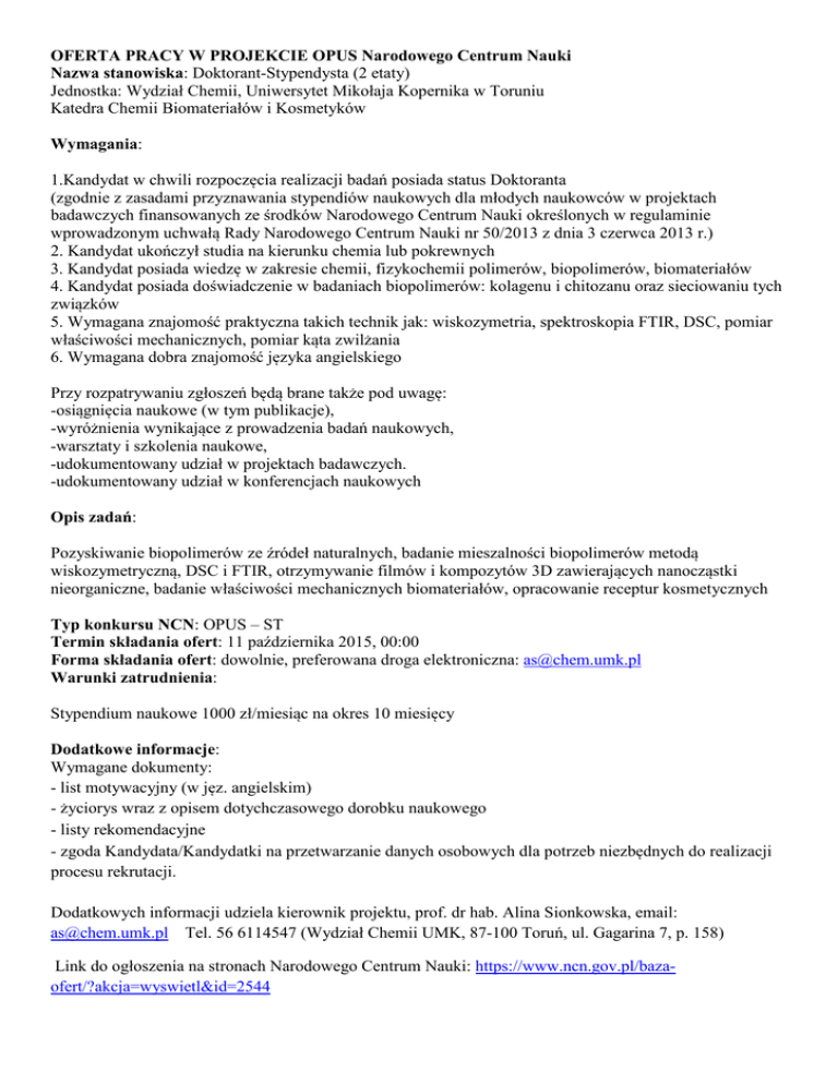 OFERTA PRACY W PROJEKCIE OPUS Narodowego Centrum Nauki Nazwa stanowiska: Doktorant-Stypendysta (2 etaty) Jednostka: Wydział Chemii, Uniwersytet Mikołaja Kopernika w Toruniu Katedra Chemii Biomateriałów i Kosmetyków Wymagania: 1.Kandydat w chwili rozpoczęcia realizacji badań posiada status Doktoranta (zgodnie z zasadami przyznawania stypendiów naukowych dla młodych naukowców w projektach badawczych finansowanych ze środków Narodowego Centrum Nauki określonych w regulaminie wprowadzonym uchwałą Rady Narodowego Centrum Nauki nr 50/2013 z dnia 3 czerwca 2013 r.) 2. Kandydat ukończył studia na kierunku chemia lub pokrewnych 3. Kandydat posiada wiedzę w zakresie chemii, fizykochemii polimerów, biopolimerów, biomateriałów 4. Kandydat posiada doświadczenie w badaniach biopolimerów: kolagenu i chitozanu oraz sieciowaniu tych związków 5. Wymagana znajomość praktyczna takich technik jak: wiskozymetria, spektroskopia FTIR, DSC, pomiar właściwości mechanicznych, pomiar kąta zwilżania 6. Wymagana dobra znajomość języka angielskiego Przy rozpatrywaniu zgłoszeń będą brane także pod uwagę: -osiągnięcia naukowe (w tym publikacje), -wyróżnienia wynikające z prowadzenia badań naukowych, -warsztaty i szkolenia naukowe, -udokumentowany udział w projektach badawczych. -udokumentowany udział w konferencjach naukowych Opis zadań: Pozyskiwanie biopolimerów ze źródeł naturalnych, badanie mieszalności biopolimerów metodą wiskozymetryczną, DSC i FTIR, otrzymywanie filmów i kompozytów 3D zawierających nanocząstki nieorganiczne, badanie właściwości mechanicznych biomateriałów, opracowanie receptur kosmetycznych Typ konkursu NCN: OPUS – ST Termin składania ofert: 11 października 2015, 00:00 Forma składania ofert: dowolnie, preferowana droga elektroniczna: [email protected] Warunki zatrudnienia: Stypendium naukowe 1000 zł/miesiąc na okres 10 miesięcy Dodatkowe informacje: Wymagane dokumenty: - list motywacyjny (w jęz. angielskim) - życiorys wraz z opisem dotychczasowego dorobku naukowego - listy rekomendacyjne - zgoda Kandydata/Kandydatki na przetwarzanie danych osobowych dla potrzeb niezbędnych do realizacji procesu rekrutacji. Dodatkowych informacji udziela kierownik projektu, prof. dr hab. Alina Sionkowska, email: [email protected] Tel. 56 6114547 (Wydział Chemii UMK, 87-100 Toruń, ul. Gagarina 7, p. 158) Link do ogłoszenia na stronach Narodowego Centrum Nauki: https://www.ncn.gov.pl/bazaofert/?akcja=wyswietl&id=2544