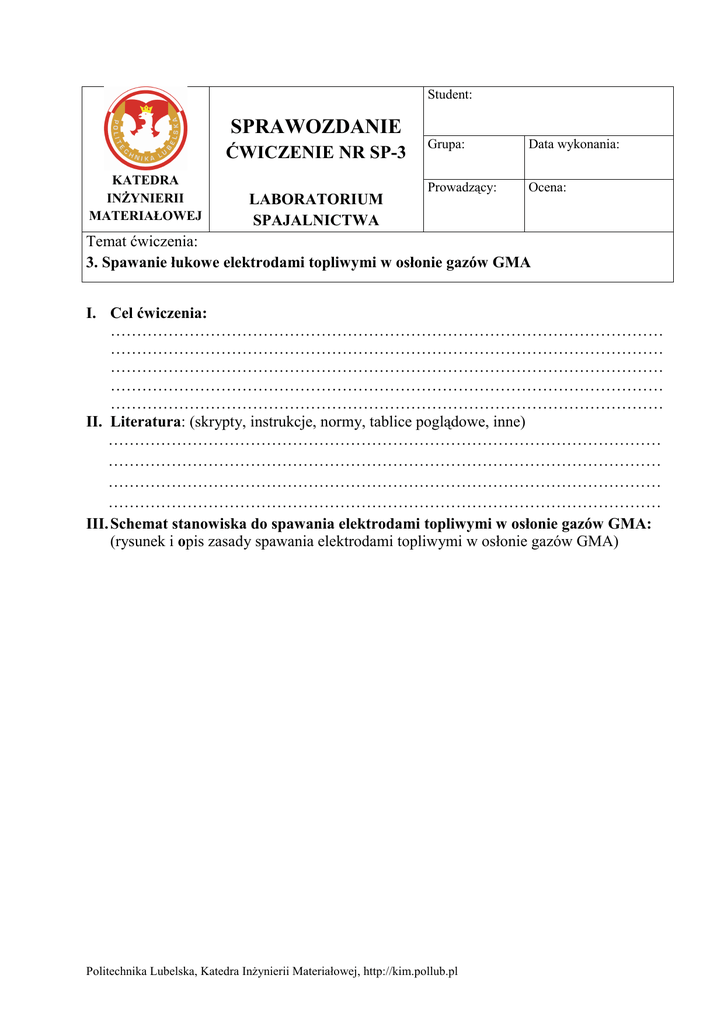 Student: SPRAWOZDANIE ĆWICZENIE NR SP-3 KATEDRA INŻYNIERII MATERIAŁOWEJ LABORATORIUM SPAJALNICTWA Grupa: Data wykonania: Prowadzący: Ocena: Temat ćwiczenia: 3. Spawanie łukowe elektrodami topliwymi w osłonie gazów GMA I. Cel ćwiczenia: …………………………………………………………………………………………… …………………………………………………………………………………………… …………………………………………………………………………………………… …………………………………………………………………………………………… …………………………………………………………………………………………… II. Literatura: (skrypty, instrukcje, normy, tablice poglądowe, inne) …………………………………………………………………………………………… …………………………………………………………………………………………… …………………………………………………………………………………………… …………………………………………………………………………………………… III. Schemat stanowiska do spawania elektrodami topliwymi w osłonie gazów GMA: (rysunek i opis zasady spawania elektrodami topliwymi w osłonie gazów GMA) Politechnika Lubelska, Katedra Inżynierii Materiałowej, http://kim.pollub.pl …………………………………………………………………………………………… …………………………………………………………………………………………… …………………………………………………………………………………………… …………………………………………………………………………………………… …………………………………………………………………………………………… …………………………………………………………………………………………… …………………………………………………………………………………………… …………………………………………………………………………………………… …………………………………………………………………………………………… …………………………………………………………………………………………… IV. Charakterystyka statyczna łuku elektrycznego: V. Właściwości łuku elektrycznego: …………………………………………………………………………………………… …………………………………………………………………………………………… …………………………………………………………………………………………… …………………………………………………………………………………………… …………………………………………………………………………………………… …………………………………………………………………………………………… …………………………………………………………………………………………… © Copyright by M. Szala, A. Tokarski, Lublin University of Technology, 2011 2 VI. Parametry spawania GMA zastosowane w ćwiczeniu: Nazwa i typ urządzenia Elektroda nazwa i typ Gaz osłonowy Ciśnienie robocze gazu Natężenie prądu /A/ Napięcie prądu /V/ Posuw drutu /m.min/ Pozycja spawania Nazwa spoiny Gatunek spawanej stali Grubość spawanej stali VII. Rysunek i opis wykonanego złącza spawanego: (zwymiarowany rysunek wykonanego złącza, opis zaobserwowanych wad spawalniczych, SWC) …………………………………………………………………………………………… ………………………………………………………………………………....………… …………………………………………………………………………………………… …………………………………………………………………………………………… …………………………………………………………………………………………… …………………………………………………………………………………………… …………………………………………………………………………………………… © Copyright by M. Szala, A. Tokarski, Lublin University of Technology, 2011 3 VIII. Wnioski: (wpływ zastosowanych parametrów spawania na jakość złącza, wpływ natężenia prądu na właściwości łączonych materiałów, SWC, charakterystyka wykonanego połączenia a dane literaturowe, porównanie wartości zastosowanych parametrów spawania z wartościami wyznaczonymi teoretycznie) …………………………………………………………………………………………… …………………………………………………………………………………………… …………………………………………………………………………………………… …………………………………………………………………………………………… …………………………………………………………………………………………… …………………………………………………………………………………………… …………………………………………………………………………………………… …………………………………………………………………………………………… …………………………………………………………………………………………… …………